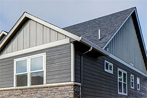 The vertical lines of board and batten siding make a statement. It looks great on rural styles, because it has a history of being used on barns and farm houses, but other types of architecture also make good use of it. Homes with Craftsman characteristics often use board and batten siding as part of an eclectic scheme that shows off a range of materials or simply to accent gables. Due to the lengthening effect of vertical striping, this is a good choice for any part of the home that you want to seem more lofty; even some modern architecture uses it on multi-level construction projects, where lap or stone siding is chosen for the one-story section and board and batten accentuates the two-story portion.