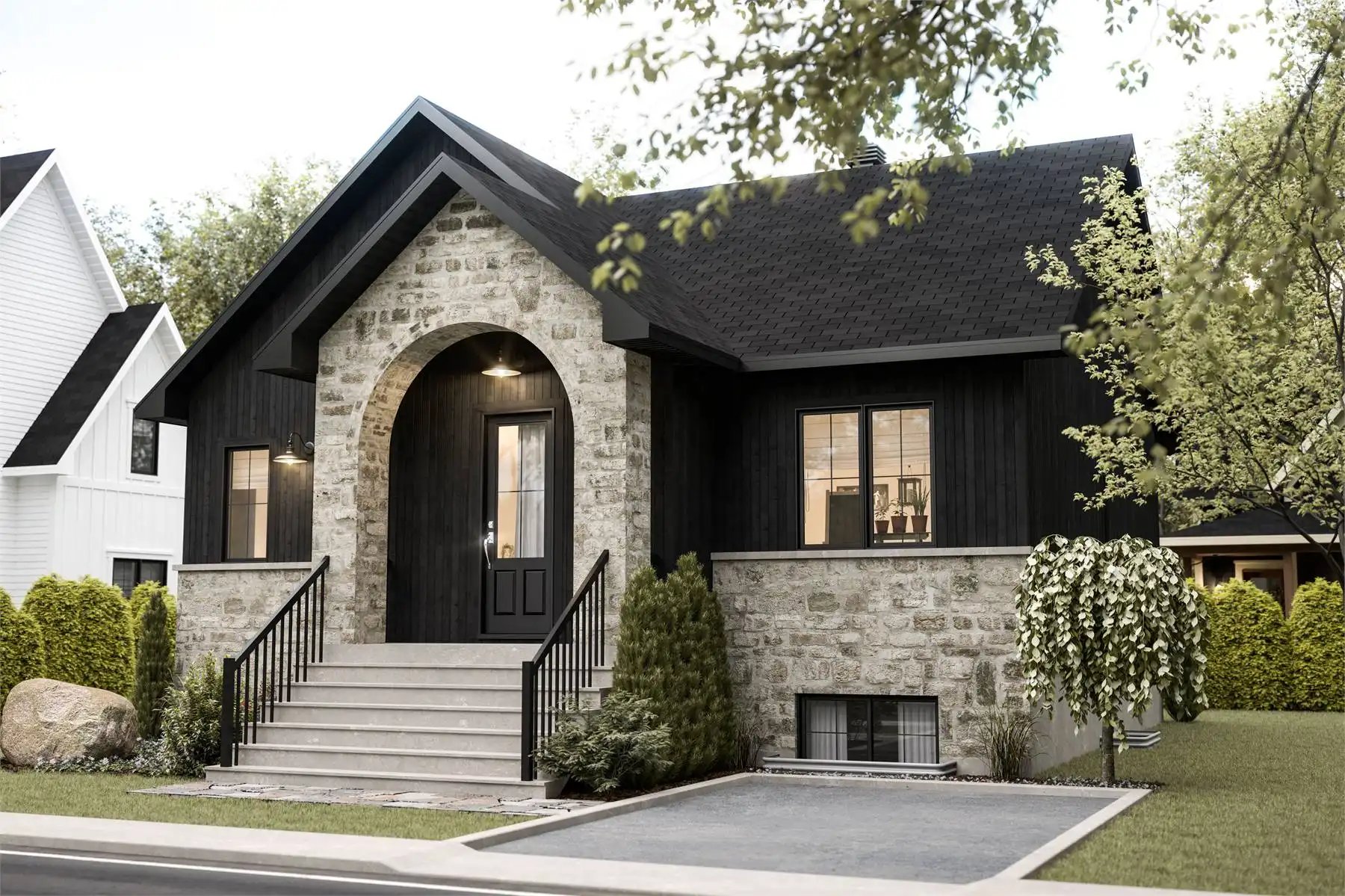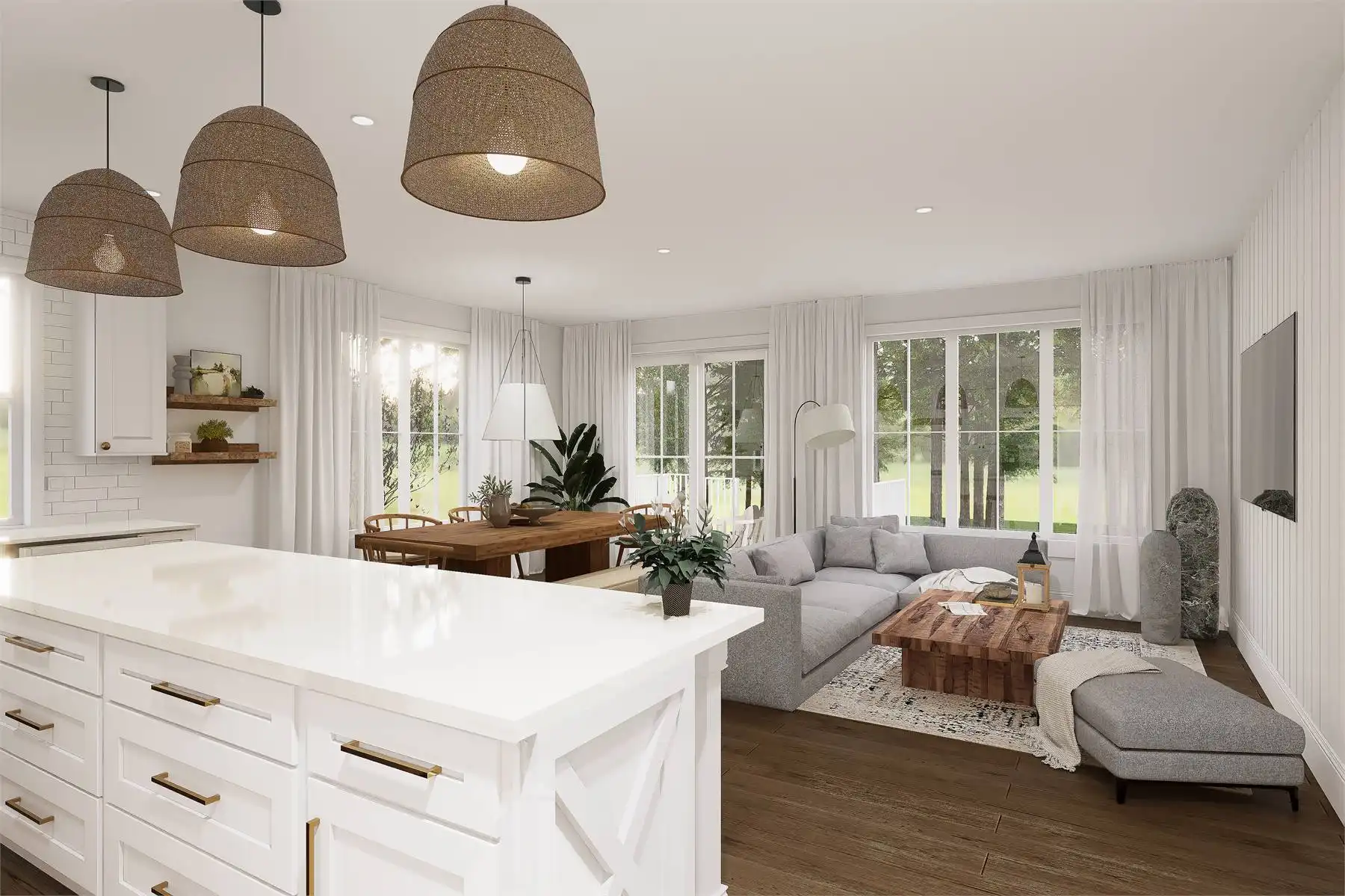 House Plan 10001 is a lovely inverted design similar to a bi-level layout with 2,334 square feet, four bedrooms, and two bathrooms. The main level includes the foyer, open living with an island kitchen, two bedrooms, and a bathroom with a laundry chute. Downstairs, there's a family room, two bedrooms, and a bathroom with attached laundry. This comes wrapped up in chic transitional style!