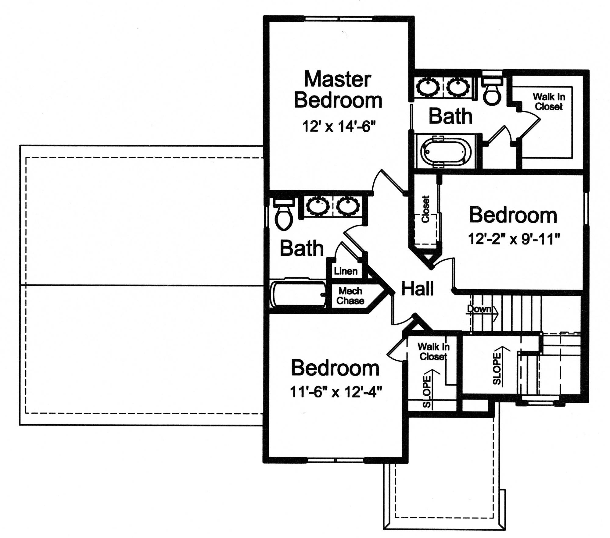 Check out House Plan 10015 if you need a modestly sized traditional home for your family! This design offers 1,684 square feet with three bedrooms and two-and-a-half bathrooms across two levels. The main level features a foyer, powder room, and laundry in front while the G-shaped peninsula kitchen, dining space, and great room with a corner fireplace are in back. The two-car garage also connects to the interior by the laundry and kitchen for convenience. Upstairs, you'll find all three bedrooms. The primary suite has a four-piece bath and a walk-in closet while the other bedrooms share a four-piece hall bath.