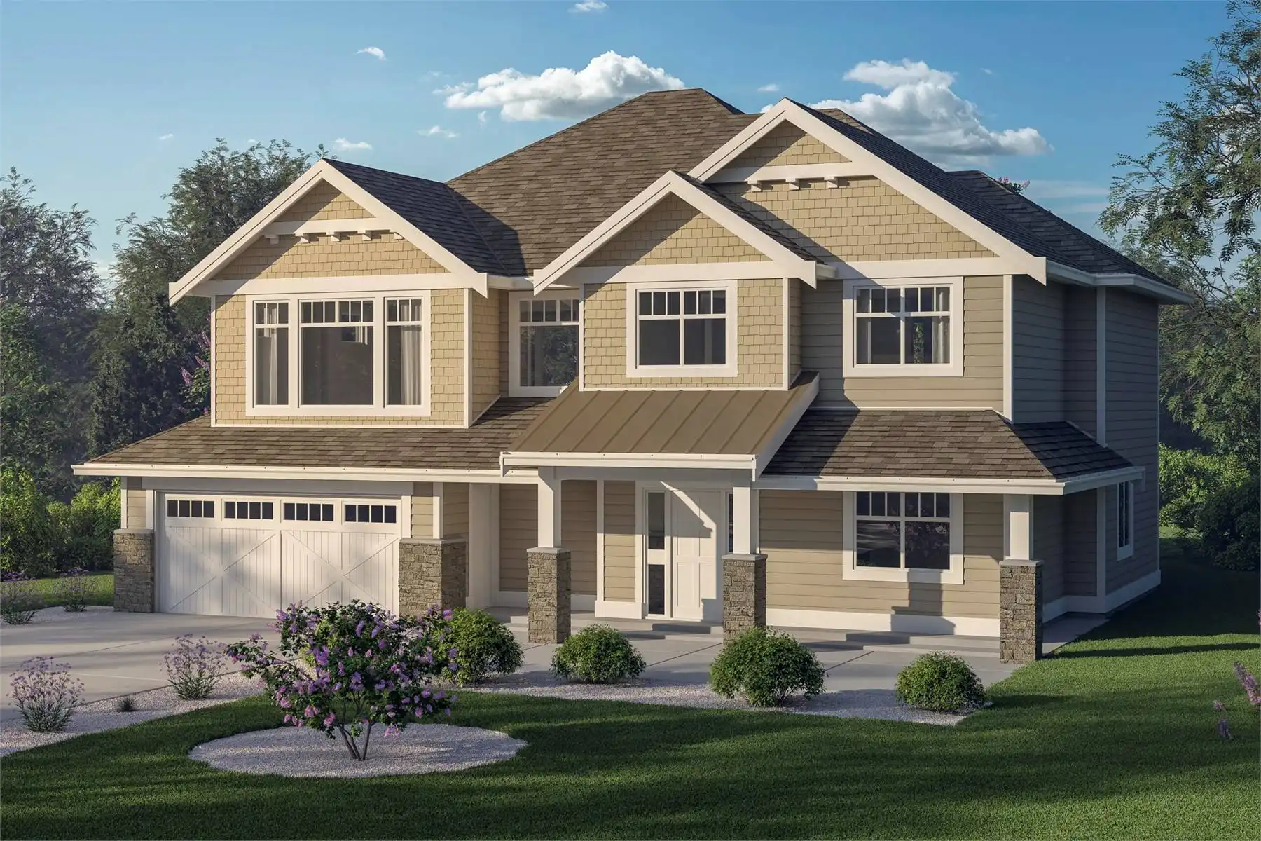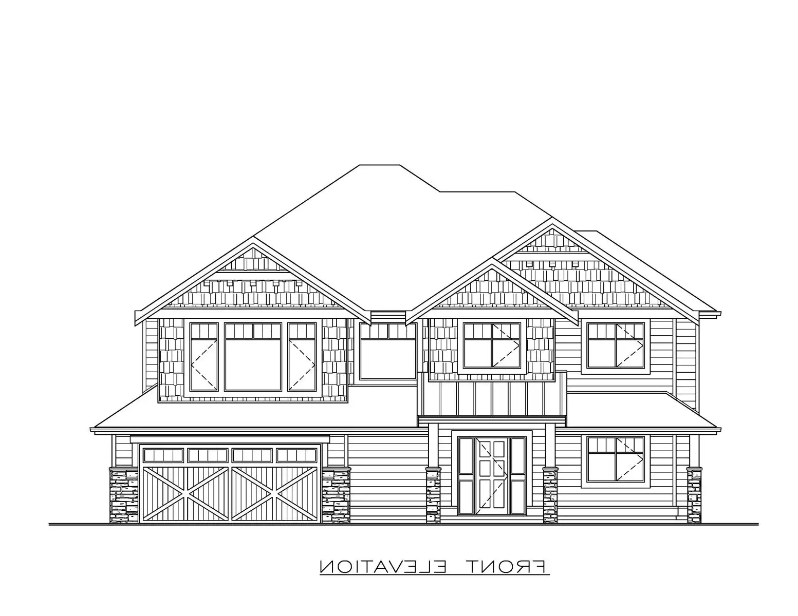 House Plan 10021 is a 1,558-square-foot, two-story home blending traditional charm with modern functionality. The exterior features decorative gables, wood pilasters with brick bases, and ornamental shingles. Inside, the main floor includes a welcoming foyer, home office, and an open-concept great room with a gas fireplace, dining area, and kitchen with a work island and pantry. The private primary suite boasts a walk-in closet, luxurious en-suite, and balcony, while two upper bedrooms share a bathroom. The unfinished basement offers potential for a separate suite with its own entry and patio, adding flexibility and value.