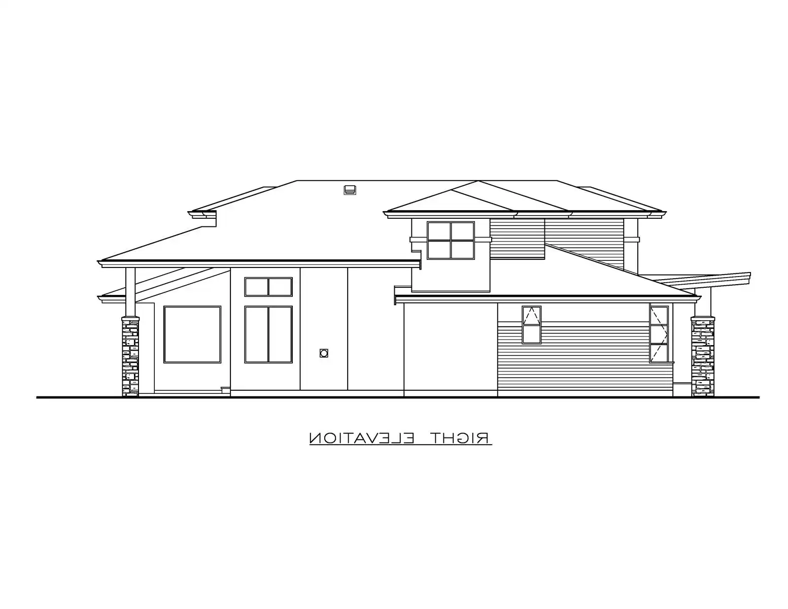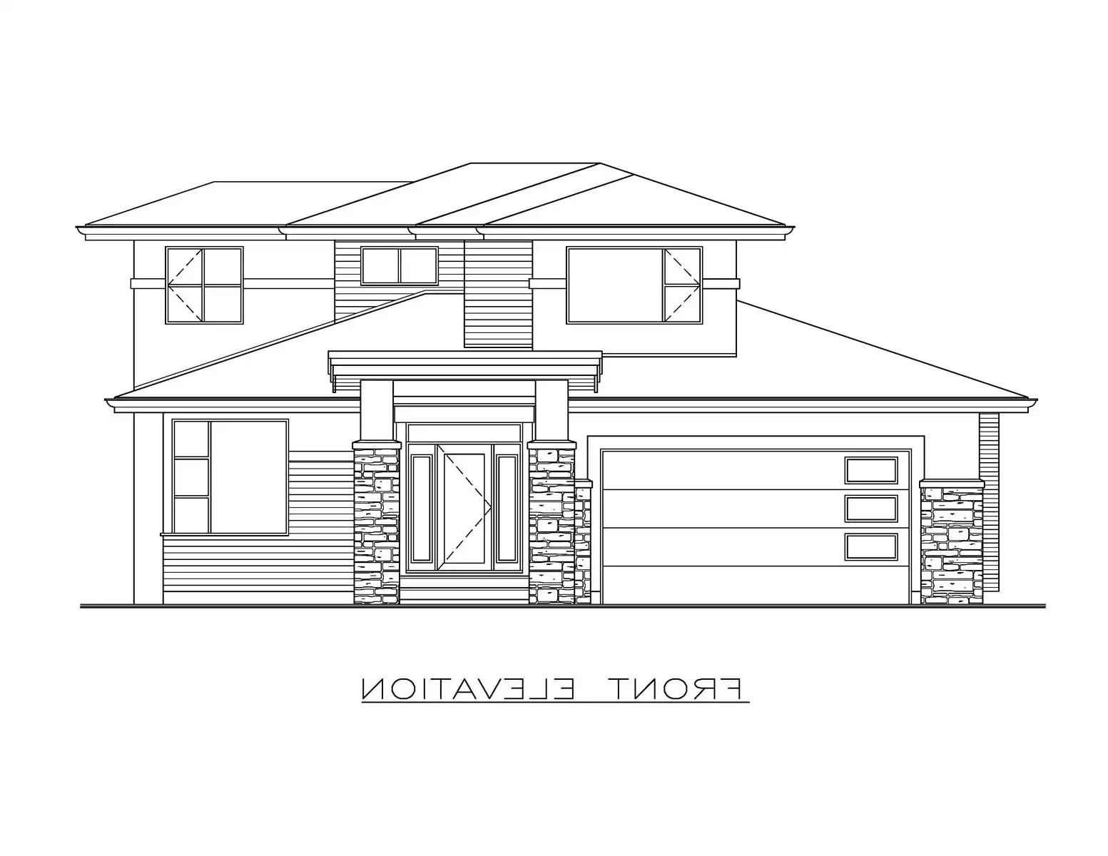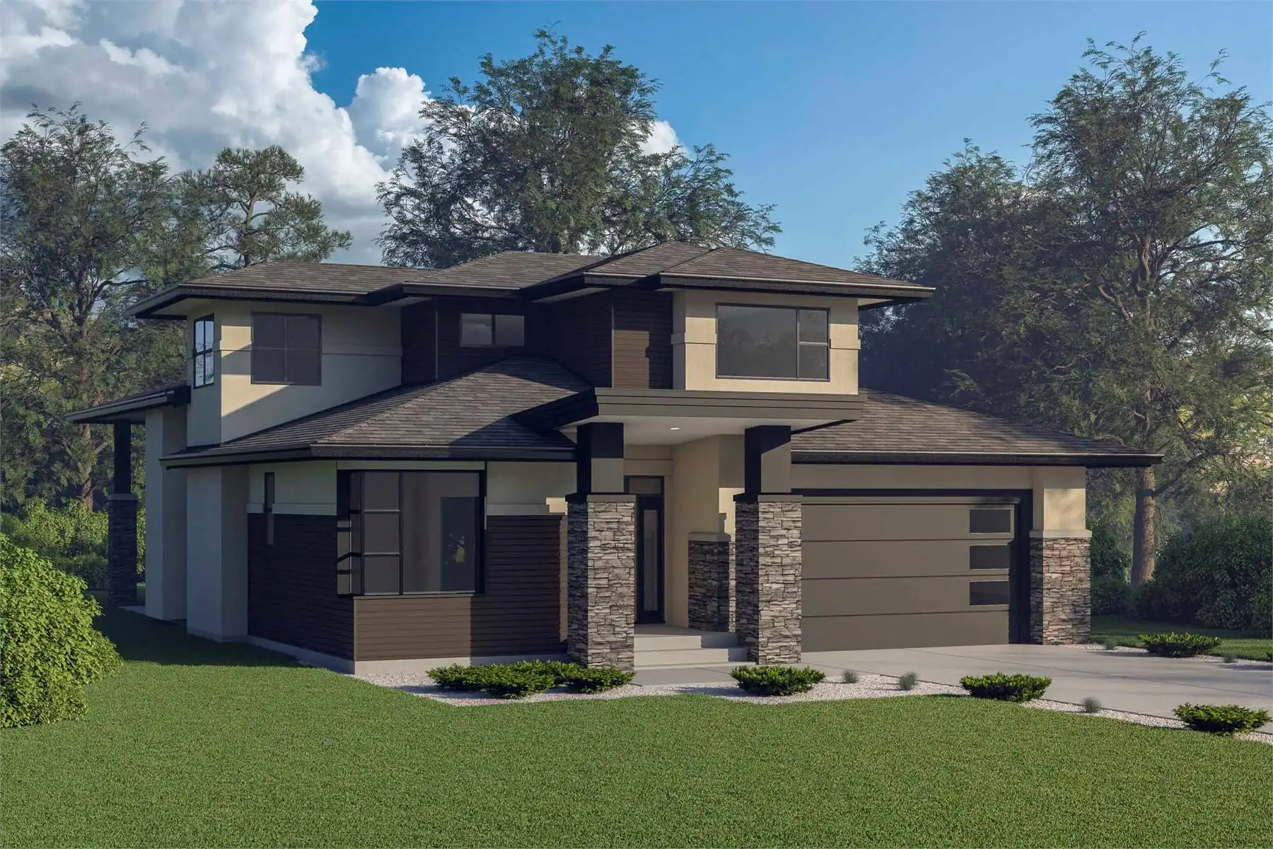 House Plan 10023, at 2,453 square feet, offers elegant living across 1-1/2 stories. Wide stone pilasters, stucco, and horizontal siding lend impressive curb appeal. Inside, a double-height foyer leads to a home office-ready den and a convenient powder room. The open-concept great room, kitchen, and dining area feature a gas fireplace and sliding doors to a covered patio. A walk-through pantry connects the kitchen to the laundry room and double garage. The main-floor primary suite includes a luxurious en-suite with a soaker tub, double sinks, and a walk-in closet. Upstairs, two secondary bedrooms with private baths and a lofted view enhance this thoughtfully designed family home.