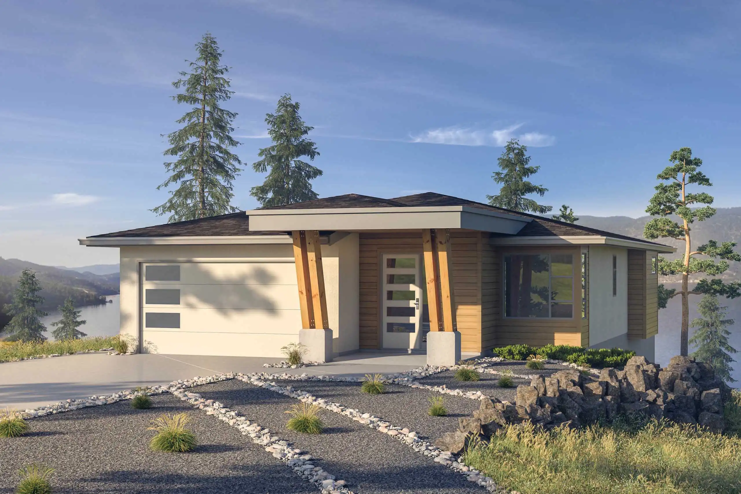 With 1,550 square feet including open-concept living, two bedrooms, and two bathrooms on the main level plus an unfinished basement with even more potential, House Plan 10026 is perfect for everybody from first-time owners and downsizers to growing families looking to expand in the future. The compact layout places in the garage in front to shield the great room from the street. And don't miss the covered porch that extends usable square footage out into the fresh air! Both bedrooms are in the side hallway, with the primary suite in back and the other bedroom in front. Just imagine taking in the views in this little home!
