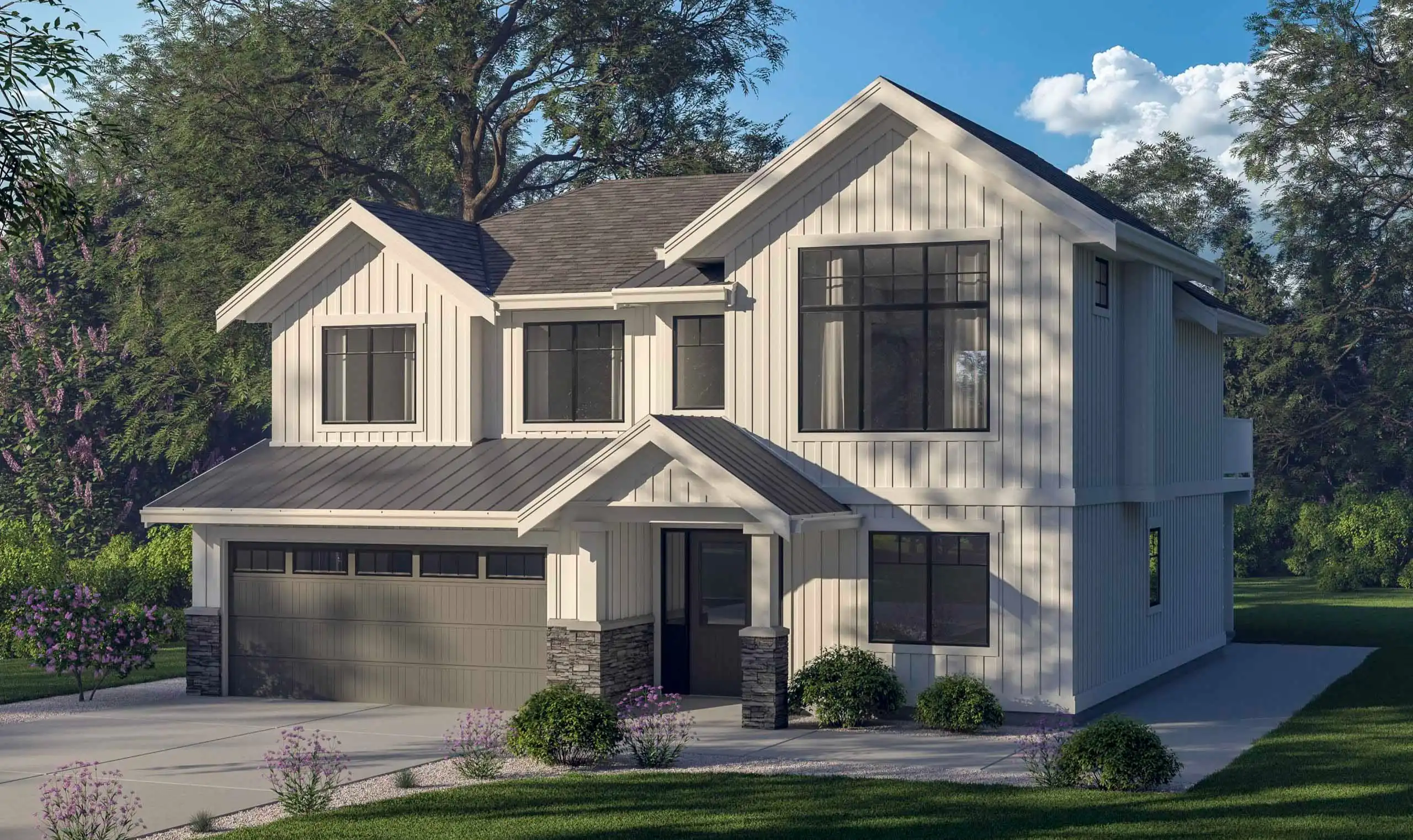 This charming two-story home features a multi-gabled roofline and an unfinished basement, perfect for a future in-law suite or rental space. The main floor offers a den, ideal for a home office, and an open kitchen, dining, and great room with a vaulted ceiling and cozy gas fireplace. The primary suite includes a walk-in closet and ensuite, while two secondary bedrooms share a full bath. A sundeck off the dining room makes outdoor living easy. Stylish details like brick accents and vertical siding complete the look. Measuring 38’x38’, this home has 1,200 sq. ft. on the main floor, excluding the basement.