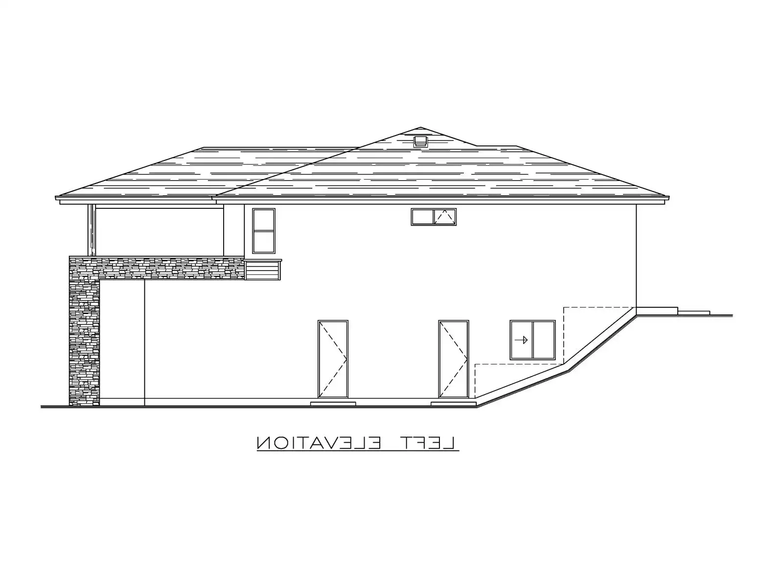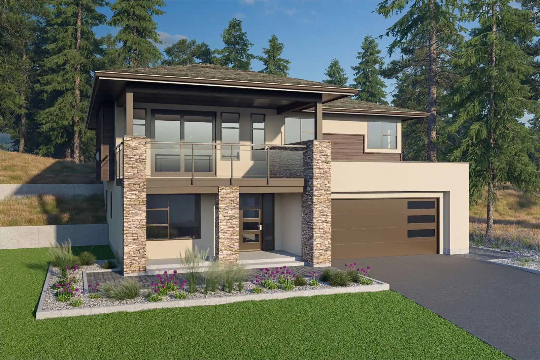 House Plan 10041 is a modern three-bedroom home designed for both style and functionality. A charming covered entrance, accented by brick pilasters, leads into a welcoming foyer with a den that’s perfect for a home office. The main floor’s centerpiece is the great room, featuring a coffered ceiling, a cozy gas fireplace with built-in shelving, and sliding doors to a covered deck with a glass railing. The kitchen, equipped with a prep island and pantry, overlooks the patio and backyard, while the dining area provides easy access to outdoor dining spaces. The private primary suite offers peaceful garden views, an ensuite with dual sinks and a shower, and convenient nearby linen storage. Two additional bedrooms share a three-piece bath and overlook the double garage. On the lower level, a two-bedroom unfinished suite with roughed-in plumbing offers plenty of potential. The exterior showcases a blend of brick, stucco, and horizontal siding, creating a timeless yet contemporary appeal.