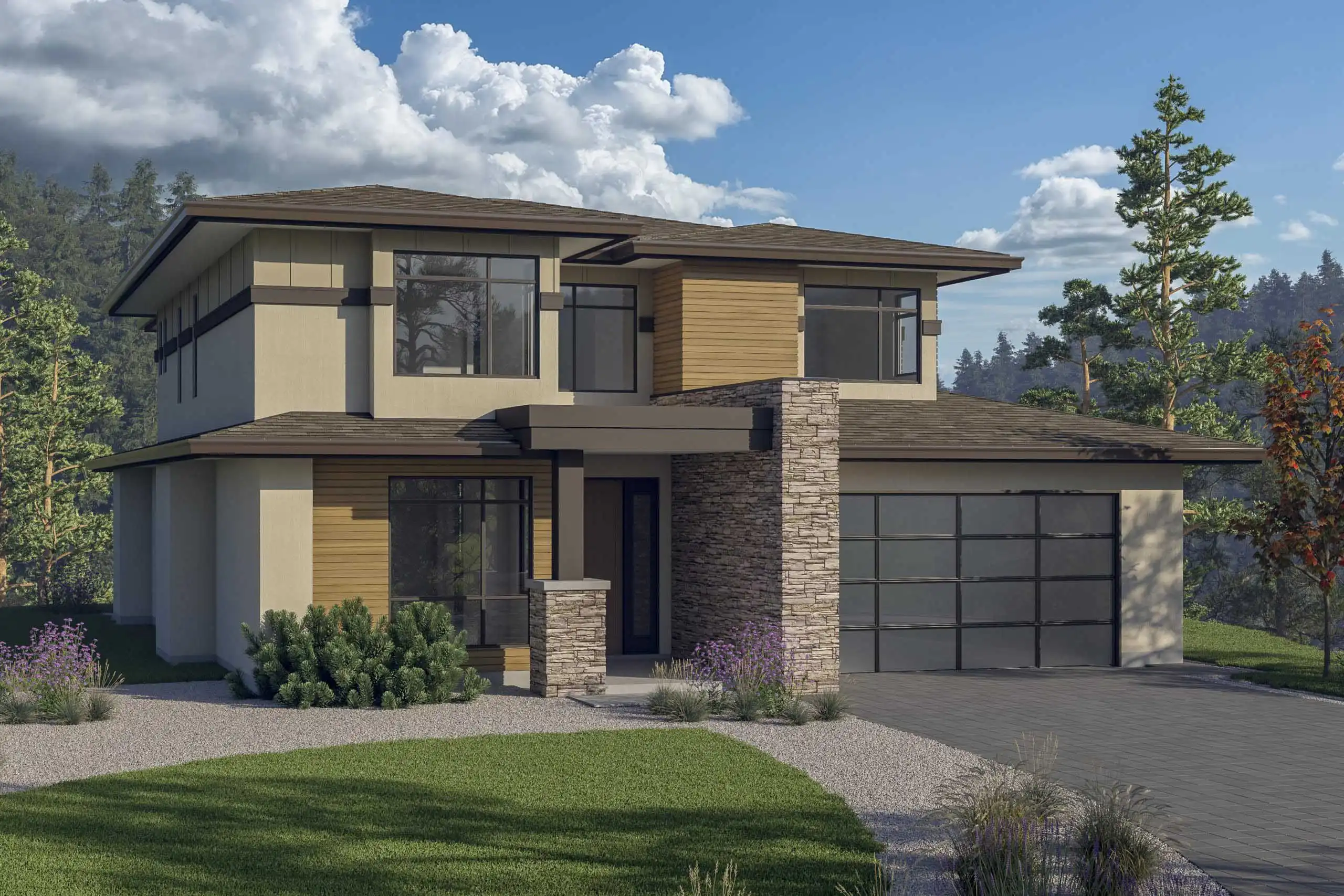 This 2,672 sq. ft. modern home combines clean lines, open spaces, and smart design for a stylish yet functional living experience. Featuring four bedrooms and a flexible fifth bedroom or den, this layout adapts to your needs, whether you need a guest room, home office, or creative space. The main floor boasts an open-concept design, seamlessly connecting the kitchen, dining area, and great room, with large windows bringing in plenty of natural light. Step outside onto the covered sundeck, perfect for relaxing or entertaining. Upstairs, the primary suite offers a luxurious en-suite with a soaking tub and a generous walk-in closet, while three additional bedrooms and a loft provide plenty of room for the whole family. A second-floor laundry room adds everyday convenience. Plus, the unfinished basement gives you the flexibility to customize and expand your living space as needed. With an attached two-car garage and a built-in shop area, this home is designed for both style and practicality.