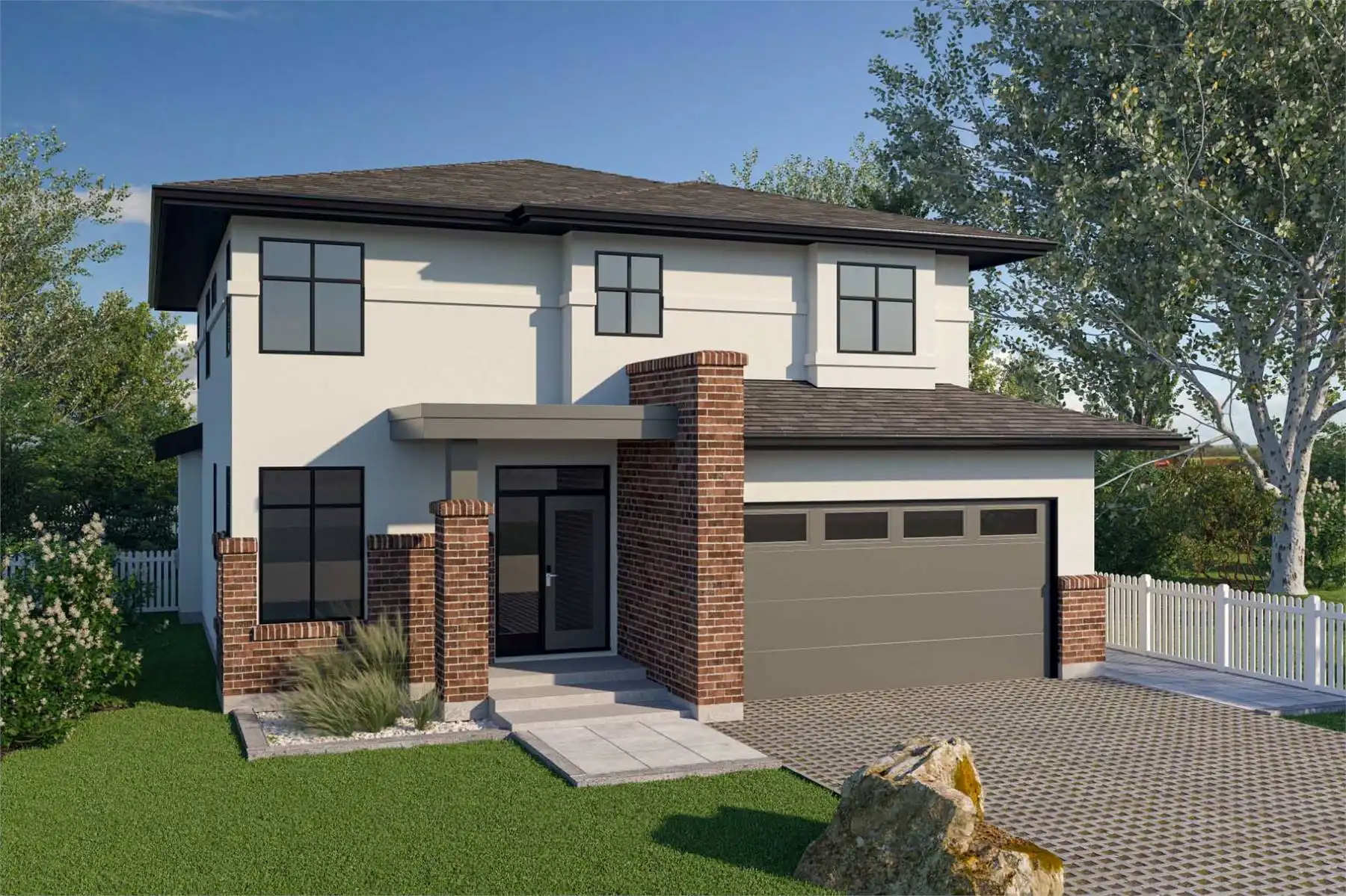 House Plan 10050 offers 2,203 square feet of well-designed family living with plenty of space to grow, including an unfinished basement ready for a future secondary suite. A charming covered entry welcomes you directly into the great room, where a cozy gas fireplace and open sightlines to the dining area and kitchen create a warm, inviting atmosphere. The dining room features a built-in buffet and opens to a partly-covered backyard patio, while the kitchen’s L-shaped layout, central island, pantry, and garden-facing sink make it both beautiful and functional. A mudroom with built-in bench and cubbies, laundry room, powder room, and coat closet add practical touches on the main floor, along with access to the double garage. Upstairs, the private master suite includes a sitting area, a spa-like ensuite with soaker tub and glassed-in shower, and a generous walk-in closet. Two additional bedrooms share a three-piece bathroom, while a versatile bonus room—ideal as a fourth bedroom or family space—opens onto a sunny sundeck. With stylish finishes like stucco, horizontal siding, brick pilasters, and mullioned windows, House Plan 10050 blends curb appeal and functionality for modern family life.