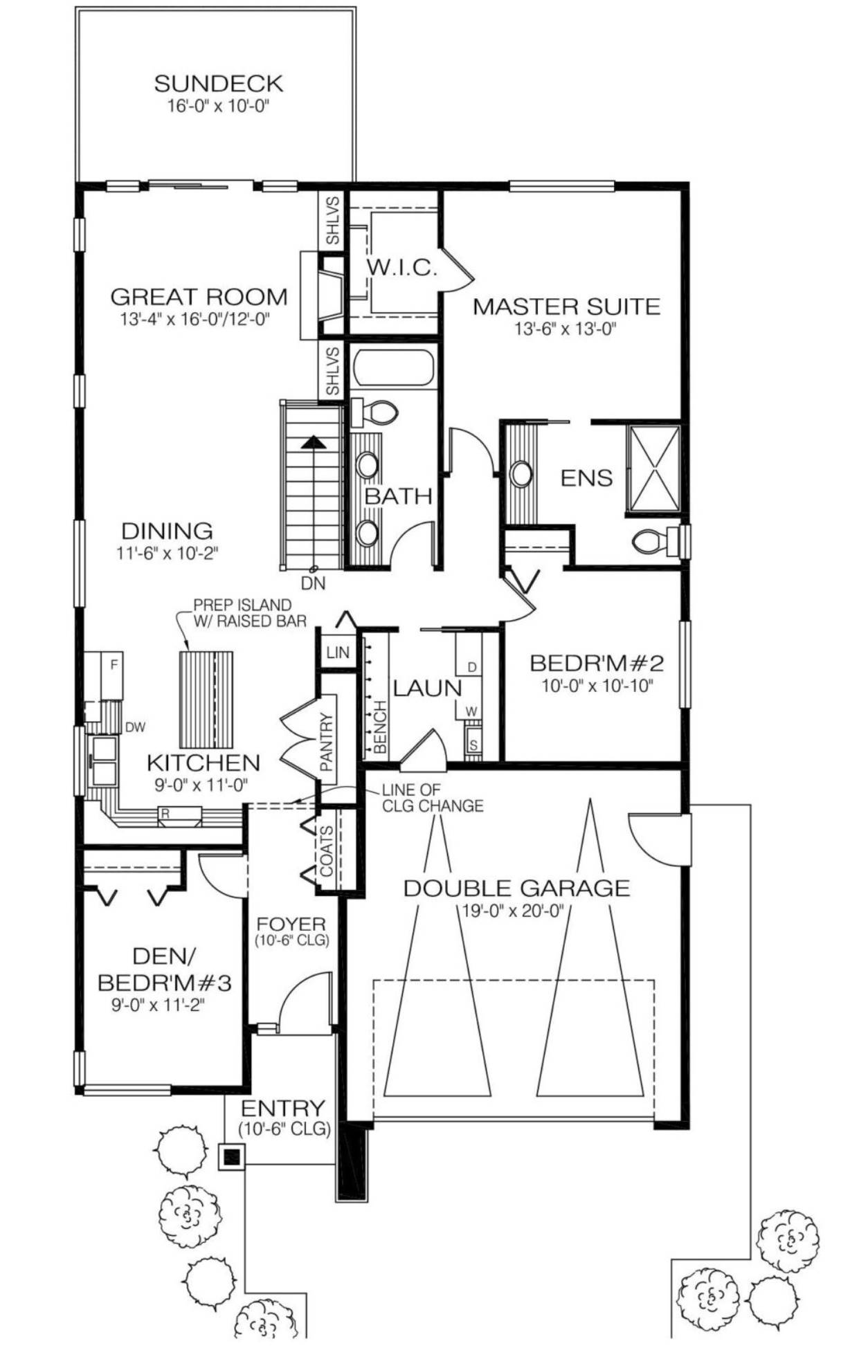 House Plan 10052 is a cute little modern home offering 1,447 square feet, three bedrooms, and two bathrooms on one level, but it also has a basement you can finish, if you like. The layout places one bedroom off the foyer while the primary suite and another bedroom are in the hallway behind the garage. The common areas spread back from the island kitchen, to the dining area, to the great room with a fireplace and built-ins, to the sundeck for outdoor living.