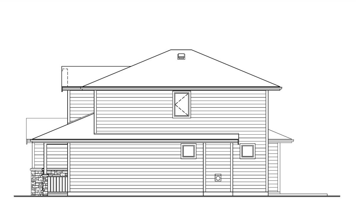 House Plan 10054 offers timeless appeal in a Traditional style with 1,703 square feet of thoughtfully designed living space. A pair of gables with cross-bracing and a wide covered veranda enhance the curb appeal of this three-bedroom, two-and-a-half-bath home. Step into a spacious foyer with a den—perfect for a home office—just off the entry, along with a powder room and coat closet. The open-concept great room features a gas fireplace and large rear-facing windows that flood the space with natural light. The adjoining dining area and U-shaped kitchen with prep island and eating bar make entertaining easy, and patio access encourages outdoor living. Upstairs, the primary suite boasts a walk-in closet and a private ensuite with a shower, while two additional bedrooms share a full bath with tub. Laundry is conveniently placed at the top of the stairs, along with extra storage. A single-car garage connects to the main level, and an unfinished basement offers future potential.