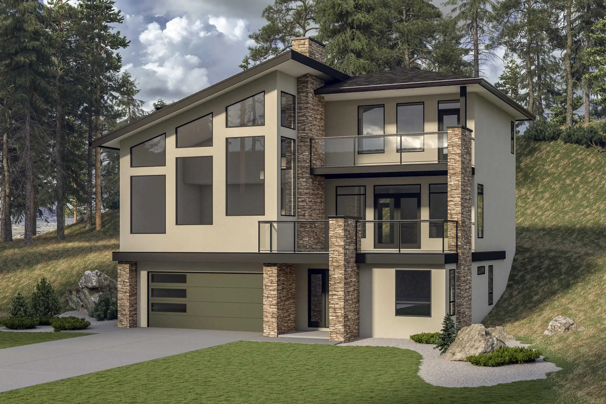 House Plan 10056, is a striking 3,099-square-foot recreation home with a bold contemporary design. Its steeply angled roofline and asymmetrical facade feature stucco, brick accents, and painted trim. The main floor offers a vaulted living room with a see-through fireplace, open dining with deck access, and a functional kitchen with a prep island and walk-in pantry. A study, laundry room, and two-piece bath add convenience. Upstairs, the luxurious primary suite includes a private deck, spa-like ensuite, and walk-in closet, while two additional bedrooms share a full bath. A versatile lower level includes a rec room, storage, and a fourth bedroom or den with a three-piece bath. The double garage provides space for a workshop, making this home both stylish and practical.