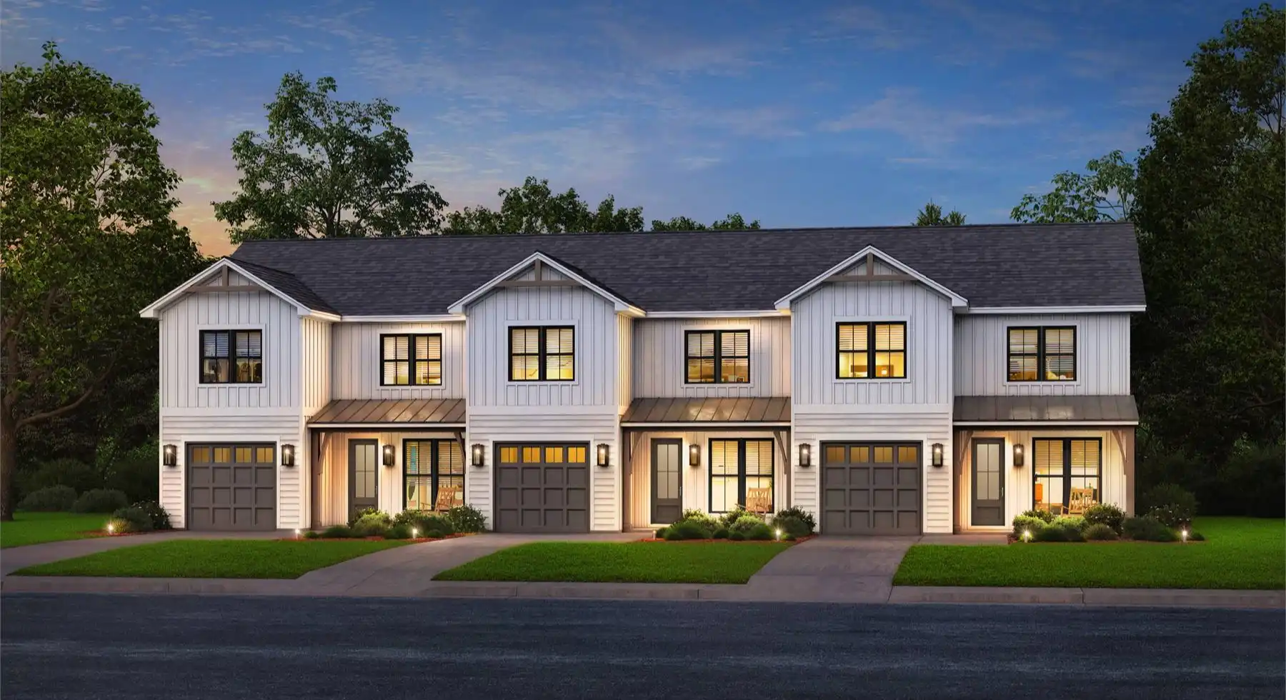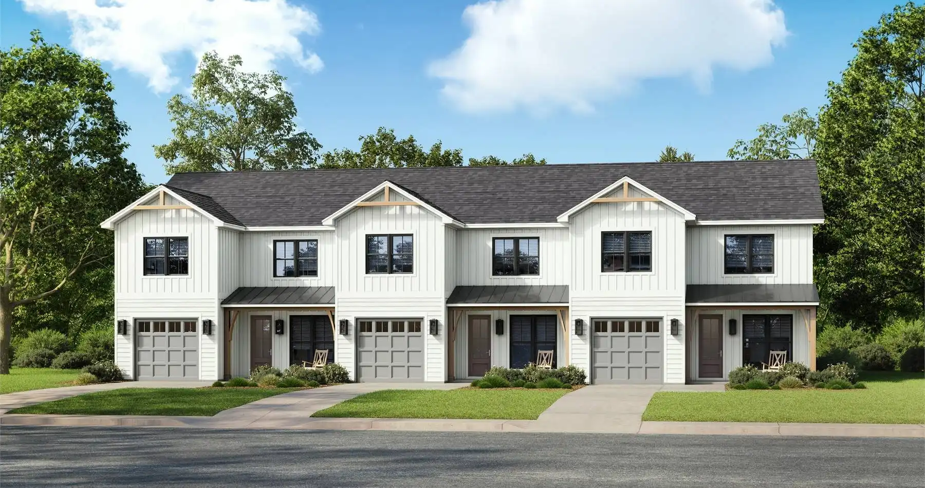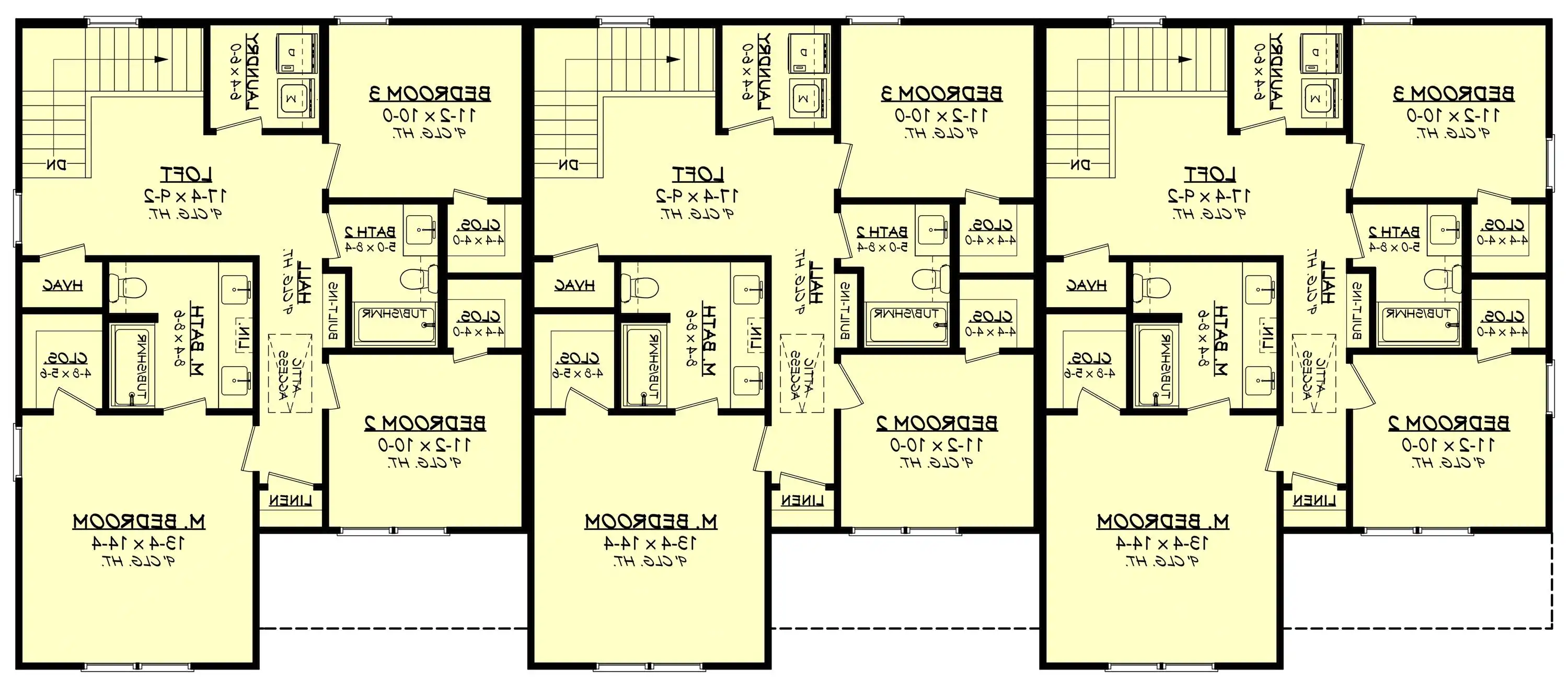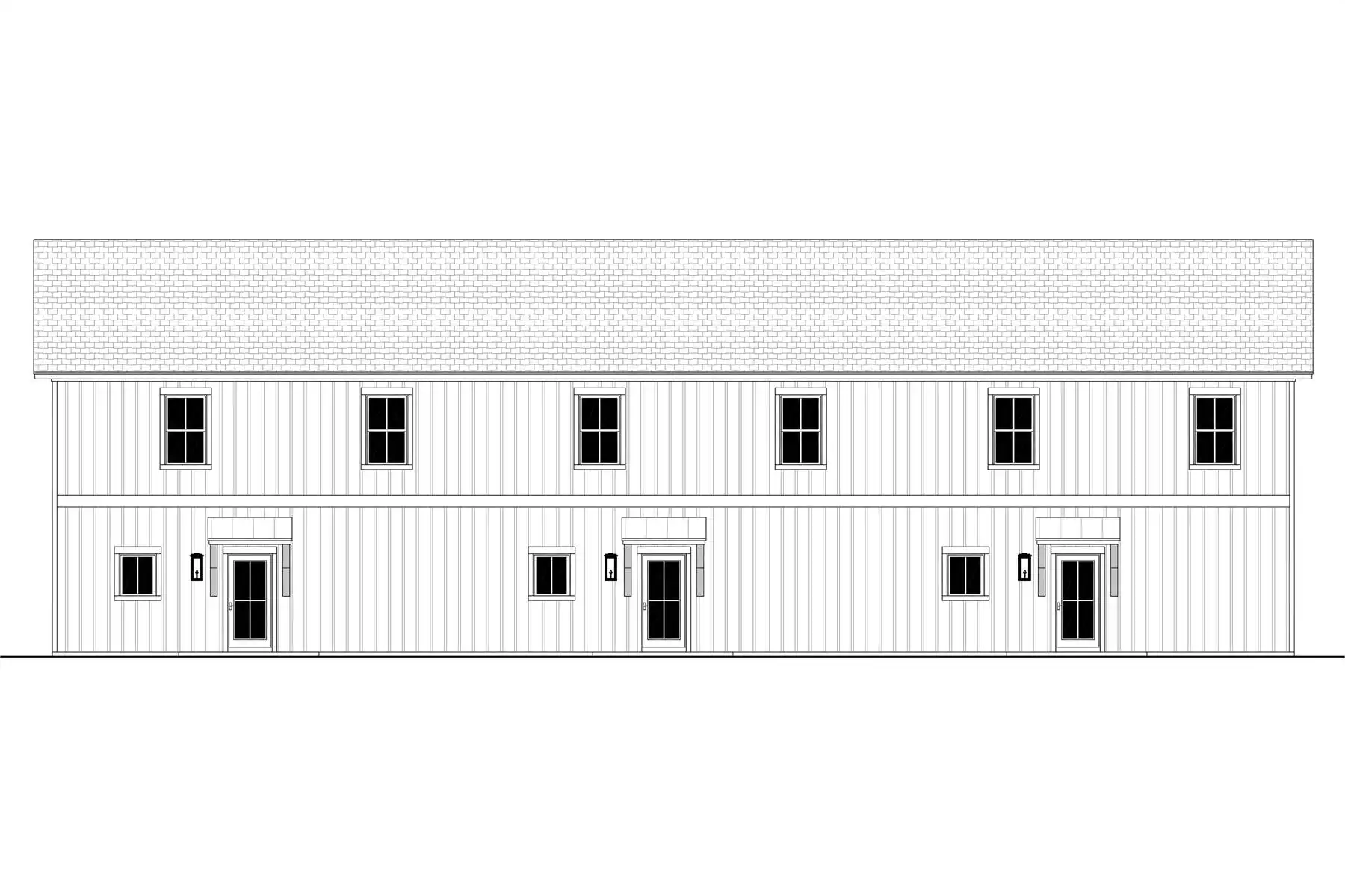 House Plan 10067 is a smartly designed multi-family unit featuring an oversized one-car garage. The first floor includes an open kitchen and living room with a central island and pantry, plus an entry hall equipped with lockers and a half bath. Upstairs, three bedrooms provide ample space, each guest room with a walk-in closet, alongside two bathrooms, a loft, a laundry room, and additional hallway storage. The primary suite includes dual vanities and a spacious walk-in closet, making this home both efficient and comfortable for families.