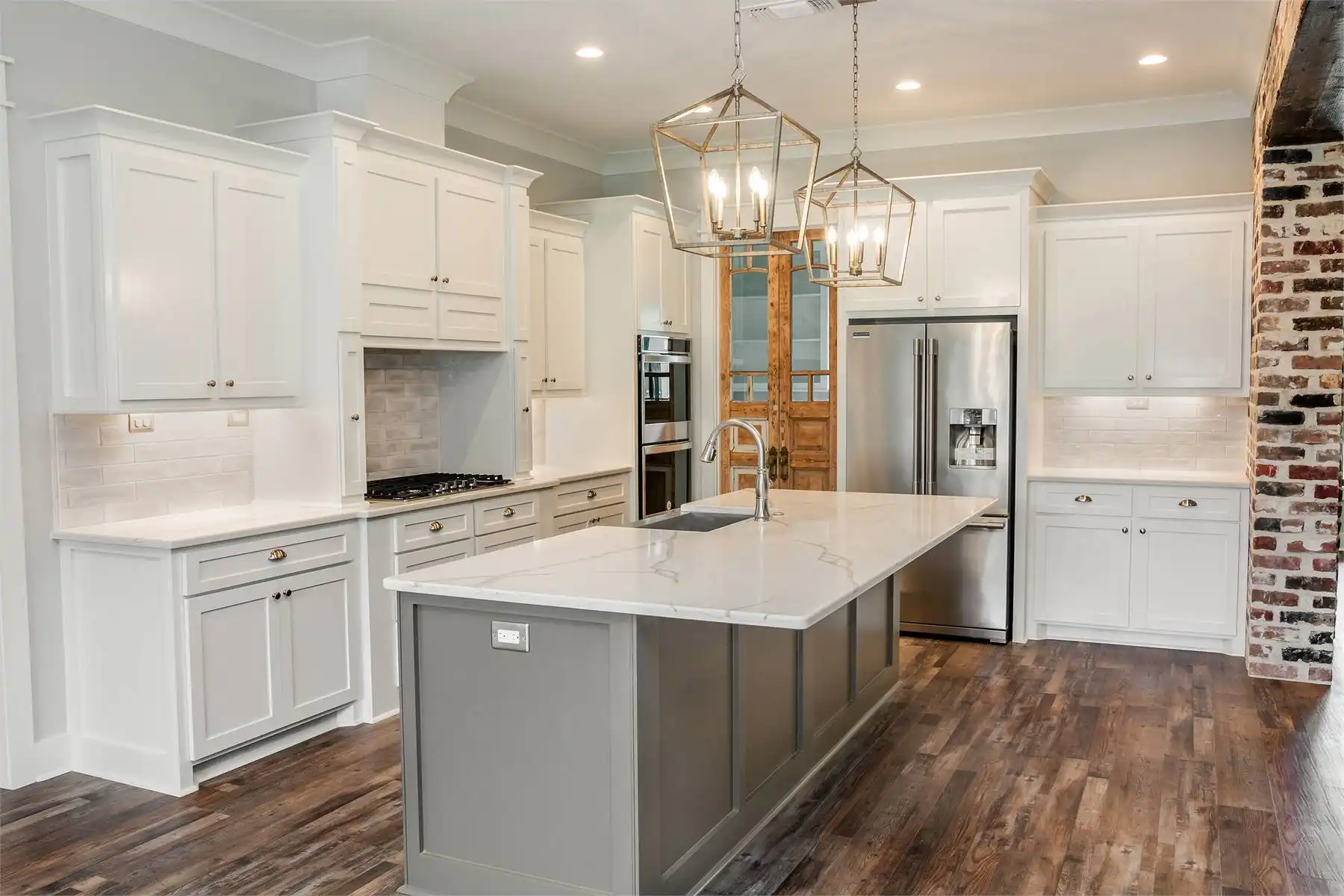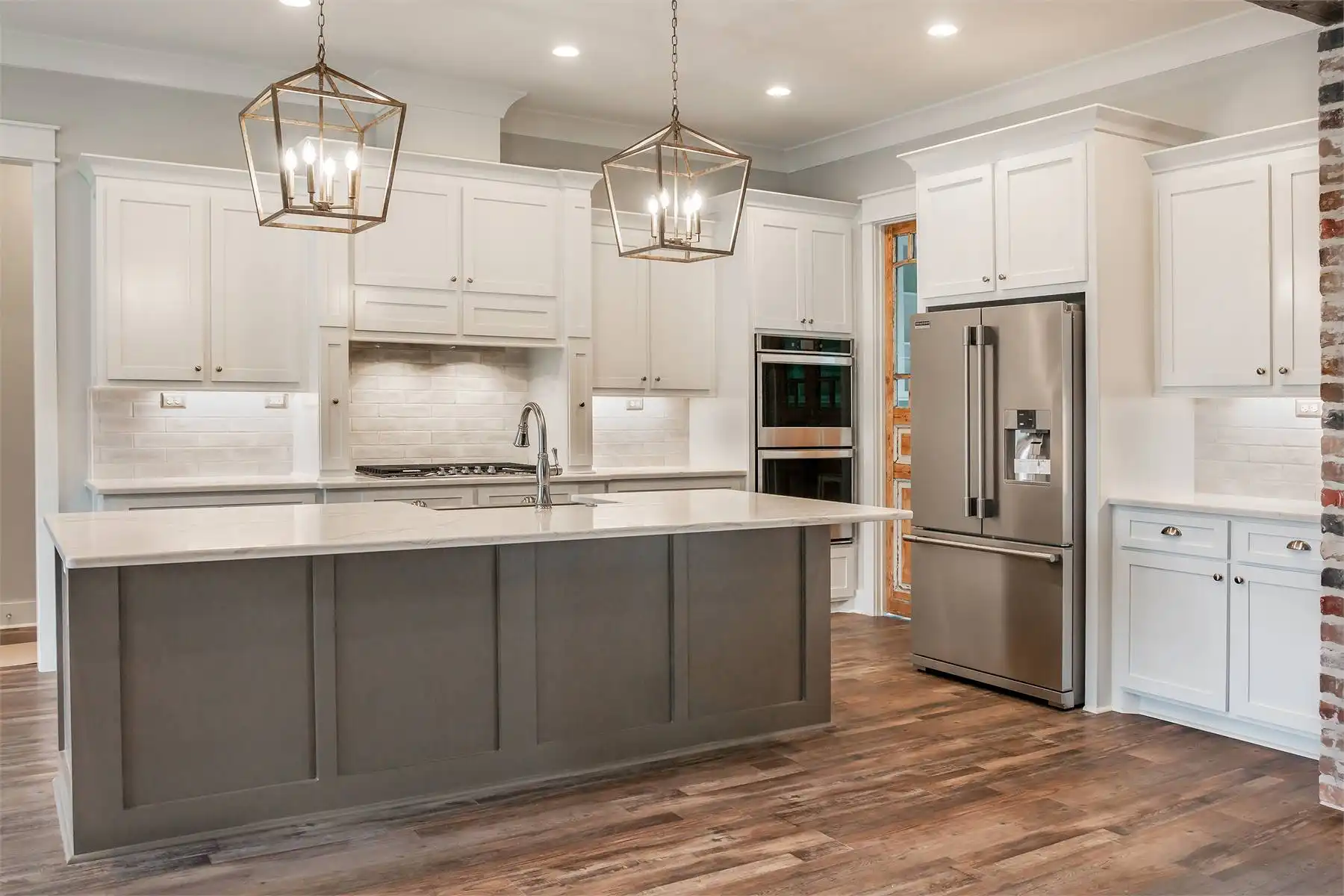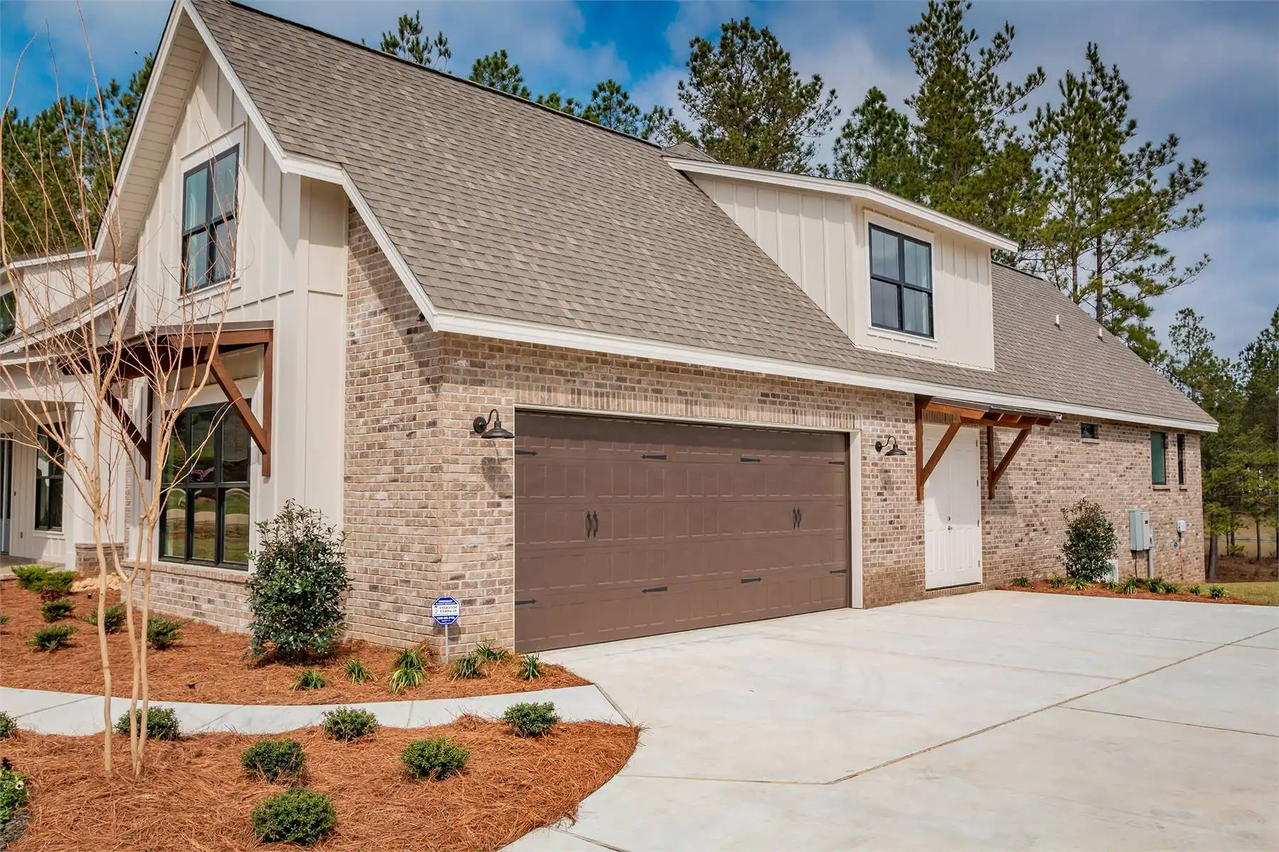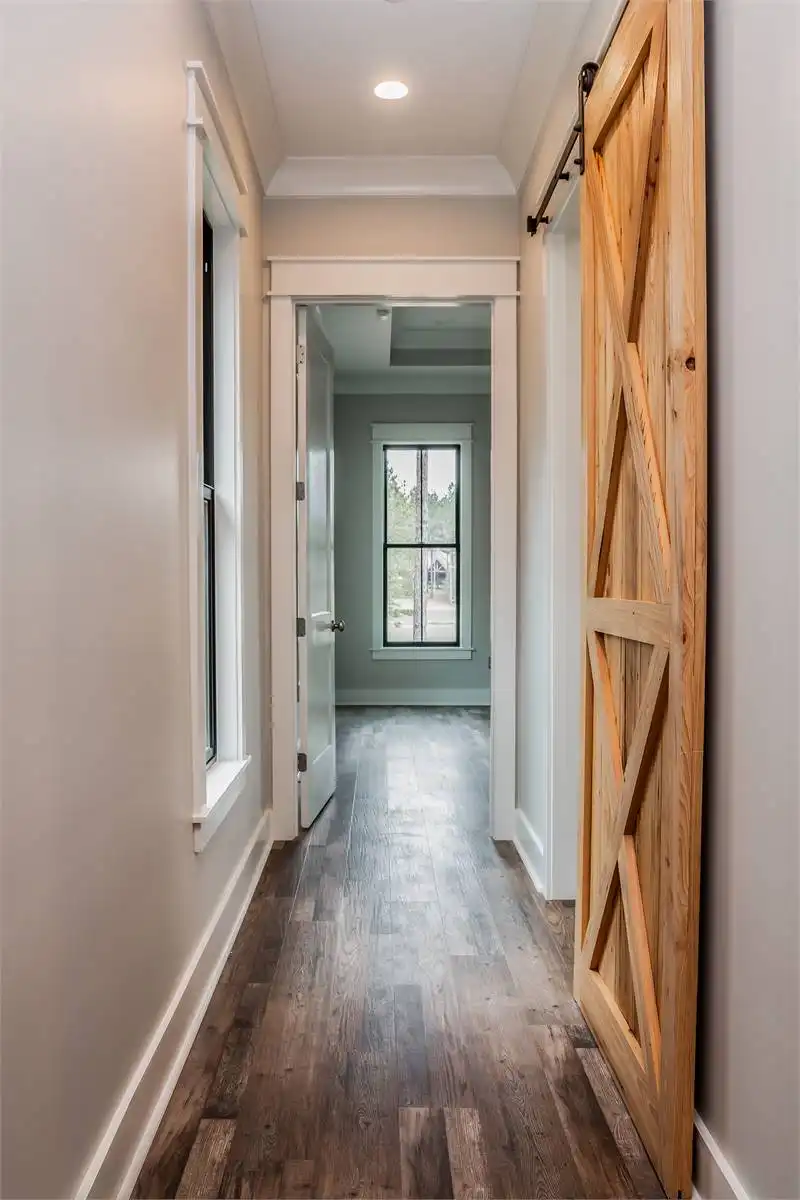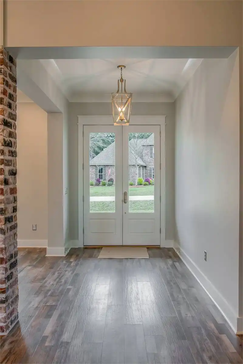House Plan 10082 offers a spacious 2,652 square feet of living space in a charming 1.5-story modern farmhouse design. The open floor plan includes a large great room with a brick accent wall, connected to the kitchen and breakfast area, making it ideal for gatherings and daily family life. The primary suite is a highlight, providing a private retreat with a luxurious bathroom, walk-in closet, and even a safe room for added peace of mind. Two additional bedrooms are located on the opposite side of the house, offering privacy and convenience for family or guests. A bonus room above the garage, complete with its own bathroom and closet, provides a flexible space that could serve as a guest suite, home office, or recreational area. With a covered front porch and an expansive rear porch, this home also invites outdoor relaxation, adding to its warm and welcoming appeal.
