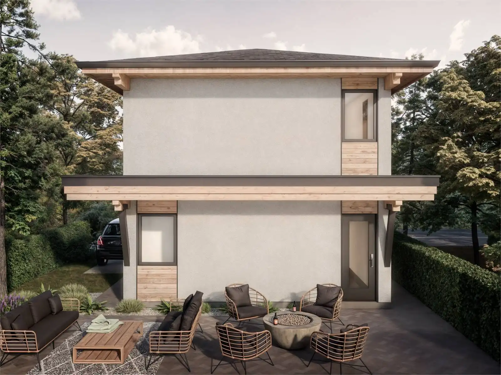 This 966 sq. ft. garage/ADU combines practicality and comfort in a sleek, efficient layout. The main level boasts a generous 2-car garage with 8'6" ceilings, providing ample space for vehicles or storage. Upstairs, you'll find a well-appointed living space featuring a modern kitchen, a cozy living area, a comfortable bedroom, and a full bathroom. With the added convenience of a dedicated laundry area, this design is perfect for a rental unit, guest house, or a personal retreat. Its thoughtful design makes the most of every square foot, offering a versatile solution for a variety of needs.