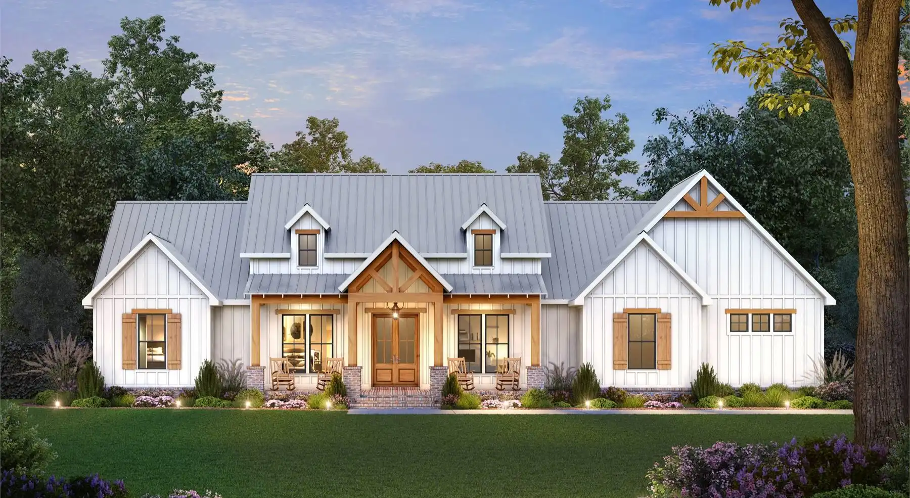 House Plan 10090 is a one-story, four-bedroom farmhouse designed for easy living with southern charm. Its covered front porch leads into a dining room that flows into a spacious L-shaped kitchen with a central island, walk-in pantry, and coffee bar. The mudroom conveniently connects the two-car garage to the kitchen for quick grocery transfer, with extra storage nearby. The split-bedroom layout offers privacy, with the primary suite featuring a large ensuite, separate shower and tub, double vanity, and an expansive walk-in closet. A vaulted great room opens to a large rear porch, creating a perfect space for relaxation and entertaining.