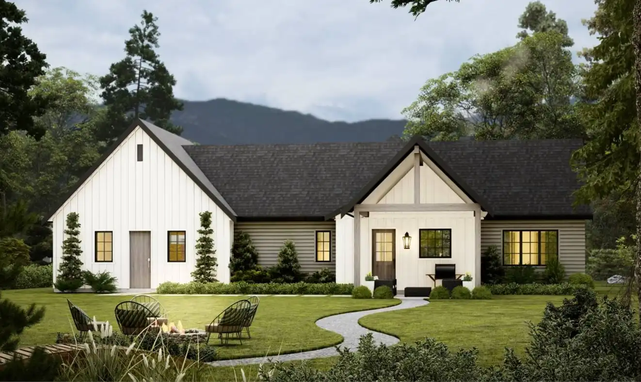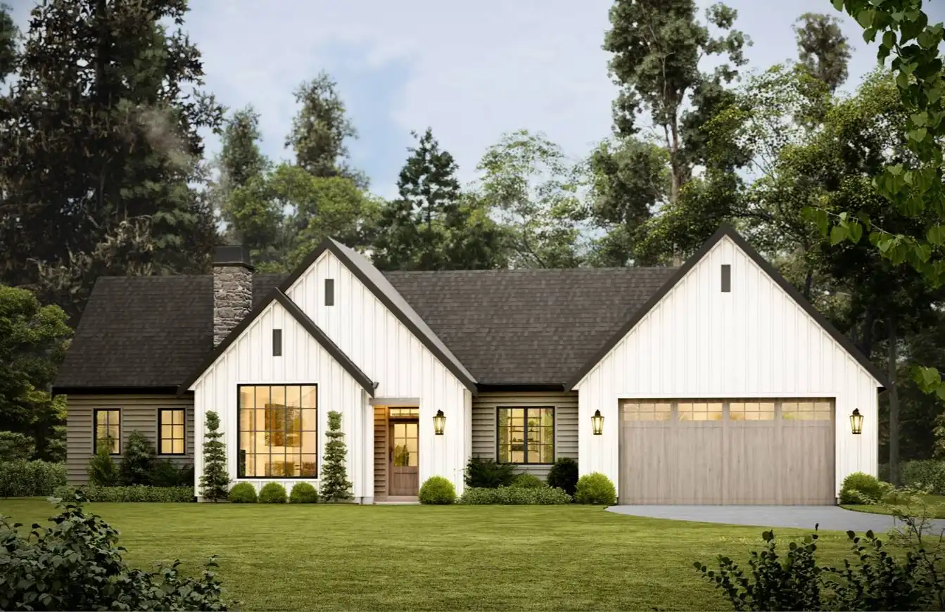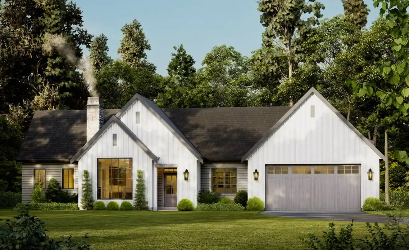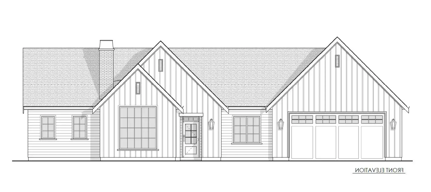 House Plan 10097 is a thoughtfully designed 1,077-square-foot home blending traditional charm with modern functionality. It features two bedrooms, two bathrooms, a vaulted great room with 9-foot ceilings, and a versatile den that can serve as a guest bedroom. The primary suite includes a full ensuite and walk-in closet, while practical amenities like a walk-in pantry and a combined mud and laundry room add convenience. The attached 567-square-foot two-car garage offers ample storage, with options for additional customization to fit your needs. This timeless design is perfect for comfortable and stylish living.