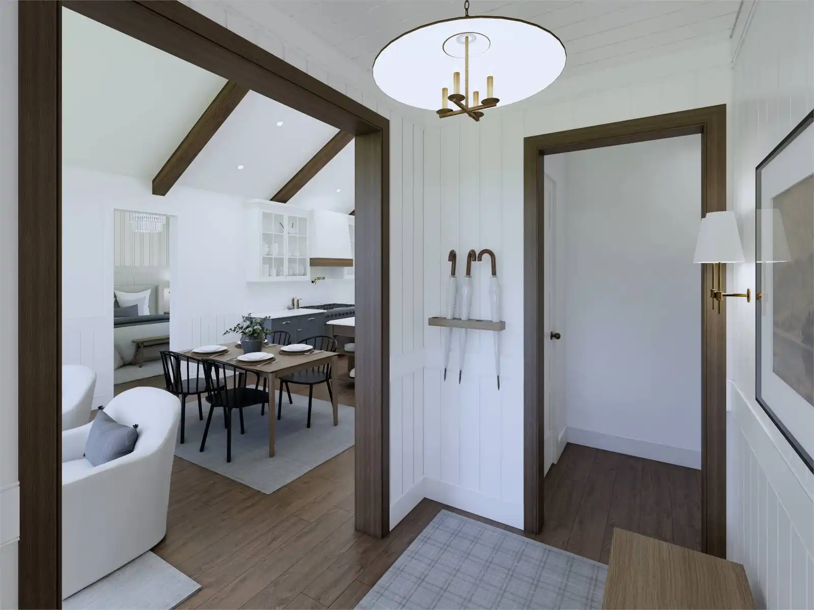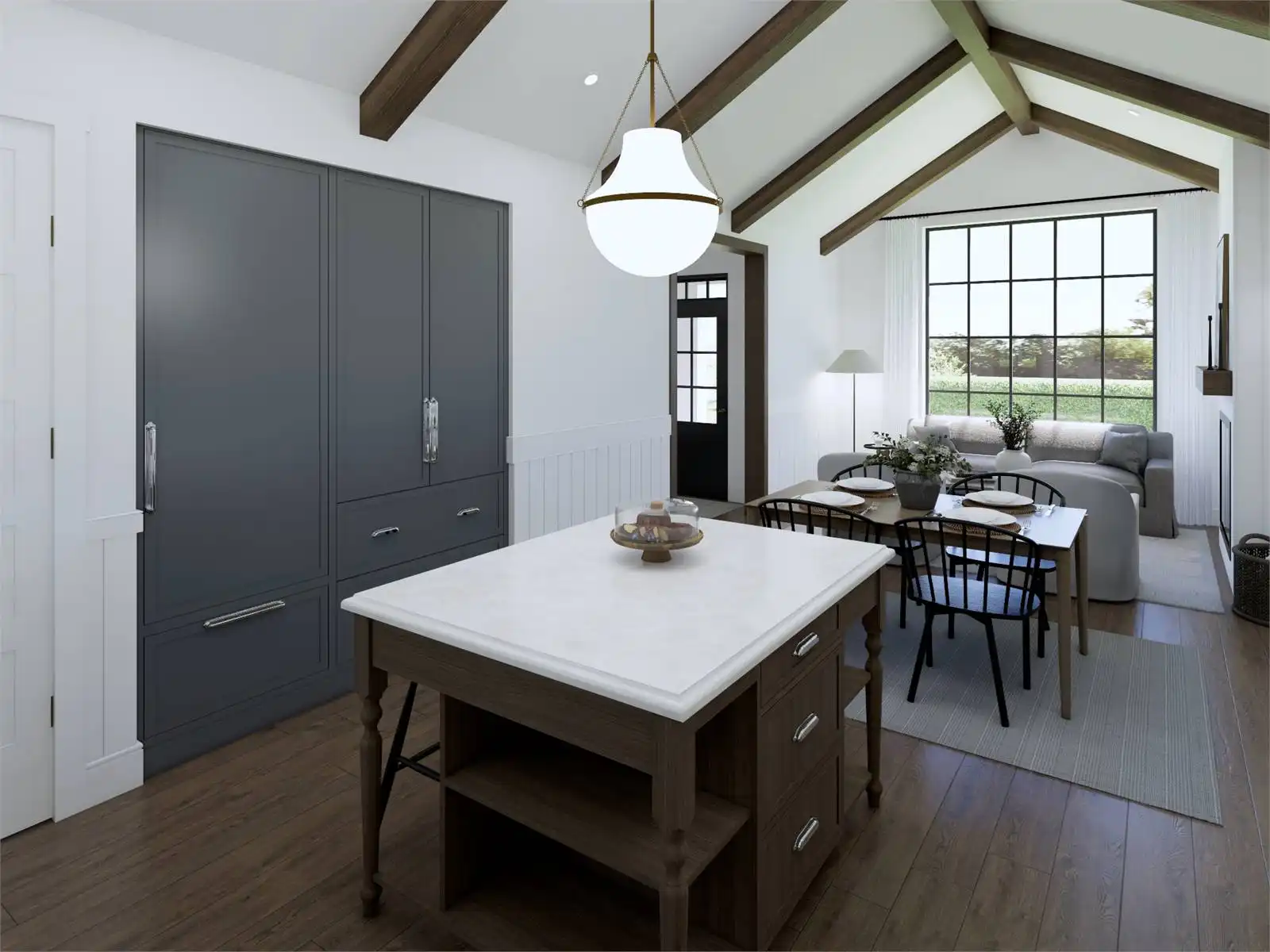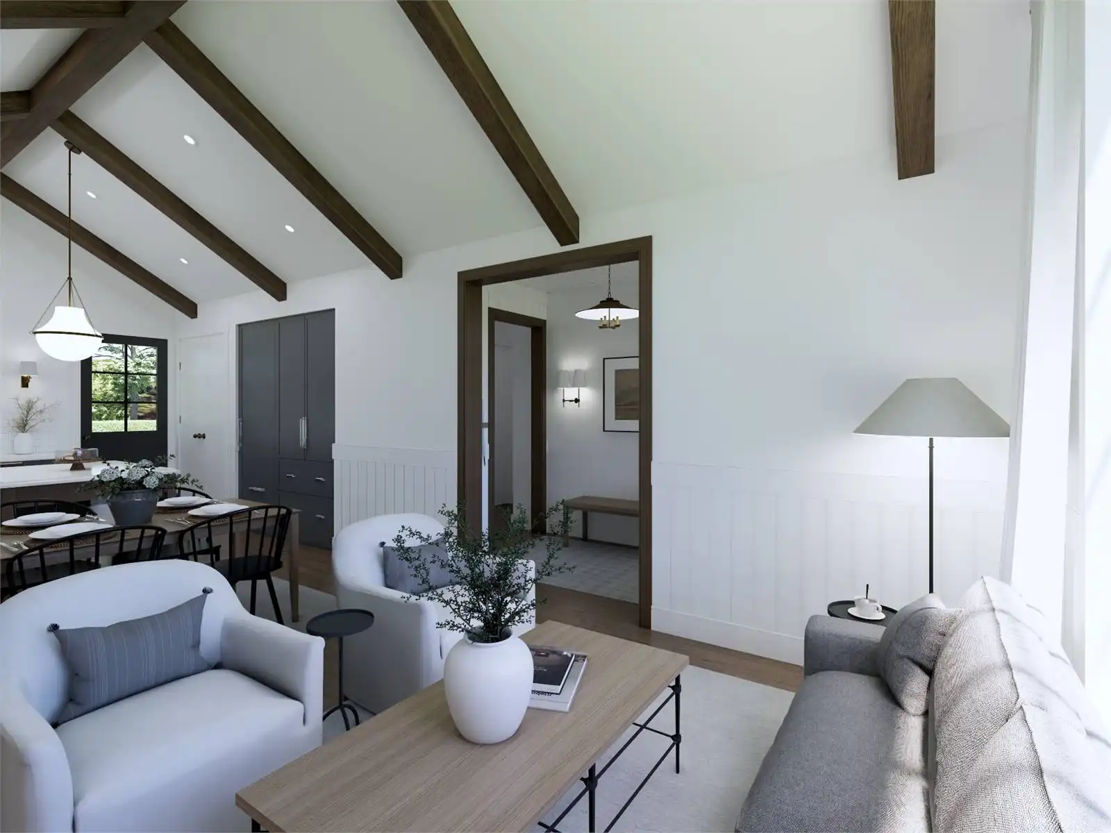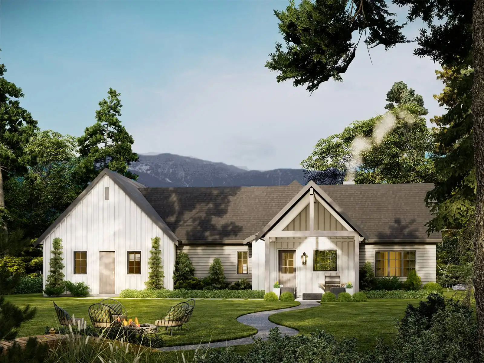 House Plan 10097 is a thoughtfully designed 1,077-square-foot home blending traditional charm with modern functionality. It features two bedrooms, two bathrooms, a vaulted great room with 9-foot ceilings, and a versatile den that can serve as a guest bedroom. The primary suite includes a full ensuite and walk-in closet, while practical amenities like a walk-in pantry and a combined mud and laundry room add convenience. The attached 567-square-foot two-car garage offers ample storage, with options for additional customization to fit your needs. This timeless design is perfect for comfortable and stylish living.
