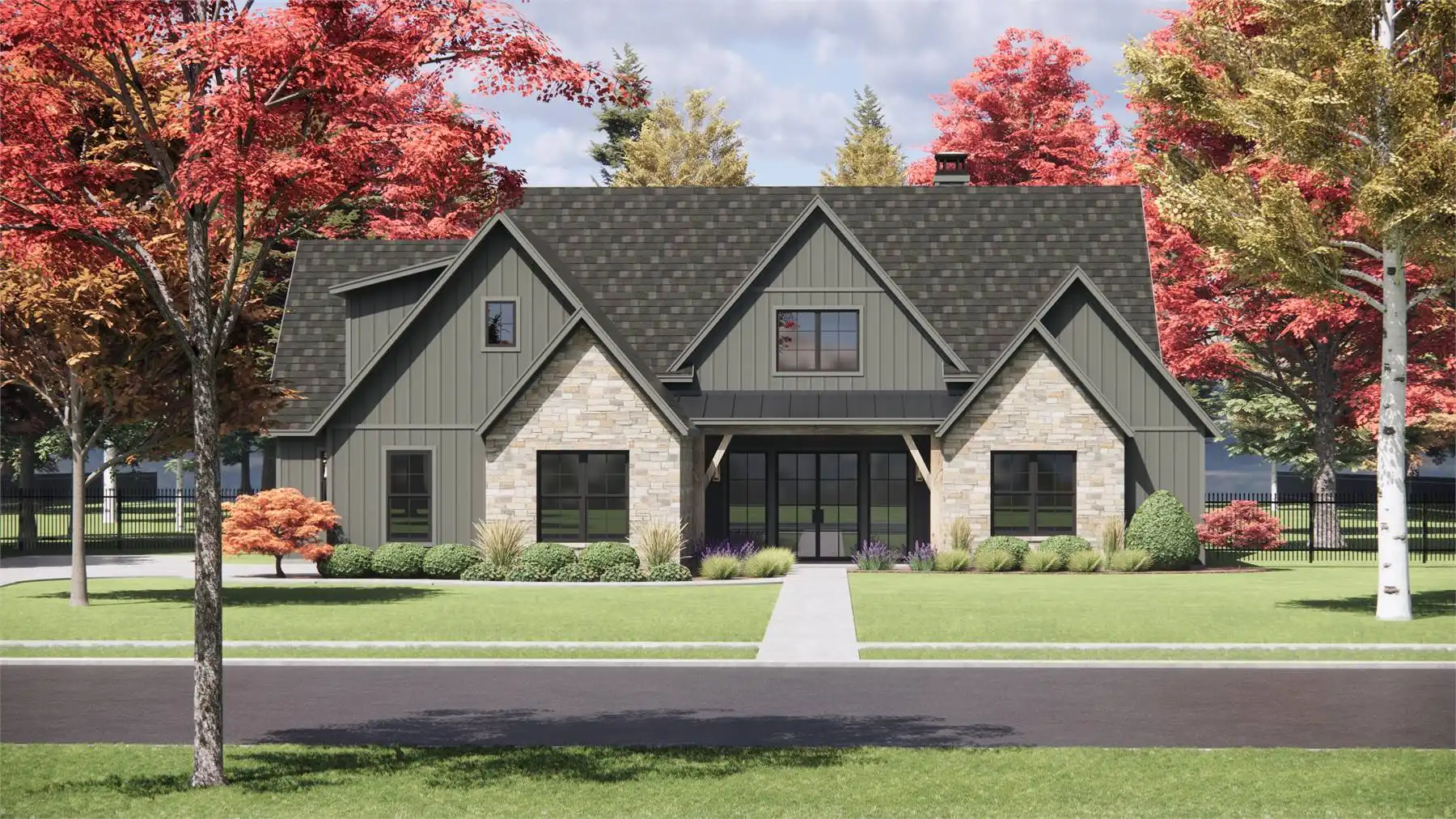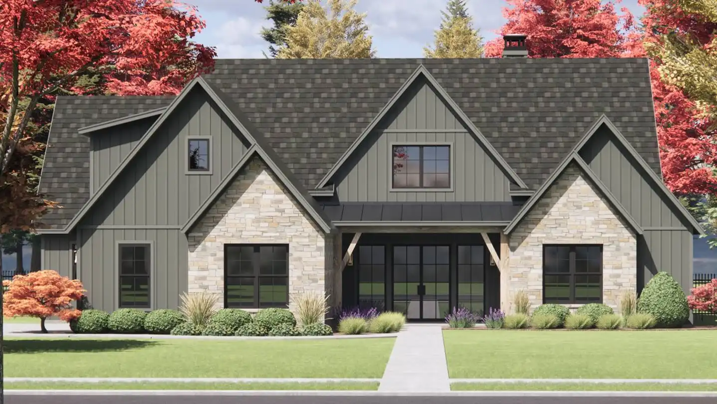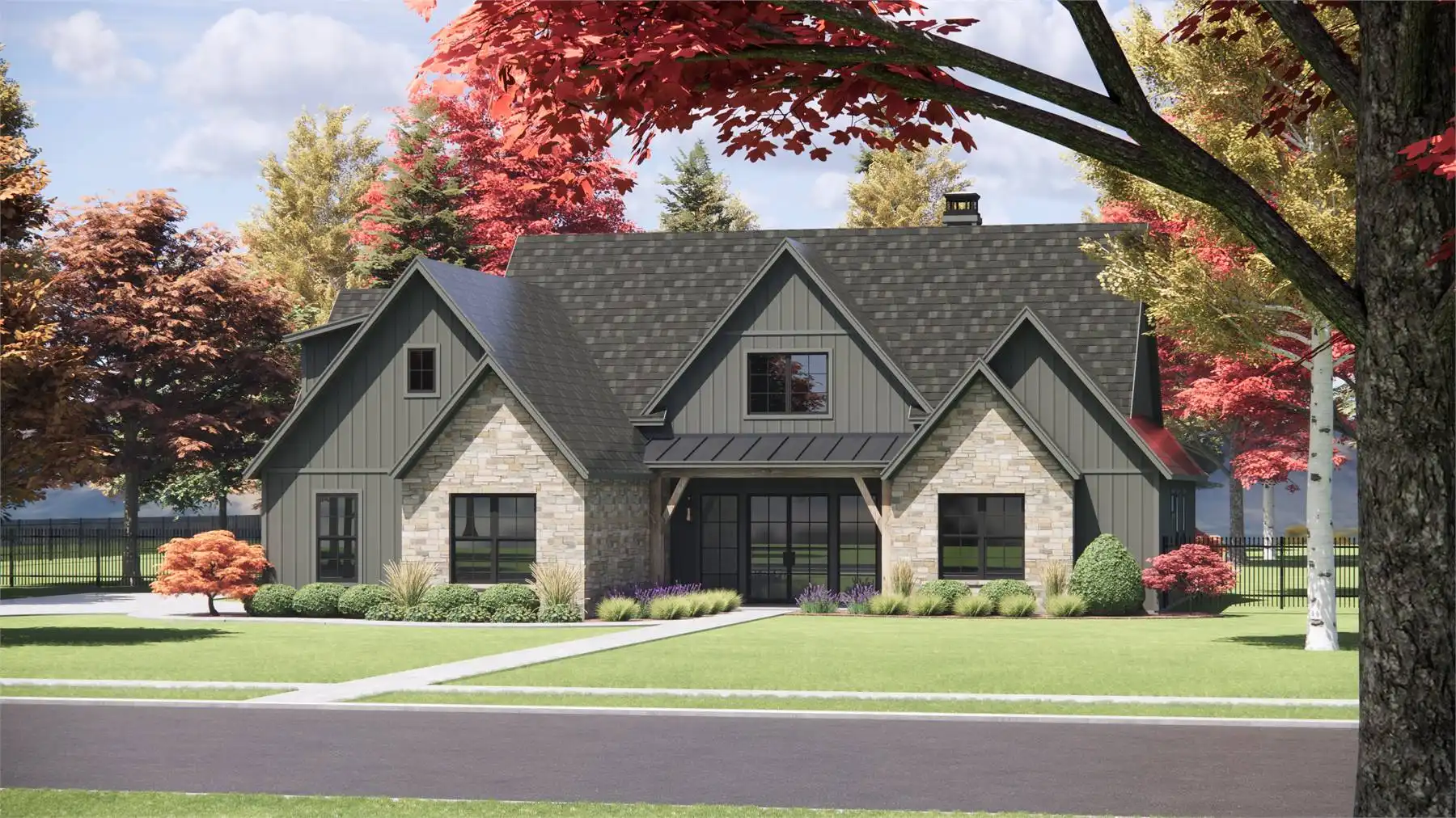 With 2,432 square feet, four bedrooms, and three bathrooms, House Plan 10110 is perfect for today's growing families! The one-story layout places the vaulted great room in the center while the bedrooms are split to the sides. The vaulted primary bedroom and its five-piece bath sit beside the island kitchen and dining area while the Jack-and-Jill bedrooms and a final bedroom by a hall bath are located behind the fireplace. This design also includes porches in front and back, a walk-in pantry, a large mudroom next to the laundry room, and a bonus room above the garage!