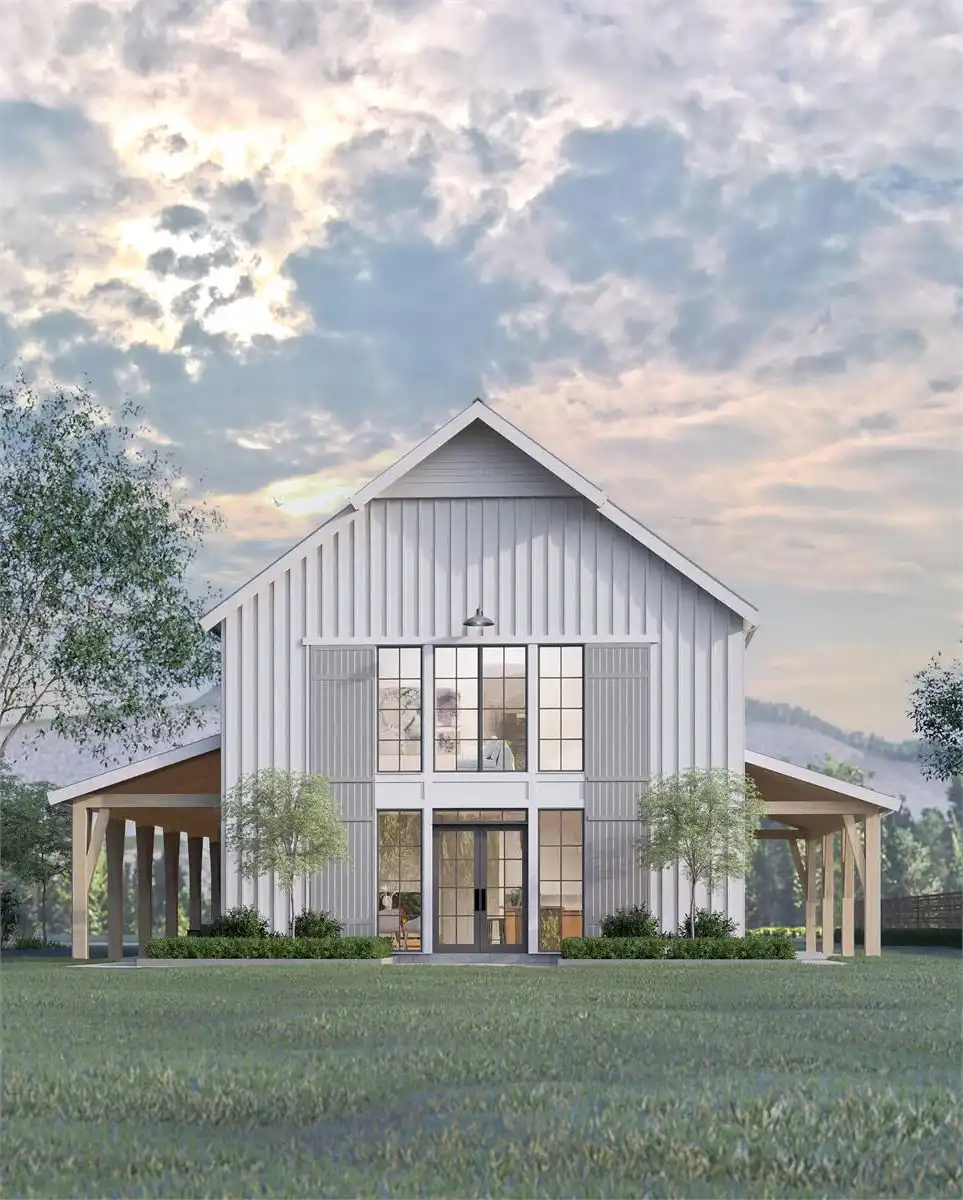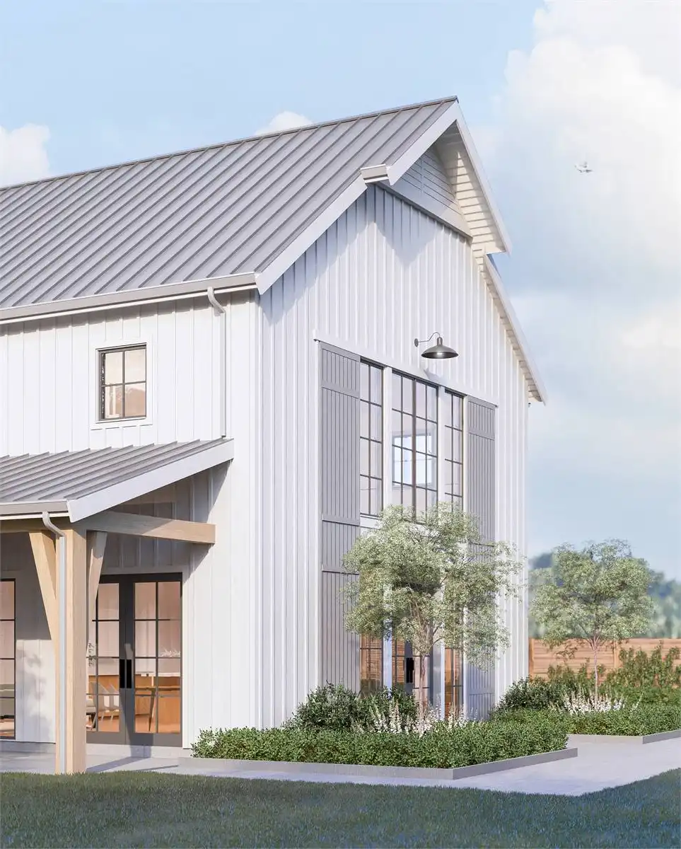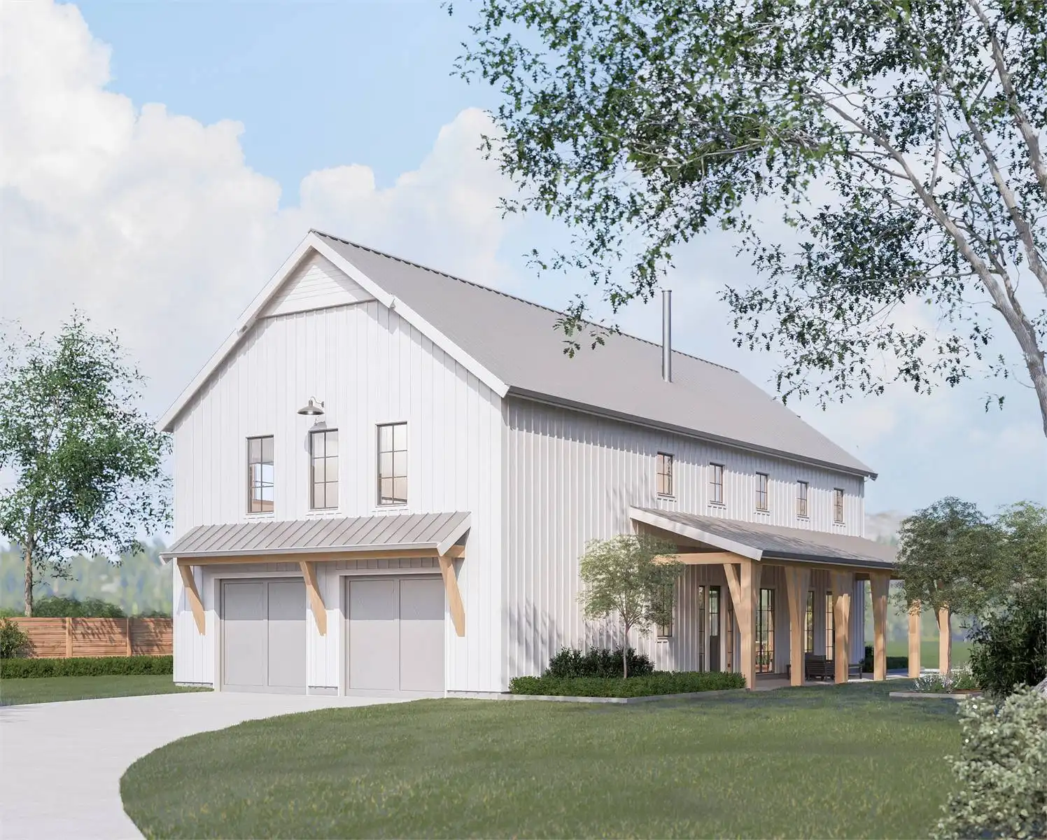 House Plan 10111 is a 3,450-square-foot modern barndominium with four bedrooms, 3.5 bathrooms, and a spacious two-car garage. Its bright exterior features large covered patios, perfect for outdoor living and entertaining. The open floor plan connects the dining room to a vaulted living area for a spacious and inviting feel. Upstairs, you’ll find four bedrooms, including a primary suite with a spa-like bathroom and walk-in closet, plus an office and a vaulted loft, making this home both functional and stylish.