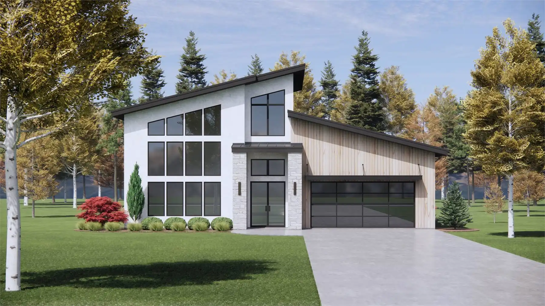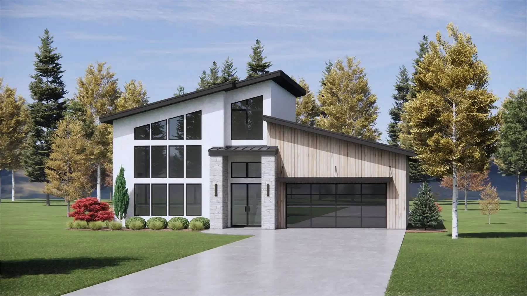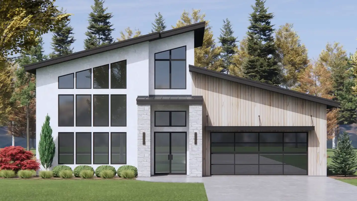 Got a view lot you want to face your home toward? Are you a fan of high and vaulted ceilings? Take a look at House Plan 10113! This amazing modern design offers 2,274 square feet with three bedrooms and two-and-a-half bathrooms across two stories, all neatly packaged in a relatively simple footprint with a two-car garage. The layout includes two-story vaulted living with a wall of windows in front, a U-shaped island kitchen, and the luxurious primary suite on the main level while Jack-and-Jill bedrooms are upstairs. All the bedrooms have vaulted ceilings to boot! Make sure to look at the floor plans so you don't miss the other features built into this design!