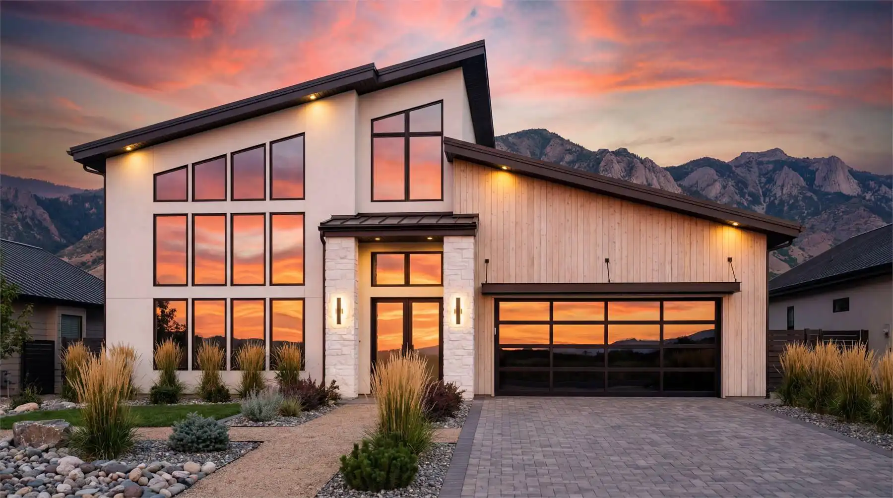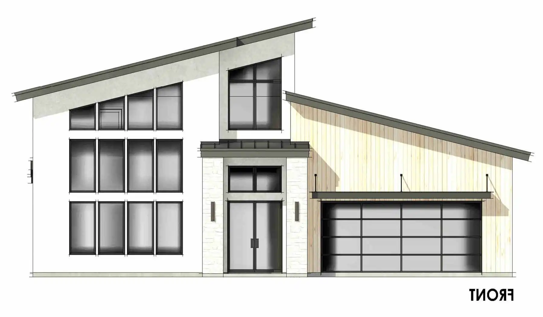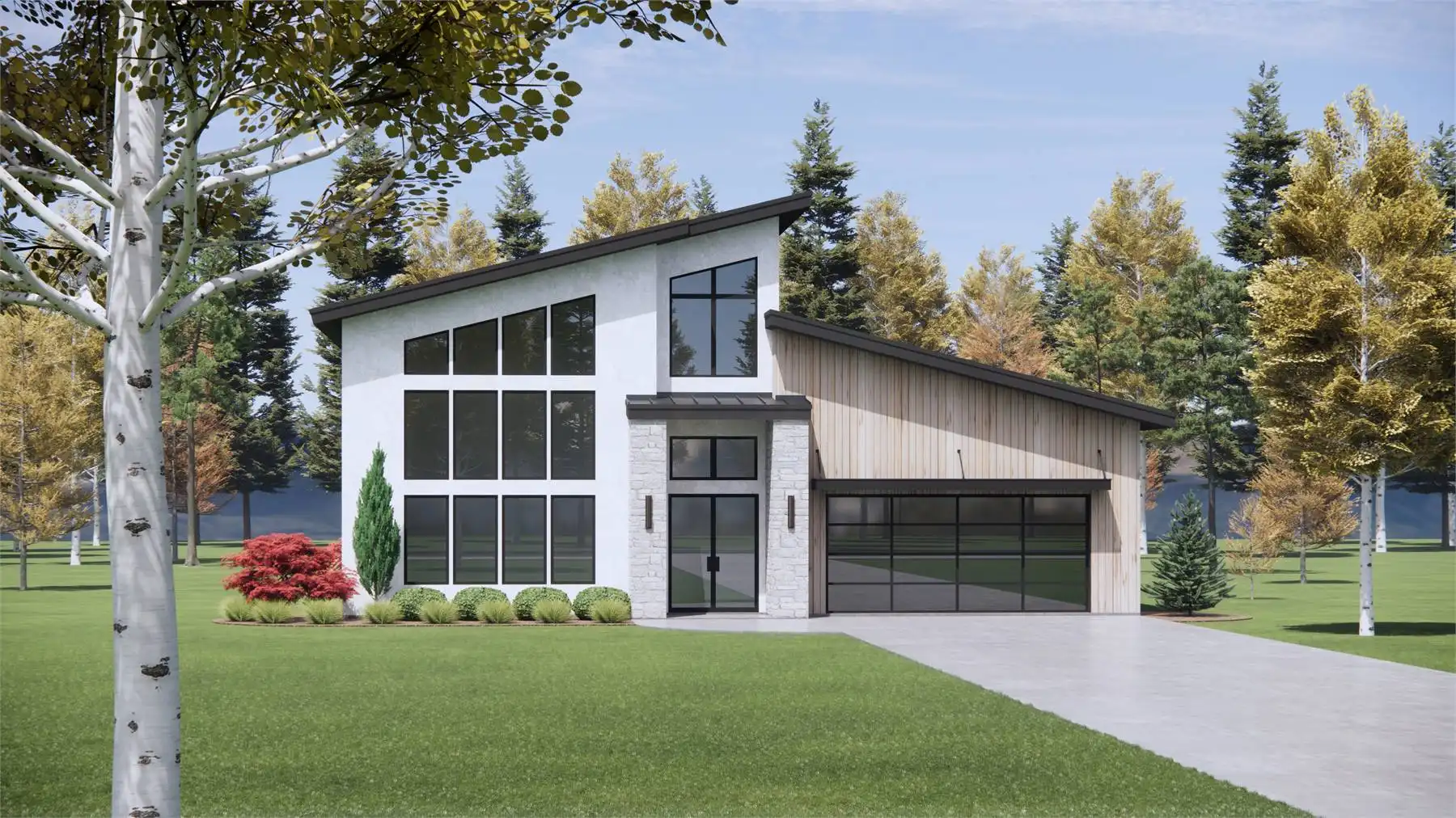 Got a view lot you want to face your home toward? Are you a fan of high and vaulted ceilings? Take a look at House Plan 10113! This amazing modern design offers 2,274 square feet with three bedrooms and two-and-a-half bathrooms across two stories, all neatly packaged in a relatively simple footprint with a two-car garage. The layout includes two-story vaulted living with a wall of windows in front, a U-shaped island kitchen, and the luxurious primary suite on the main level while Jack-and-Jill bedrooms are upstairs. All the bedrooms have vaulted ceilings to boot! Make sure to look at the floor plans so you don't miss the other features built into this design!