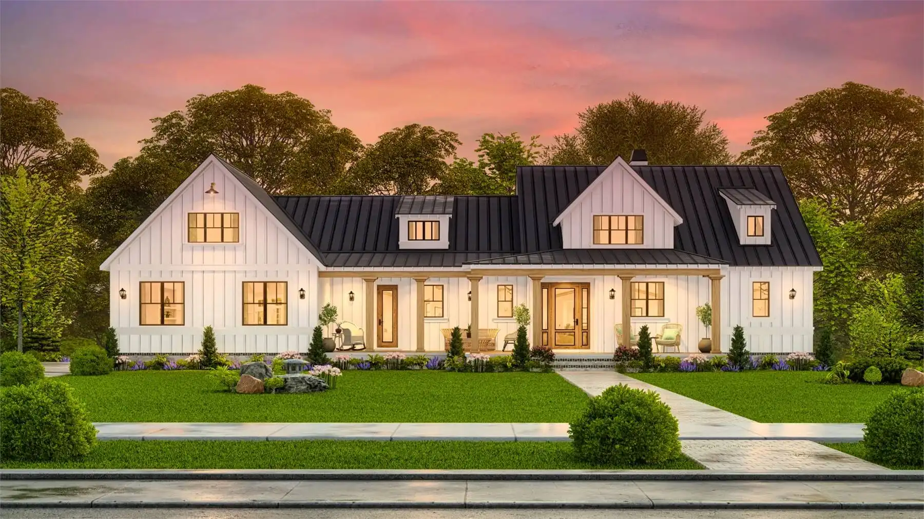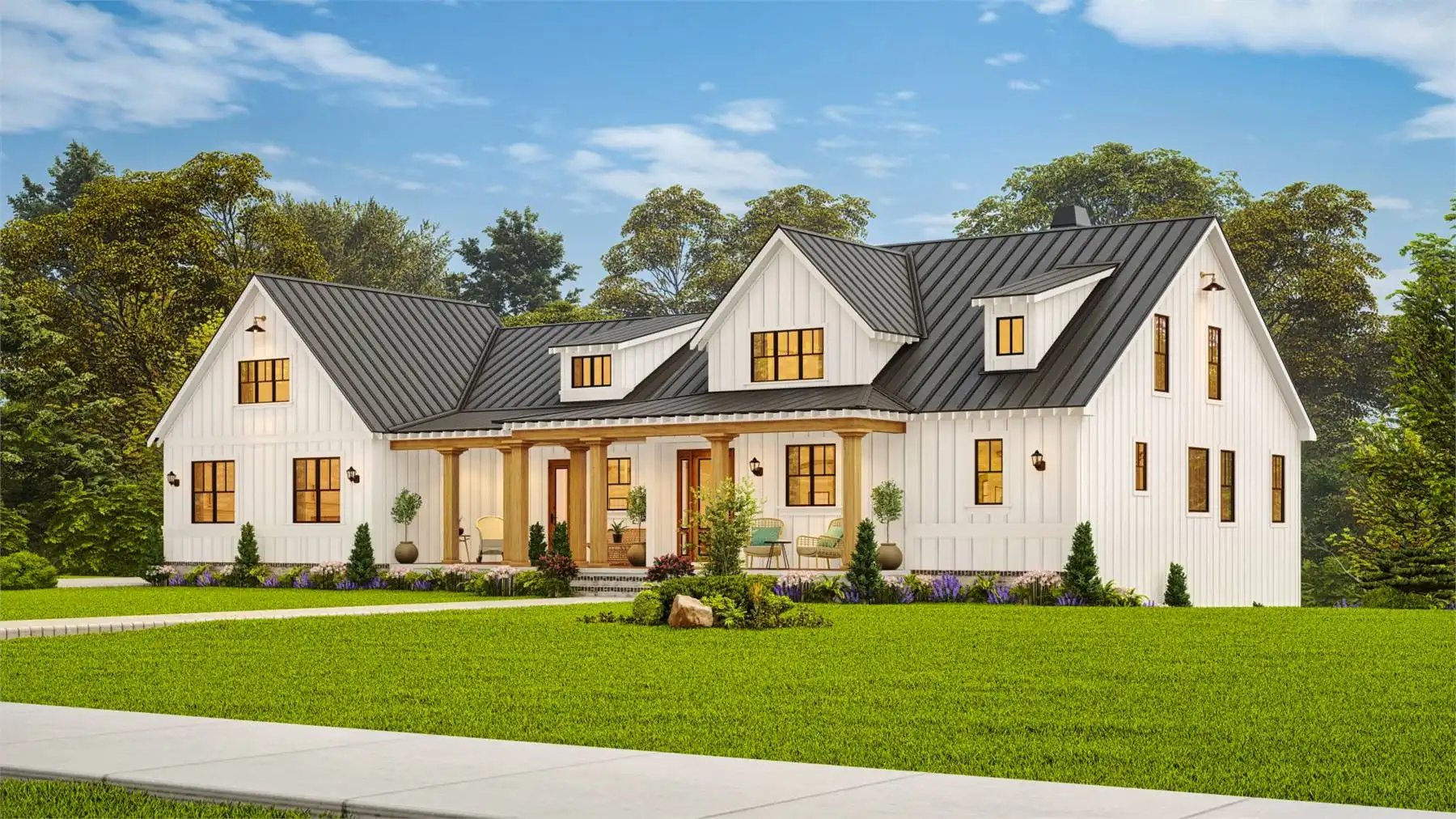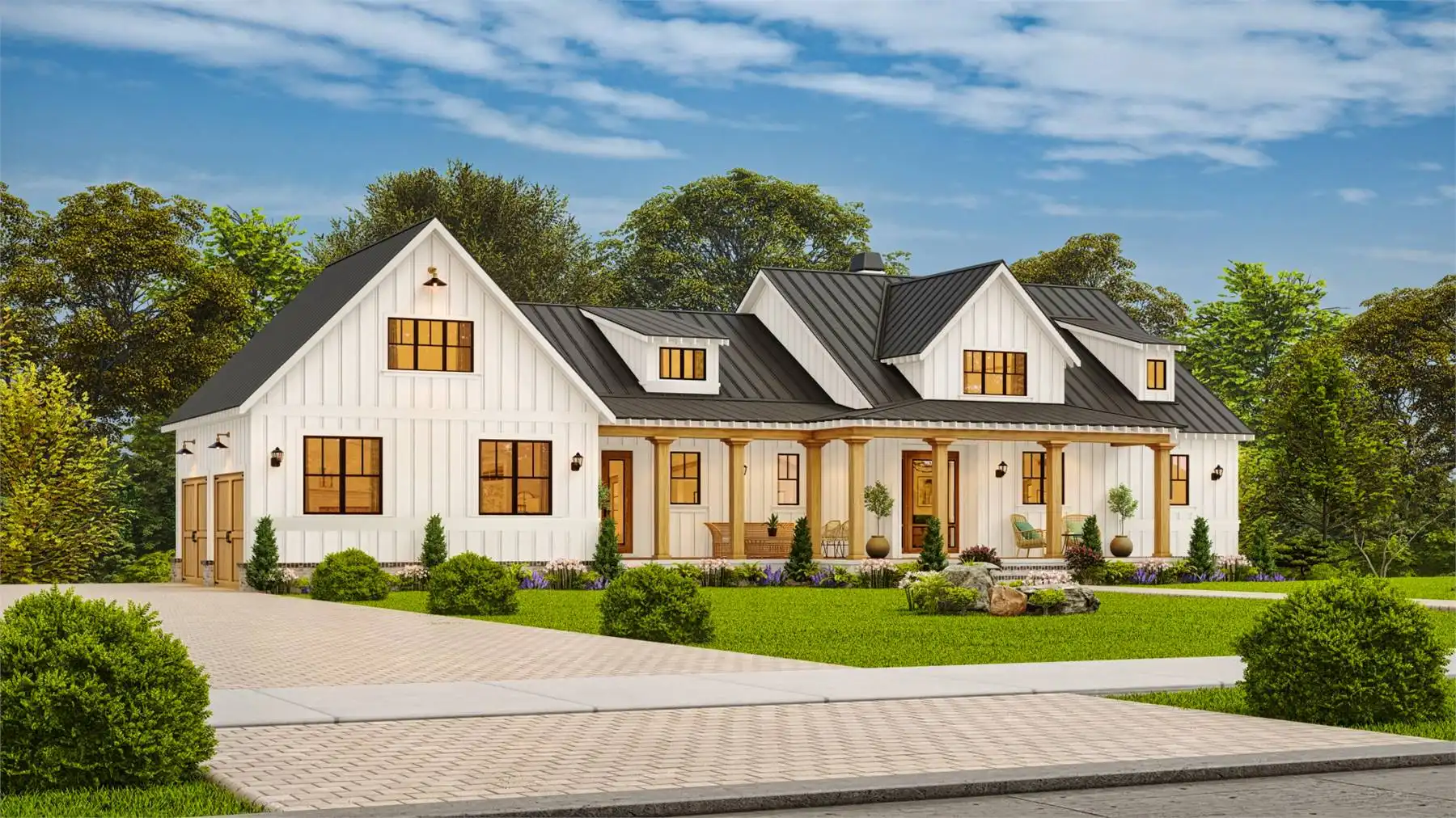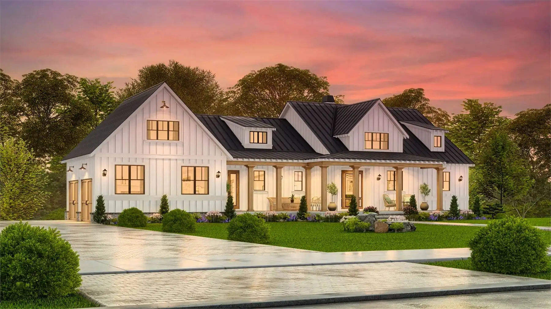 House Plan 10122 is a charming farmhouse with modern comforts. A wrap-around front porch and two-story garage with mudroom access add convenience and curb appeal. The open-concept main floor connects the kitchen, dining, and living areas, with a rear covered porch for year-round outdoor dining. A private study offers a quiet retreat, while the luxurious primary suite features a corner fireplace, spa-like bathroom, and spacious walk-in closet. Upstairs, two bedrooms with walk-in closets share a Jack-and-Jill bathroom, combining practicality and charm.
