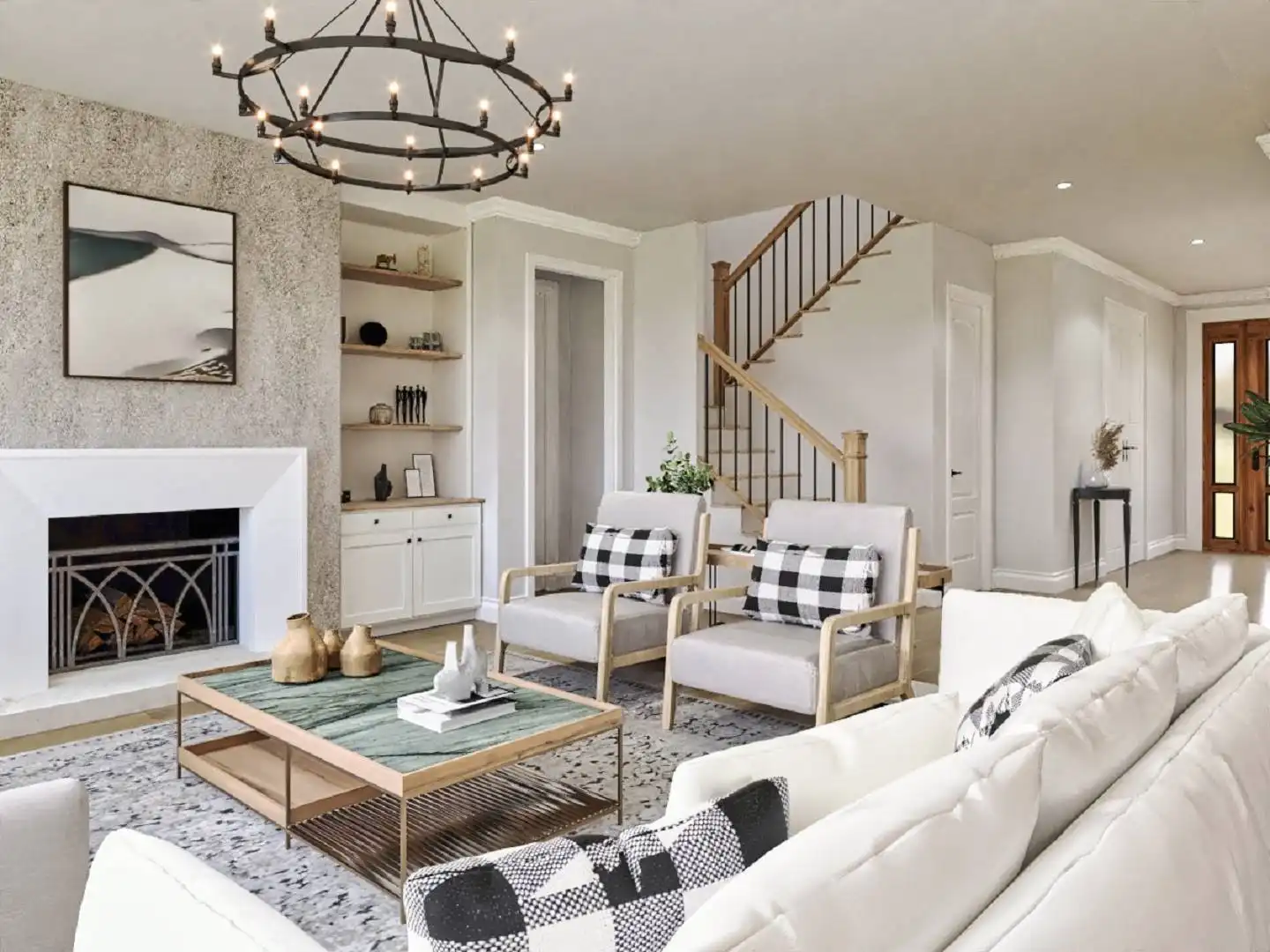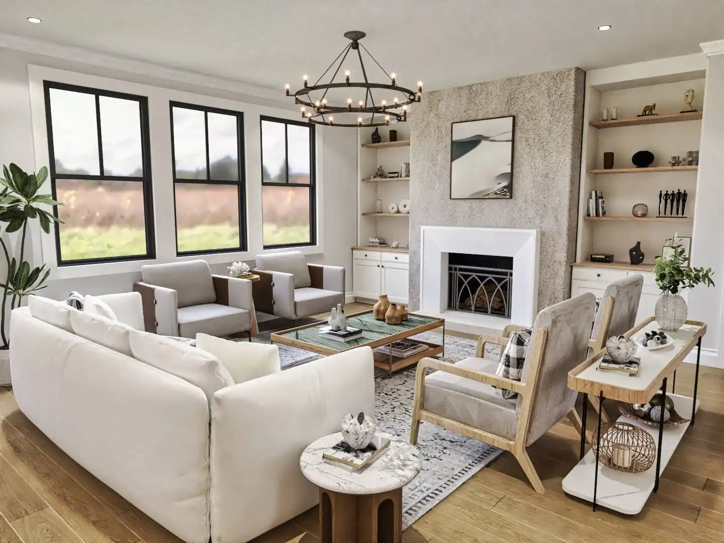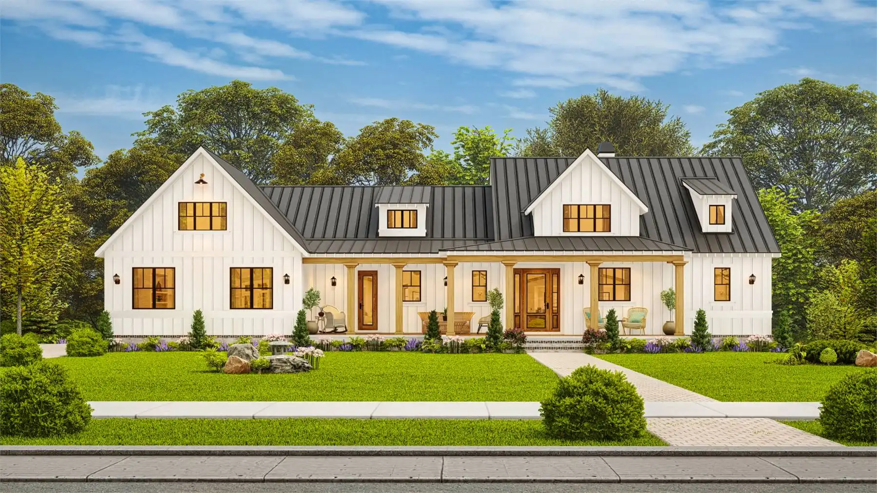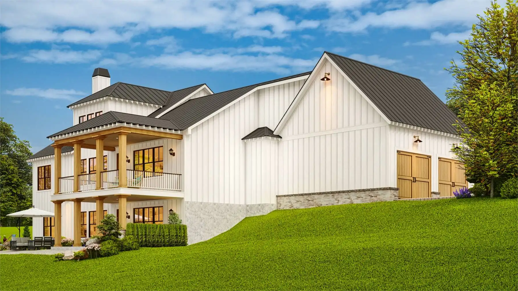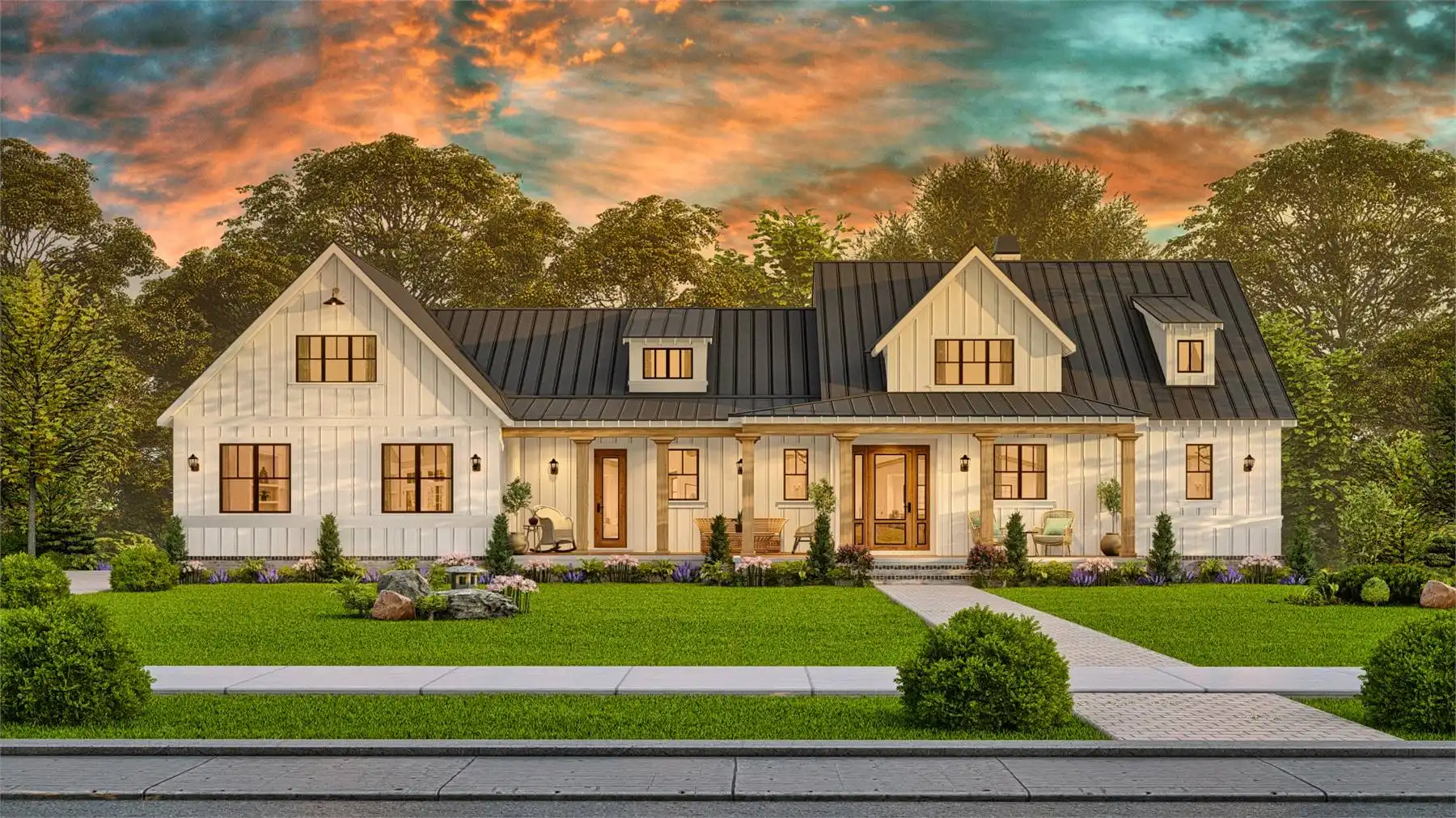 House Plan 10122 is a charming farmhouse with modern comforts. A wrap-around front porch and two-story garage with mudroom access add convenience and curb appeal. The open-concept main floor connects the kitchen, dining, and living areas, with a rear covered porch for year-round outdoor dining. A private study offers a quiet retreat, while the luxurious primary suite features a corner fireplace, spa-like bathroom, and spacious walk-in closet. Upstairs, two bedrooms with walk-in closets share a Jack-and-Jill bathroom, combining practicality and charm.