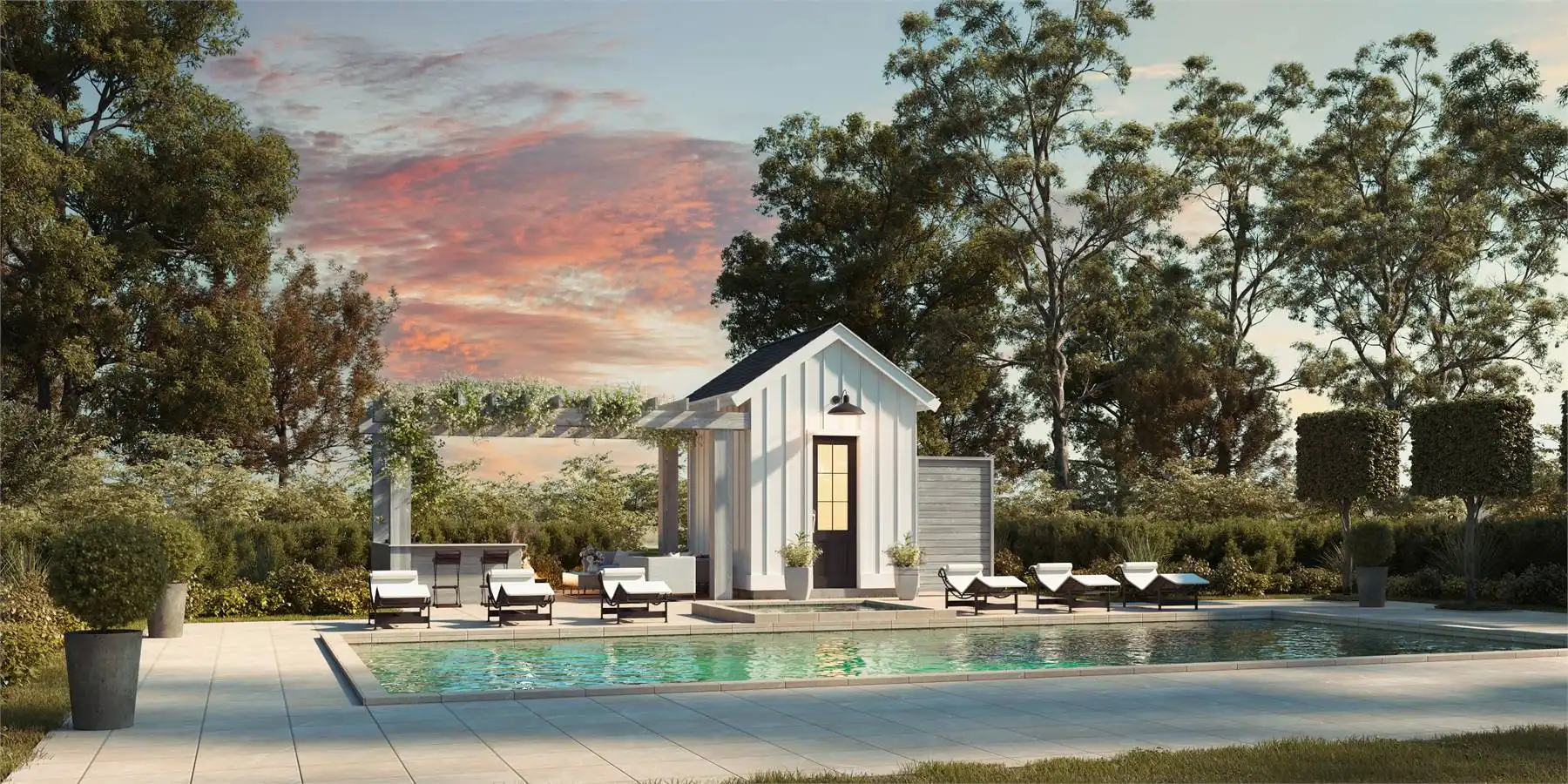 Transform your backyard into a luxurious haven with this pool house. At 311 sq. ft., this thoughtfully designed space offers the perfect blend of practicality and charm. It features a dedicated pool storage area with exterior access and a convenient half bath, making it easy to accommodate guests without disrupting your main home. The standout feature is the covered outdoor lounge, complete with a warm and inviting fireplace, ideal for hosting or unwinding in style. Whether you're entertaining friends or enjoying a peaceful escape, this pool house adds both elegance and versatility to your outdoor space.