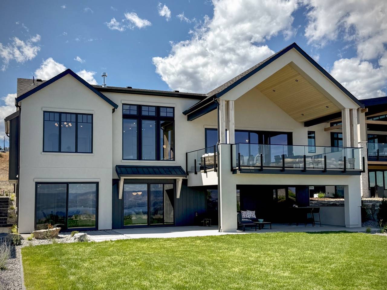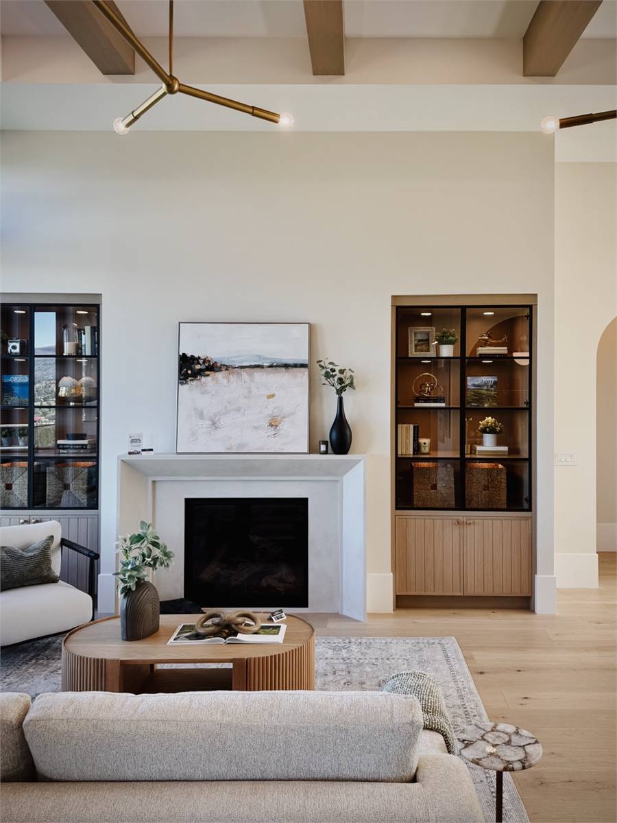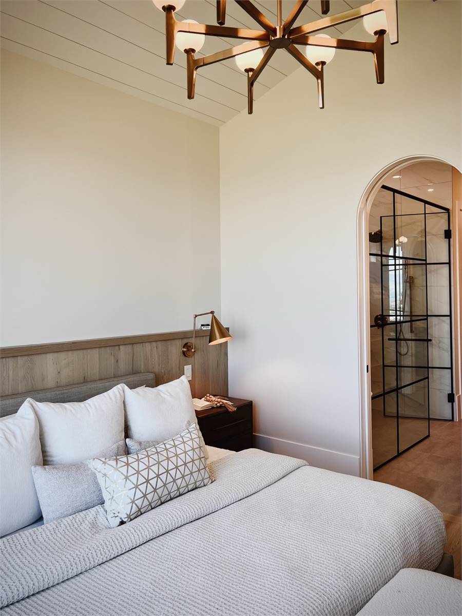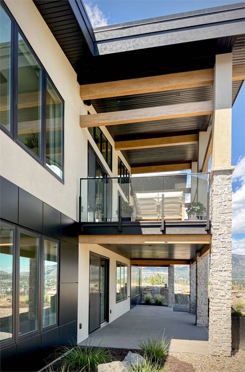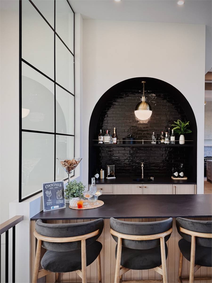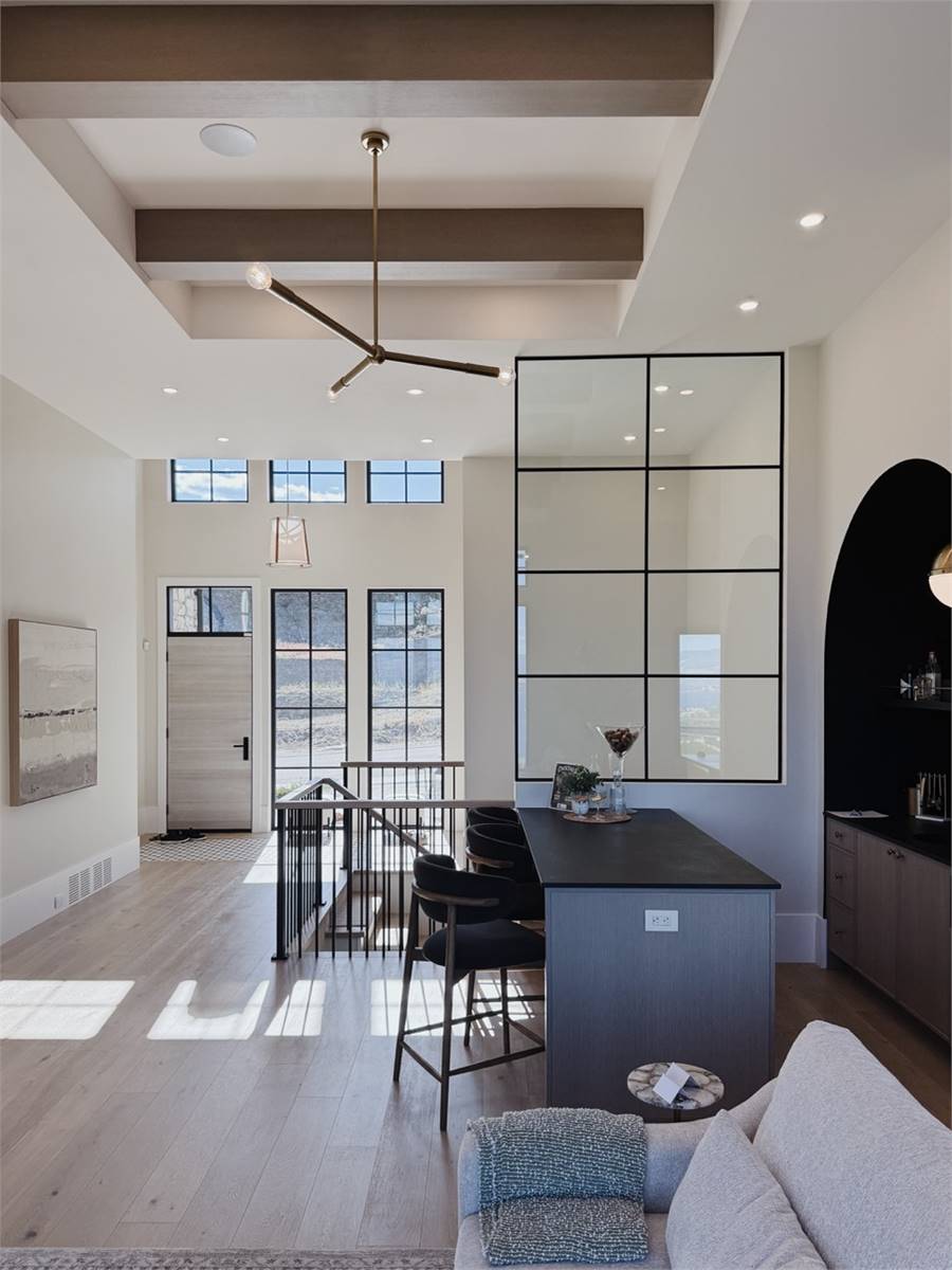 House Plan 10135, a GRAND ARDA AWARD (Model Homes) winning design, is a contemporary two-story home created for a sloping lot. The main level includes a vaulted foyer leading to a stylish bar area, a great room with a fireplace, and a modern kitchen with an island and walk-in pantry. This floor also features a primary bedroom with a spa-like ensuite and a versatile den or office. The lower level adds three bedrooms, two bathrooms, a recreation room with a bar, a gym area, and access to a covered patio, offering a seamless blend of comfort and modern indoor-outdoor living.