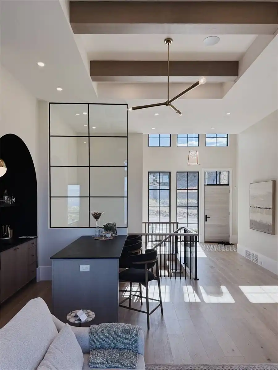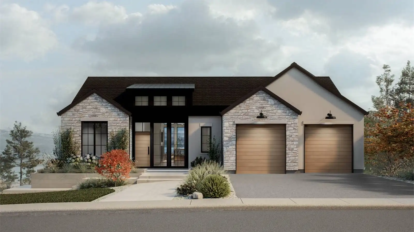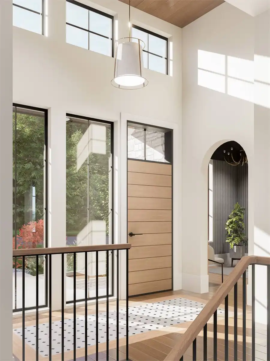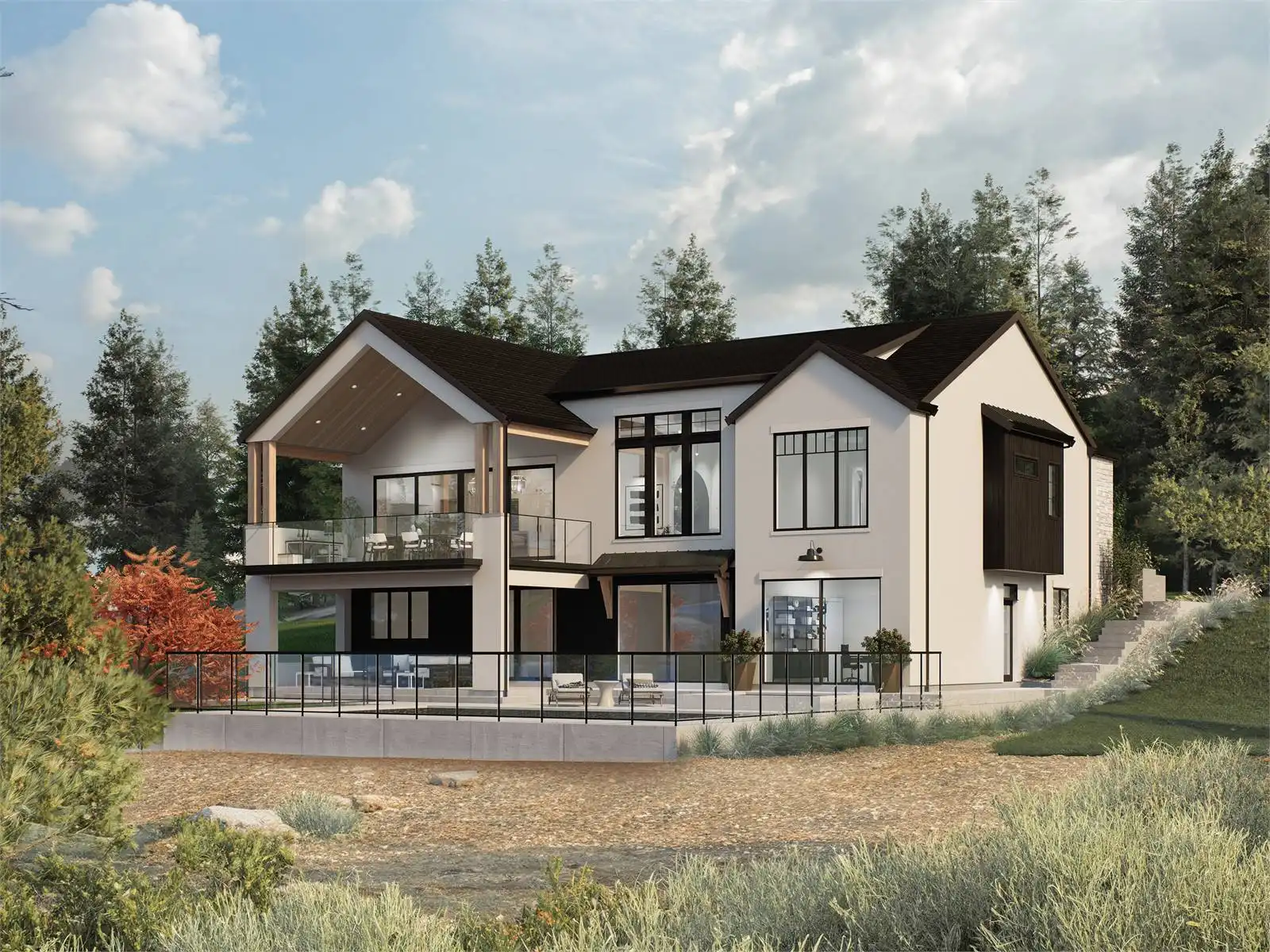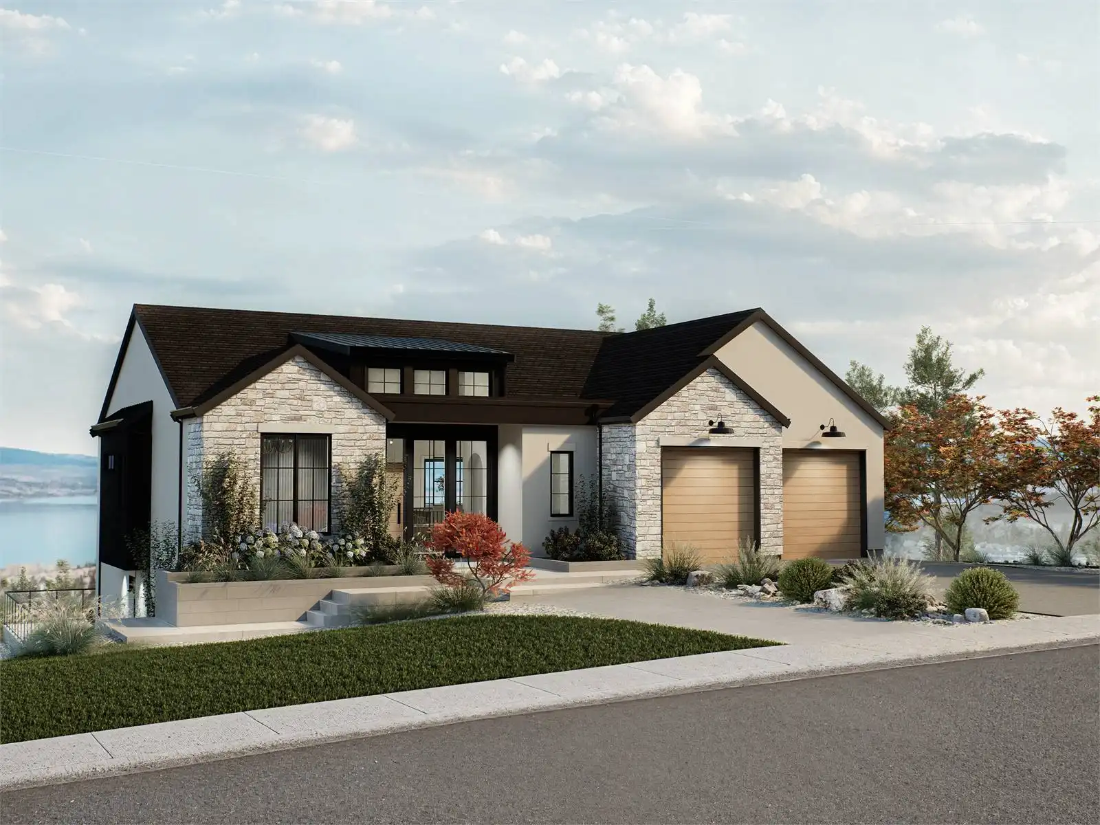 House Plan 10135, a GRAND ARDA AWARD (Model Homes) winning design, is a contemporary two-story home created for a sloping lot. The main level includes a vaulted foyer leading to a stylish bar area, a great room with a fireplace, and a modern kitchen with an island and walk-in pantry. This floor also features a primary bedroom with a spa-like ensuite and a versatile den or office. The lower level adds three bedrooms, two bathrooms, a recreation room with a bar, a gym area, and access to a covered patio, offering a seamless blend of comfort and modern indoor-outdoor living.