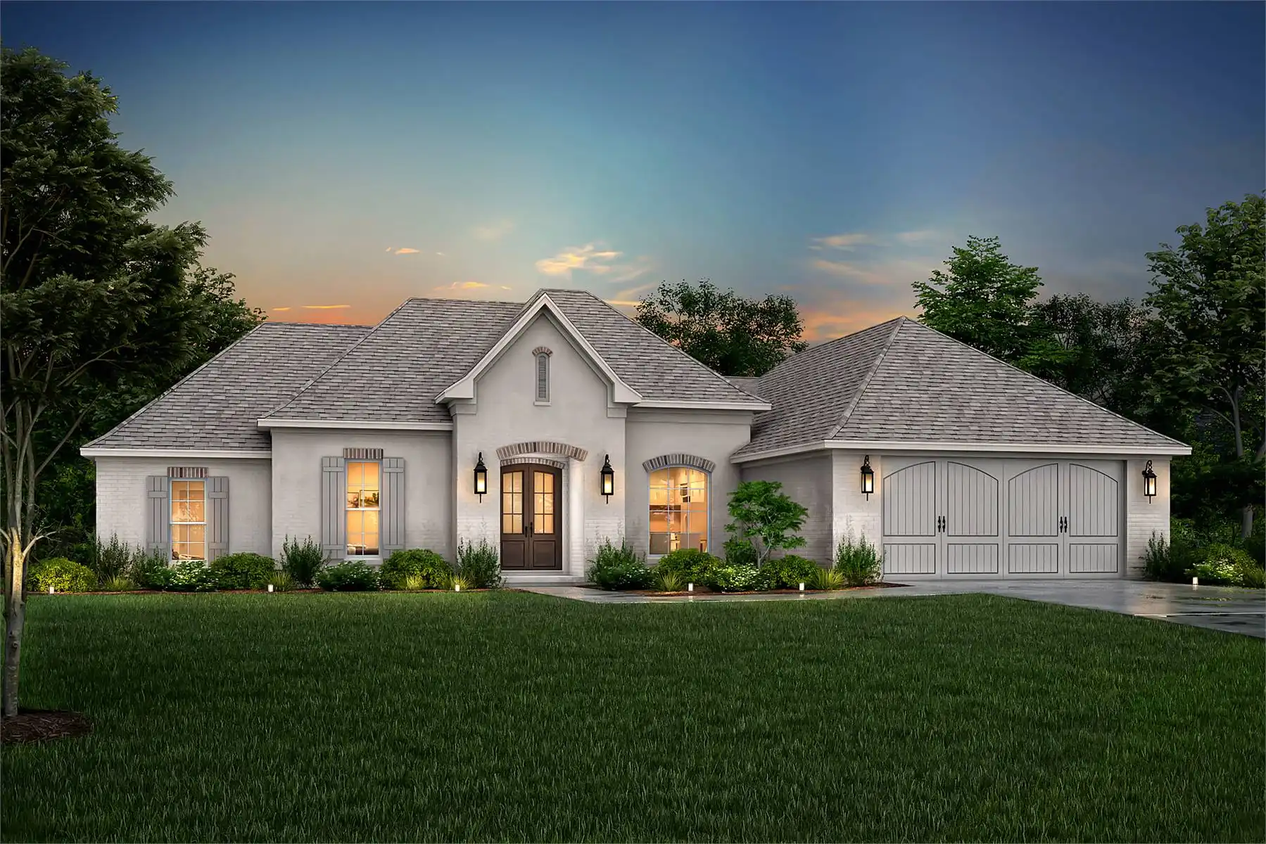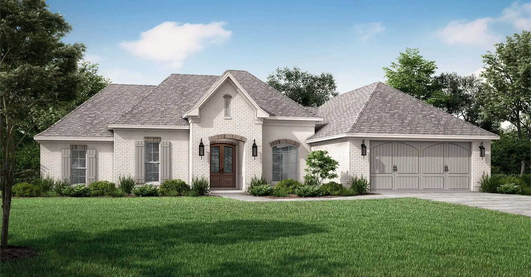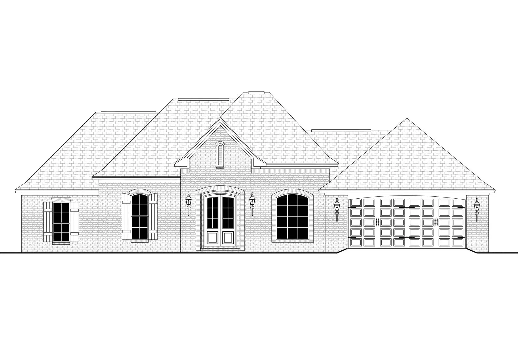 House Plan 10138 is a 4-bedroom, 2-bath country French home with an open layout that blends style and function. The foyer leads to a spacious great room with 10' ceilings, a gas fireplace, and large rear windows. The kitchen features a central island with raised bar, built-in pantry, and ample storage, perfect for entertaining. An oversized utility room adds convenience with a broom closet and locker area. The primary suite offers a luxurious retreat with a walk-in closet, dual sinks, jet tub, custom glass shower, and enclosed toilet room. Designed for comfort and elegance, this home is perfect for modern family living.