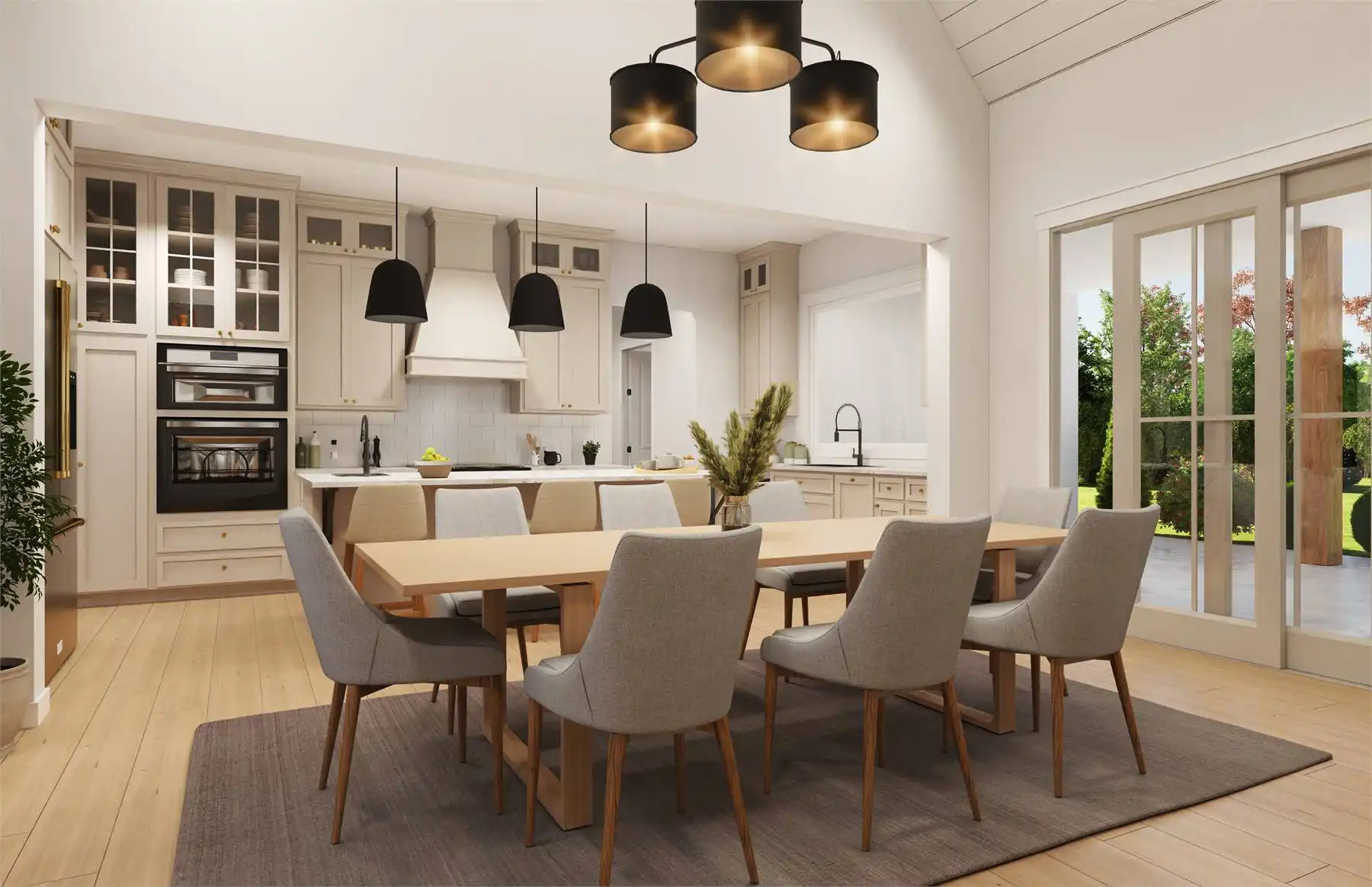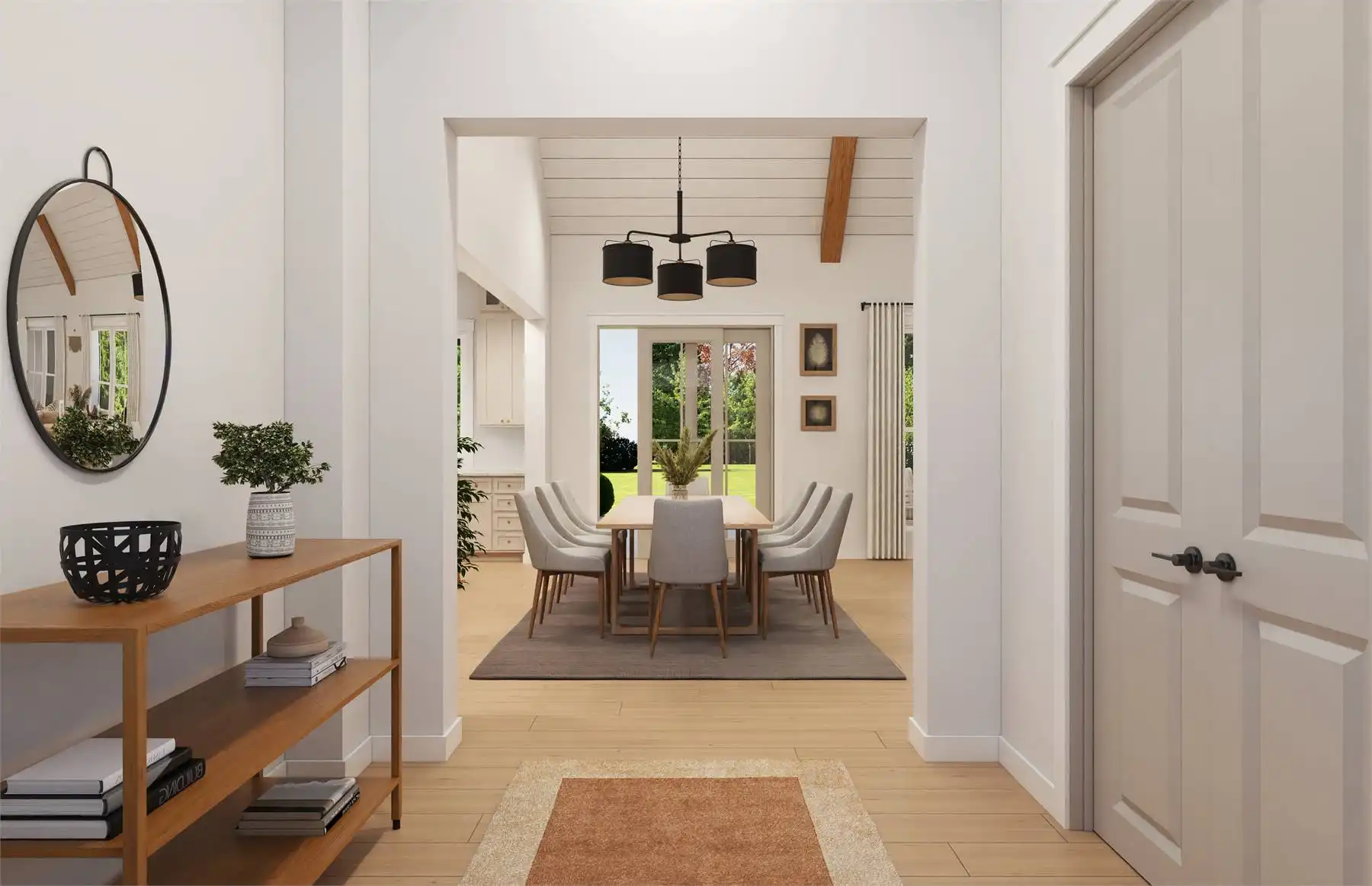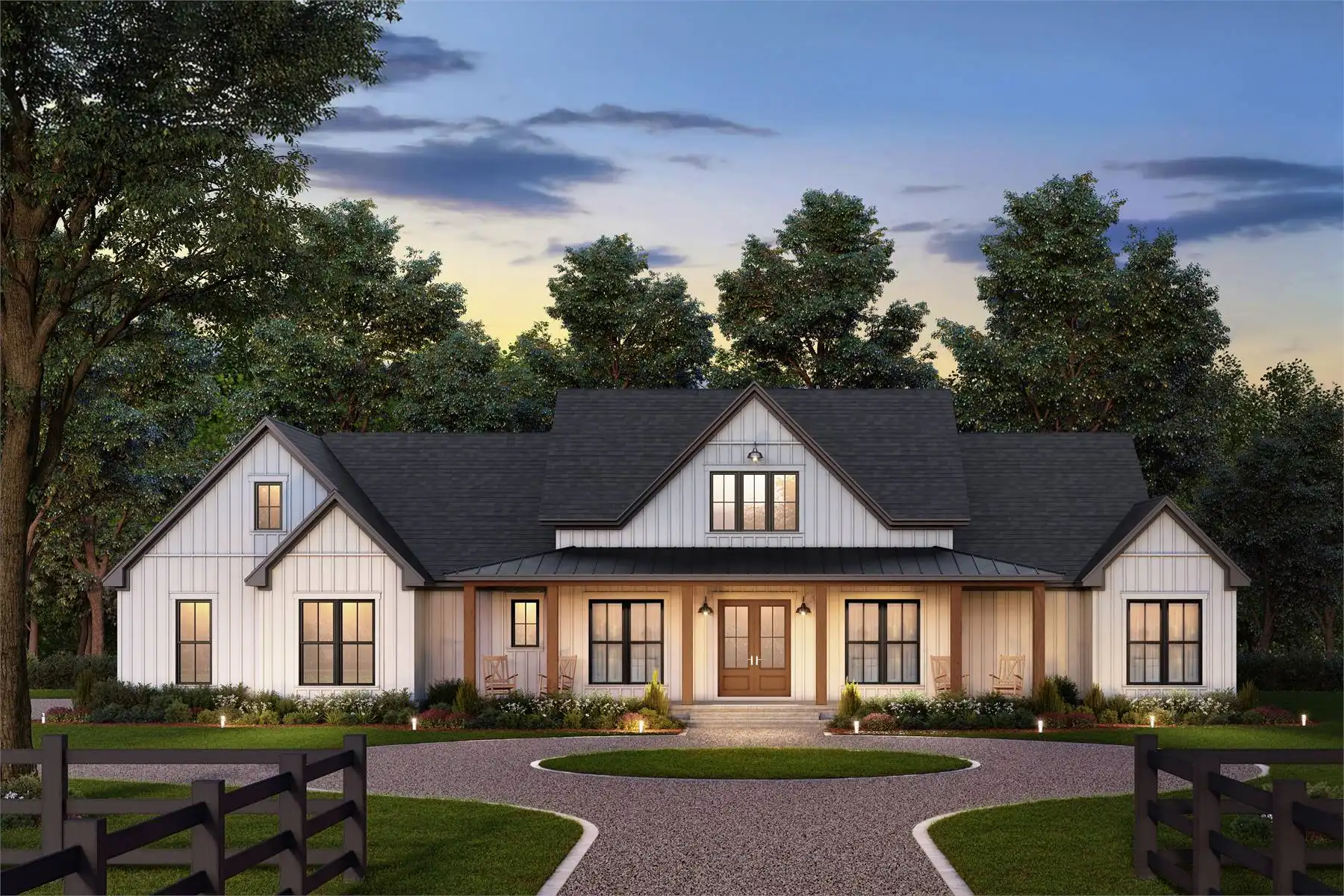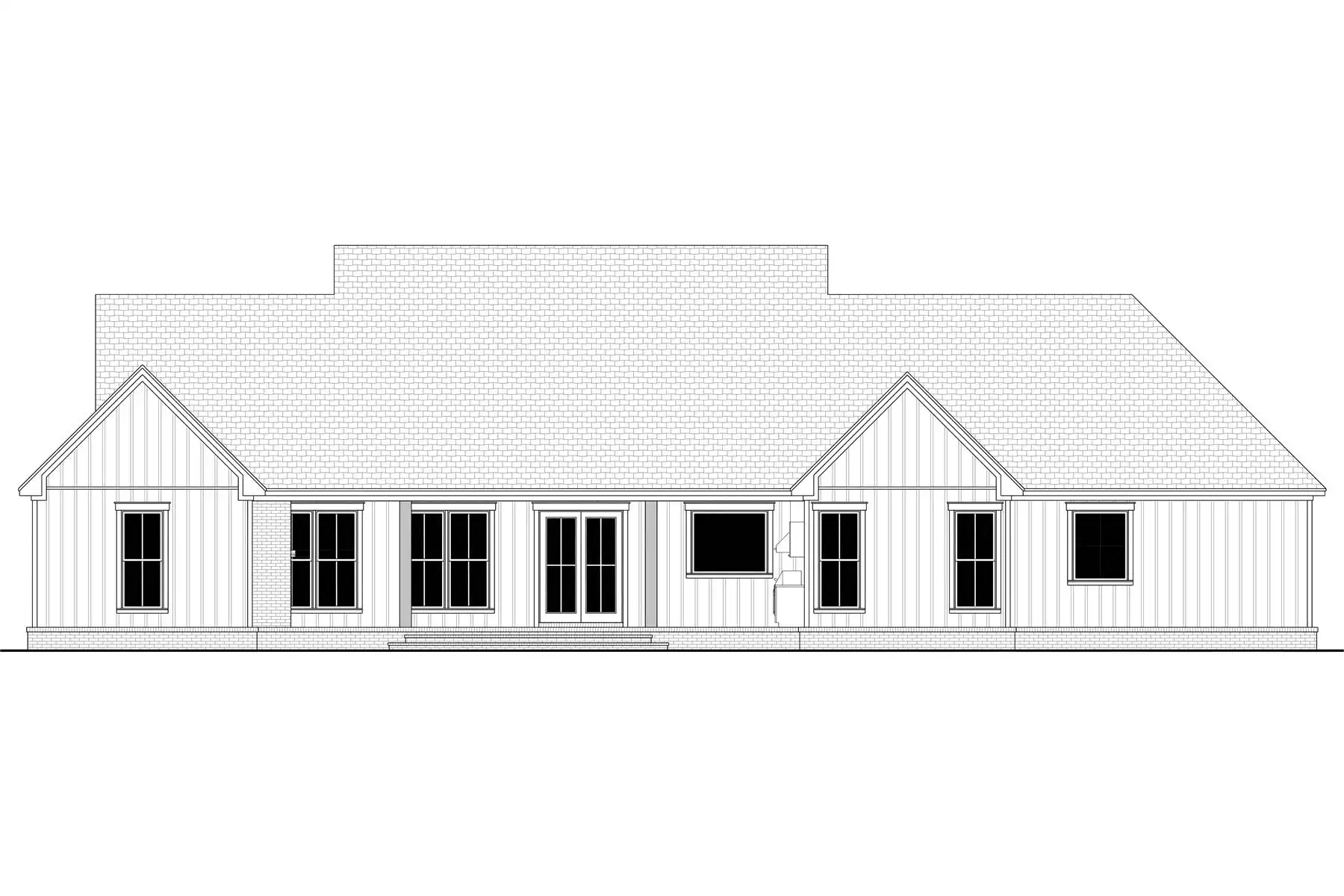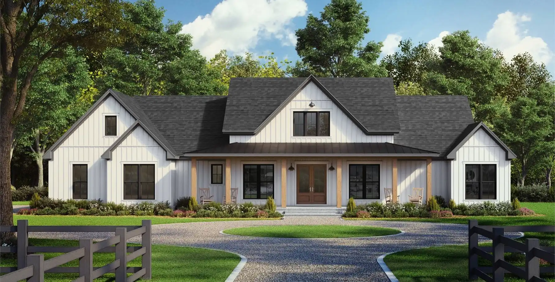House Plan 10140 is a thoughtfully designed 2,500 sq. ft. modern farmhouse home that blends timeless charm with modern practicality. This single-story layout includes 4 bedrooms and 3.5 bathrooms, making it perfect for families seeking both comfort and style. The open-concept great room and dining area feature soaring vaulted ceilings with decorative beams, creating an airy and welcoming space. At the heart of the home, the gourmet kitchen boasts a spacious island, walk-in pantry, and ample prep space, seamlessly connecting to the main living areas. The primary suite serves as a private retreat, offering a vaulted ceiling, spa-like en-suite with a freestanding tub, and a generous walk-in closet. Functional spaces like a home office, oversized laundry room, and a three-car garage with extra storage add everyday convenience. Outdoor living is a highlight, with expansive front and rear porches, a built-in outdoor kitchen, and a cozy fireplace for year-round enjoyment. Blending elegance and practicality, House Plan 10140 is an exceptional choice for those seeking a refined yet inviting home.
