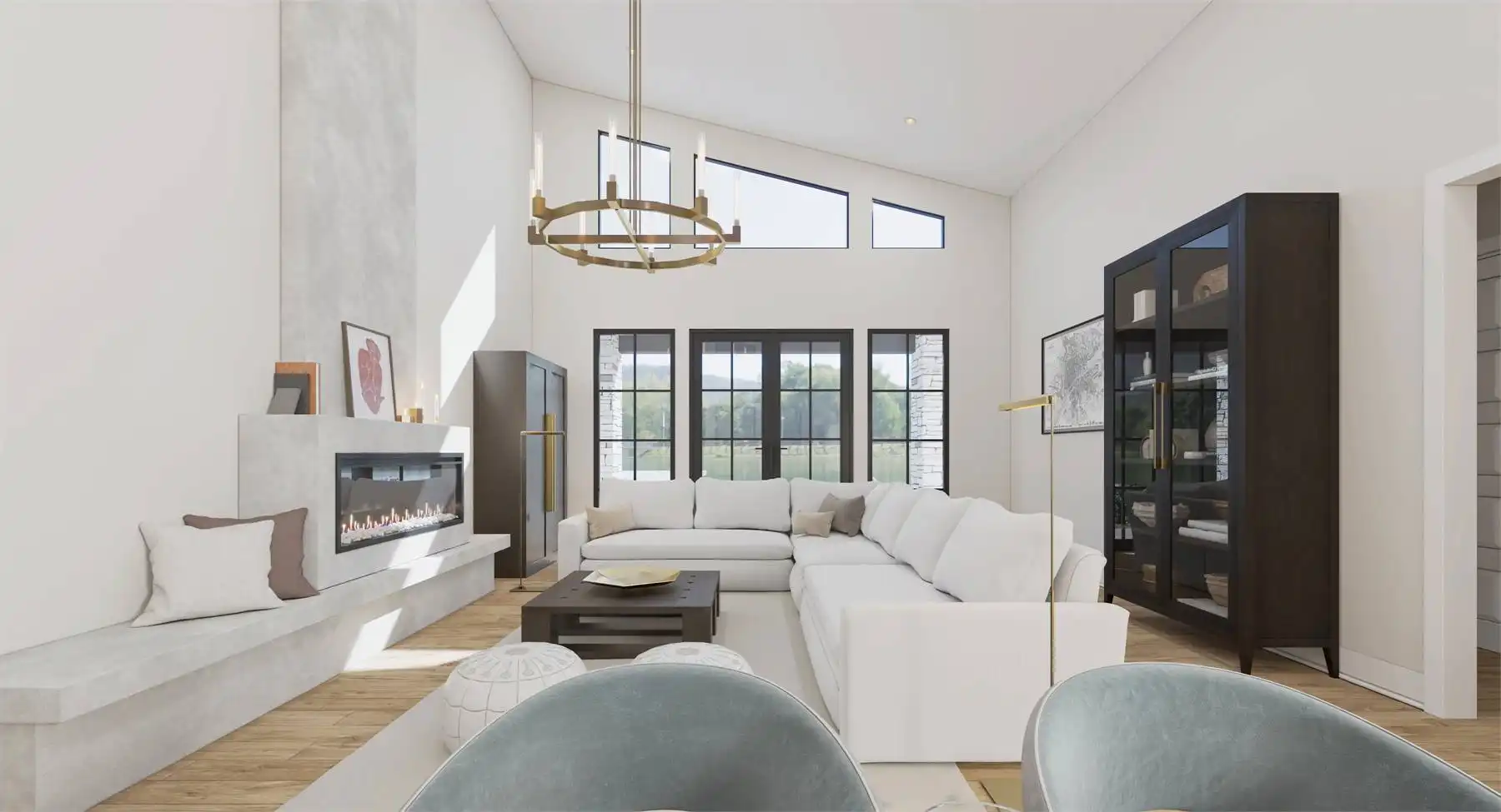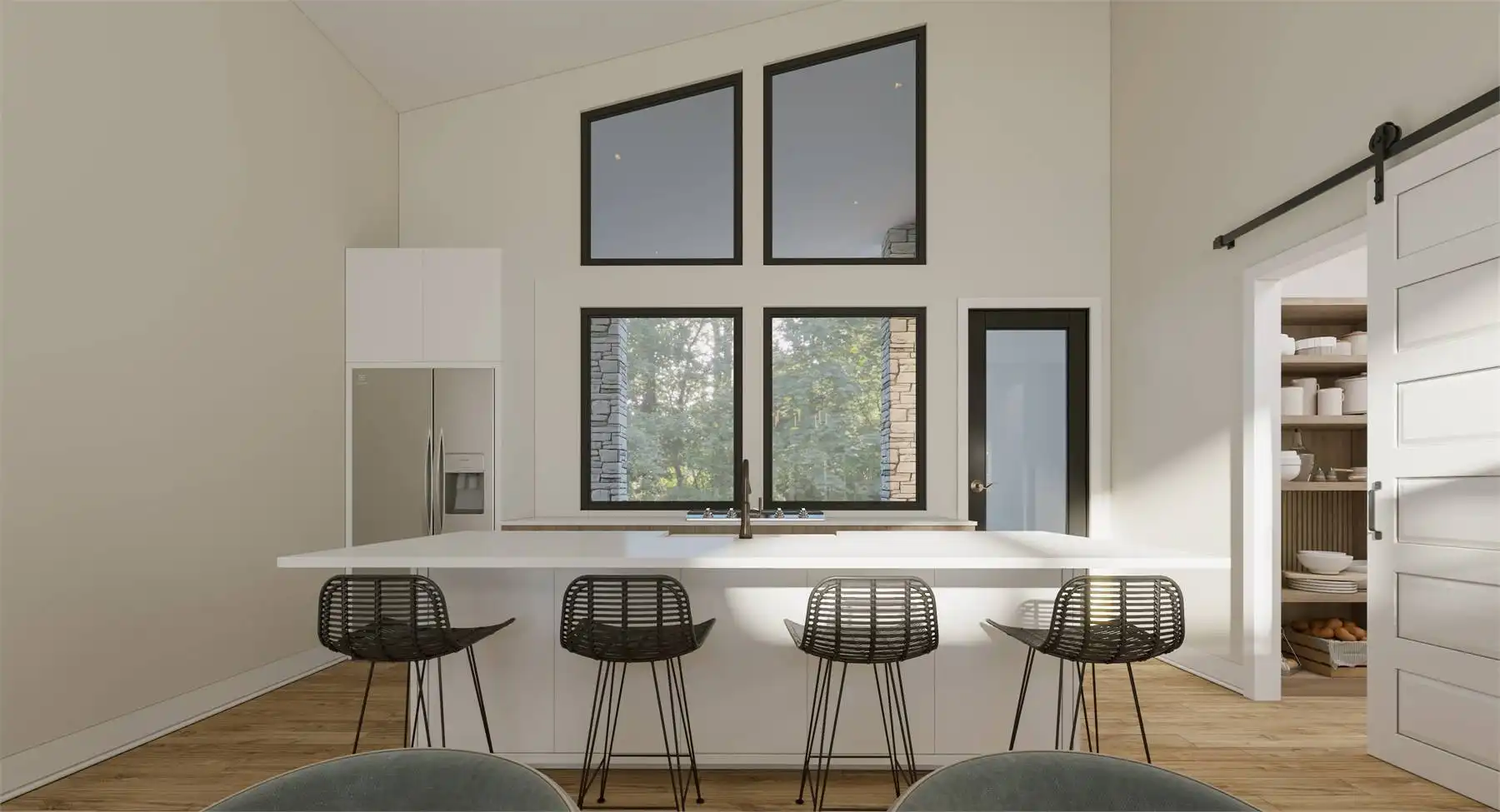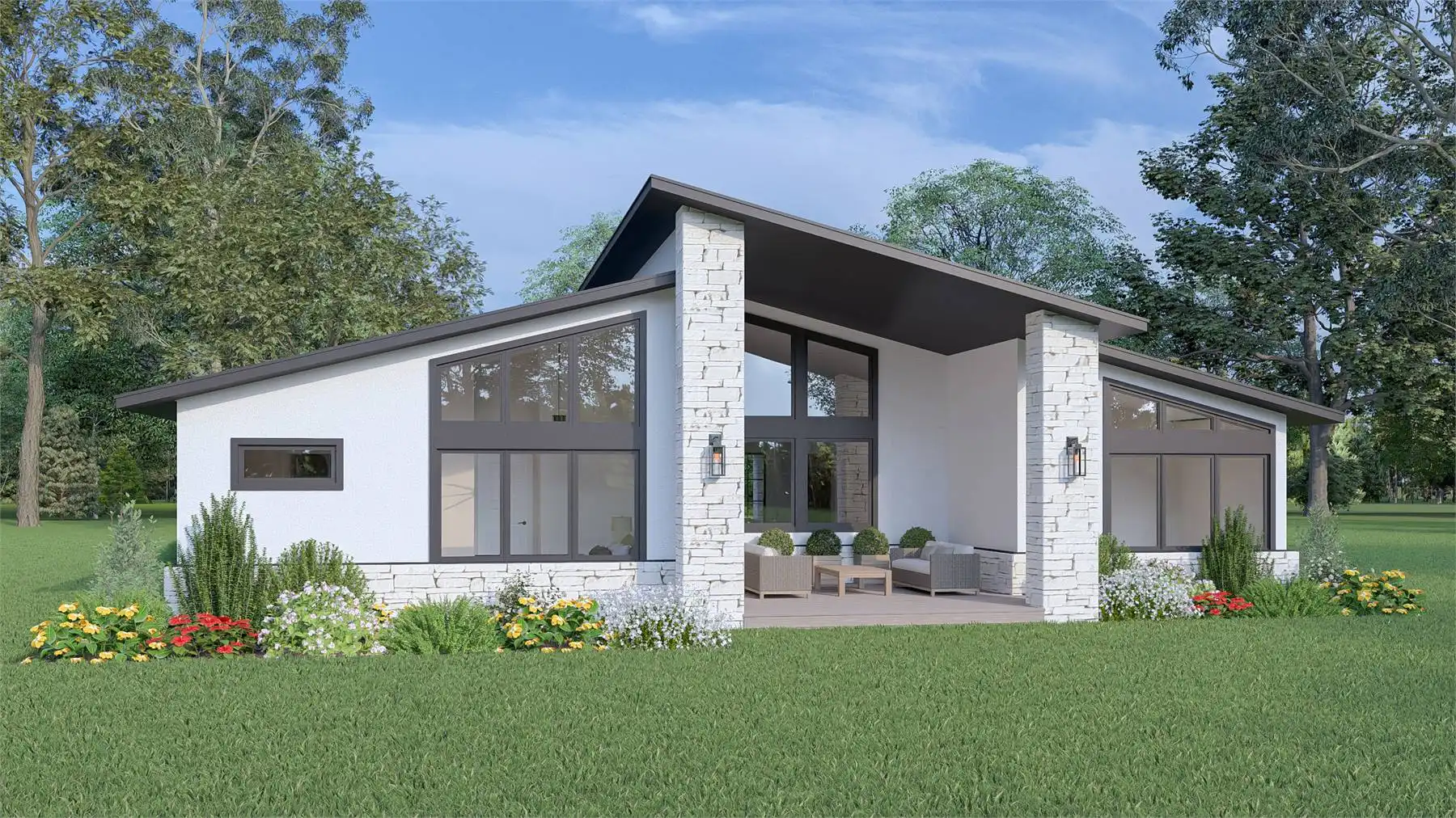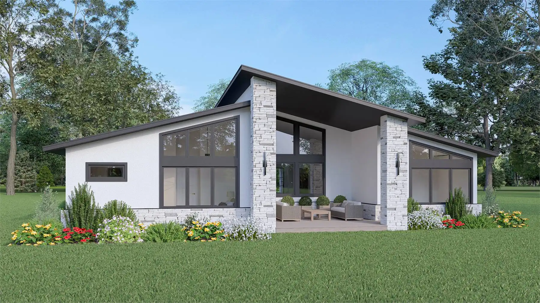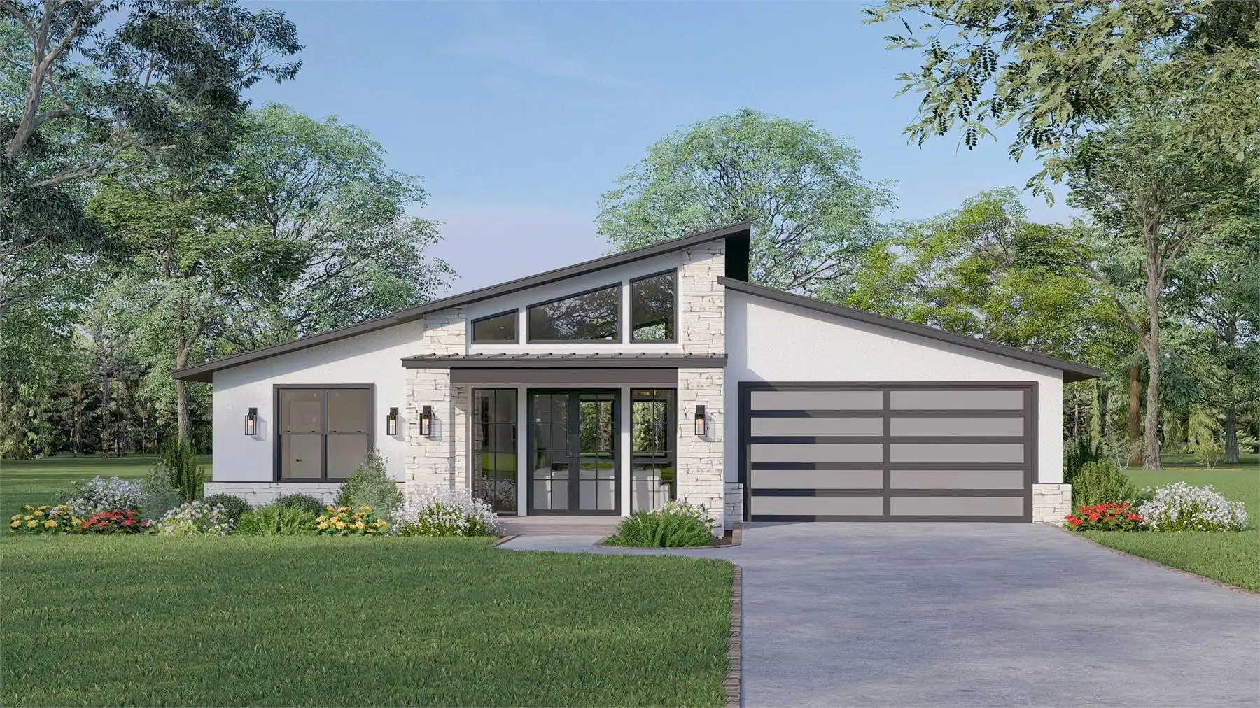 House Plan 10153 is a great modern ranch that's made to serve a family well with 2,047 square feet, four split bedrooms, and three bathrooms. The open-concept floor plan in the center of the house has totally clear sightlines from the family room with a fireplace, to the dining area, to the island kitchen in back with a walk-in pantry and access to the back porch. A vaulted ceiling spreads across the whole great room and back porch! The mudroom hallway on one side of this connects to the two-car garage, the laundry room, and the primary suite with a vaulted bedroom and a luxurious Euro-style bath. On the opposite side of the house, there's a pair of Jack-and-Jill bedrooms as well as another vaulted bedroom beside a full hall bath.
