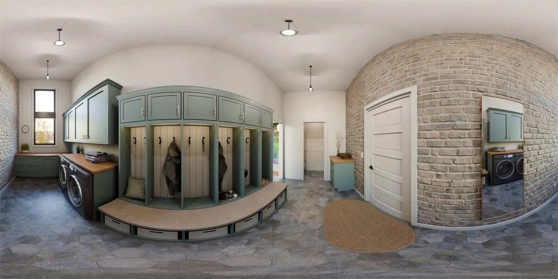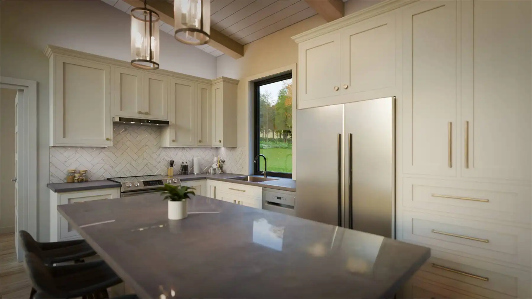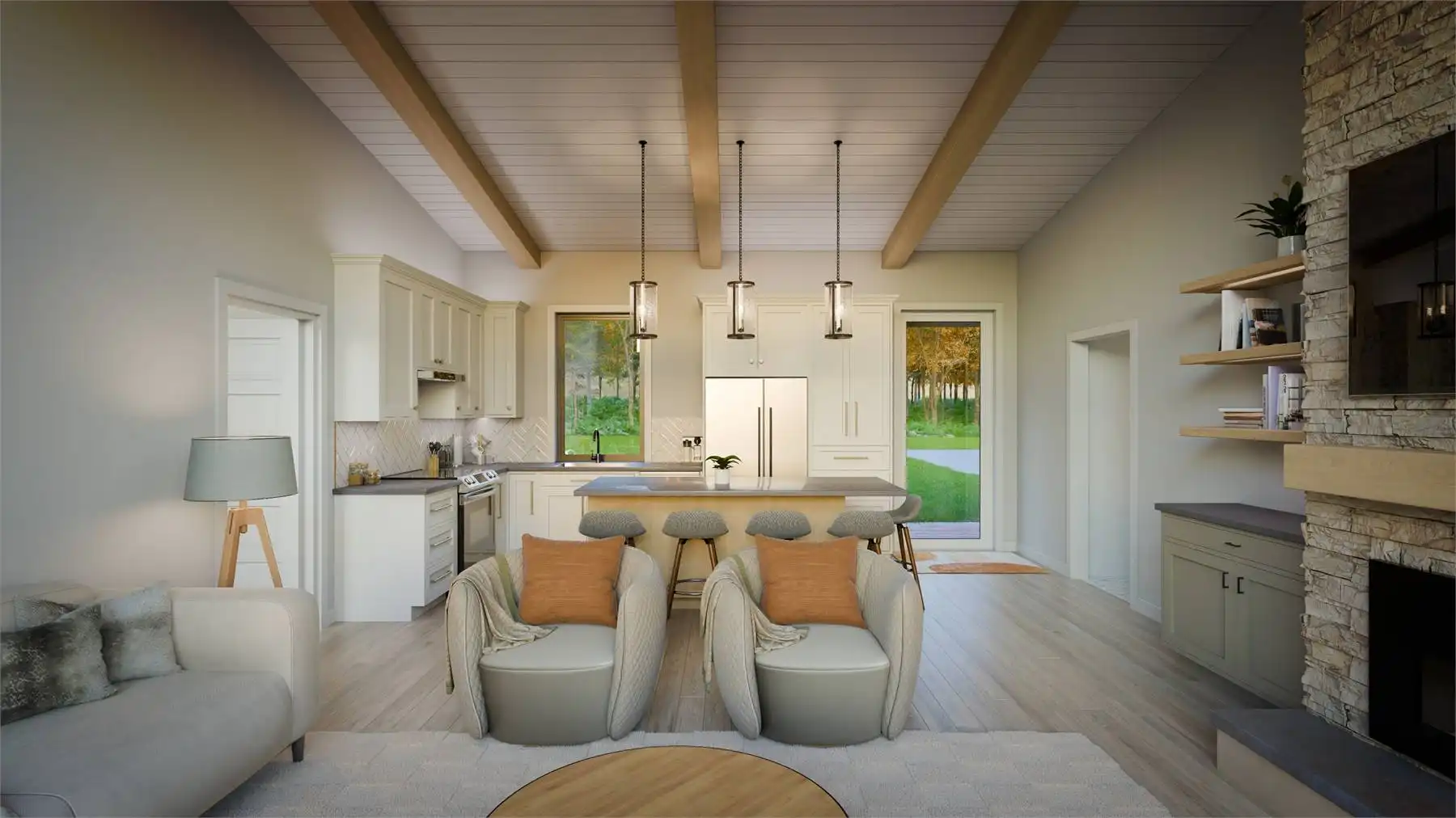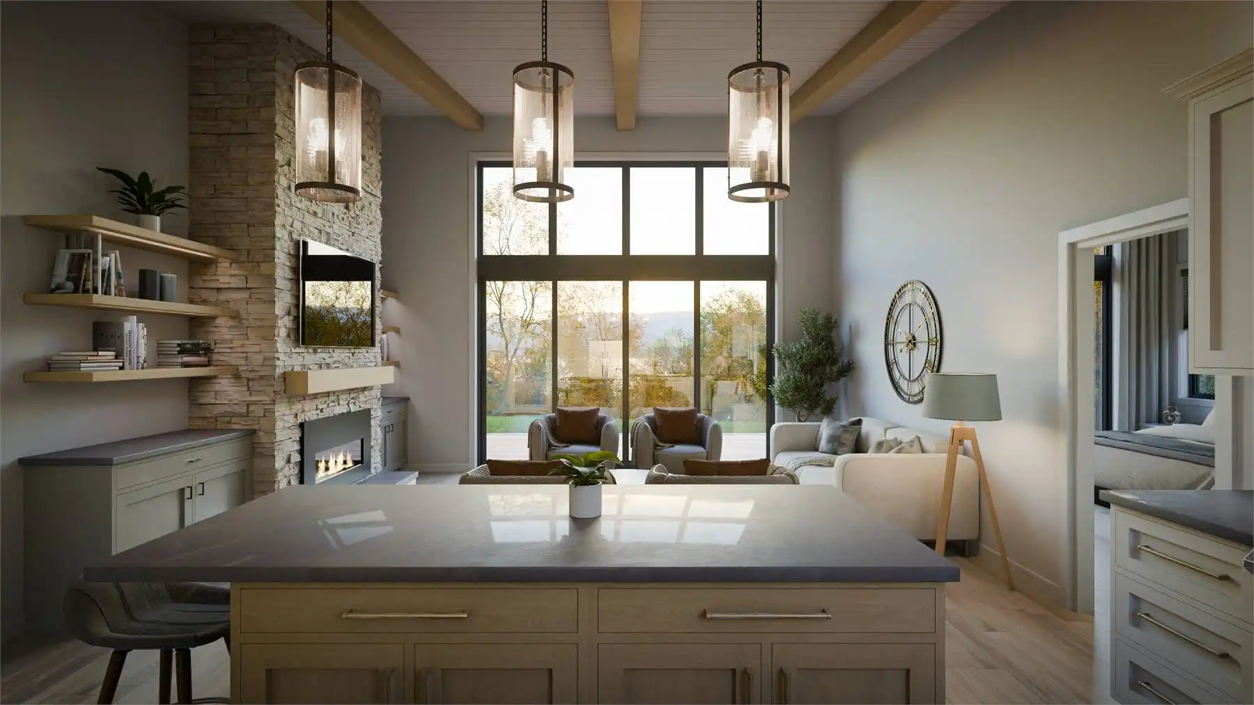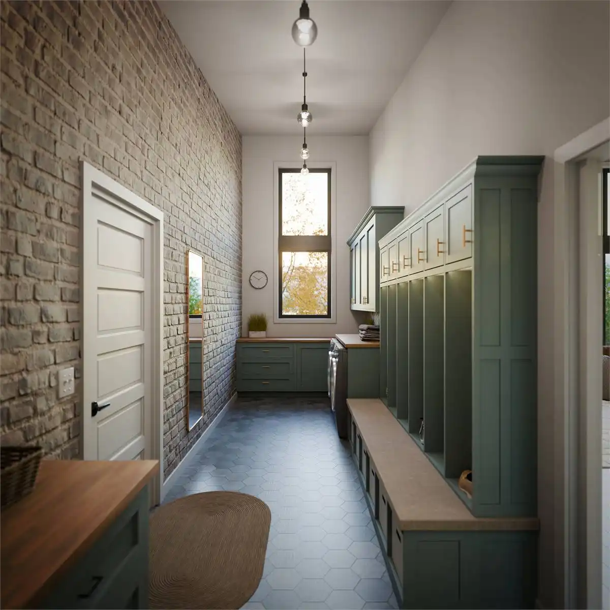 Floor-to-ceiling rear windows maximize views and natural light, creating a bright and open feel. A convenient drop zone with laundry and storage keeps things organized.
