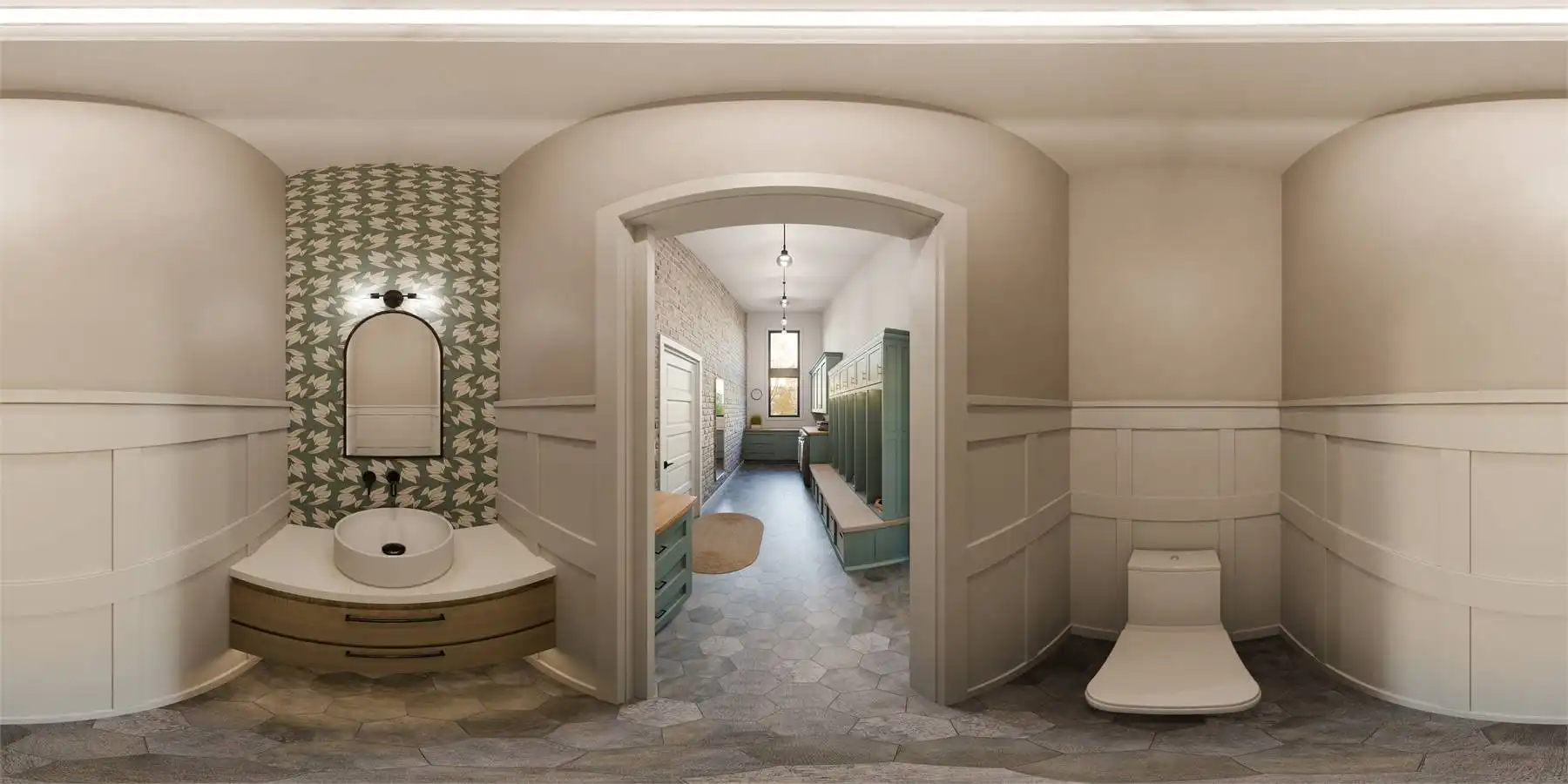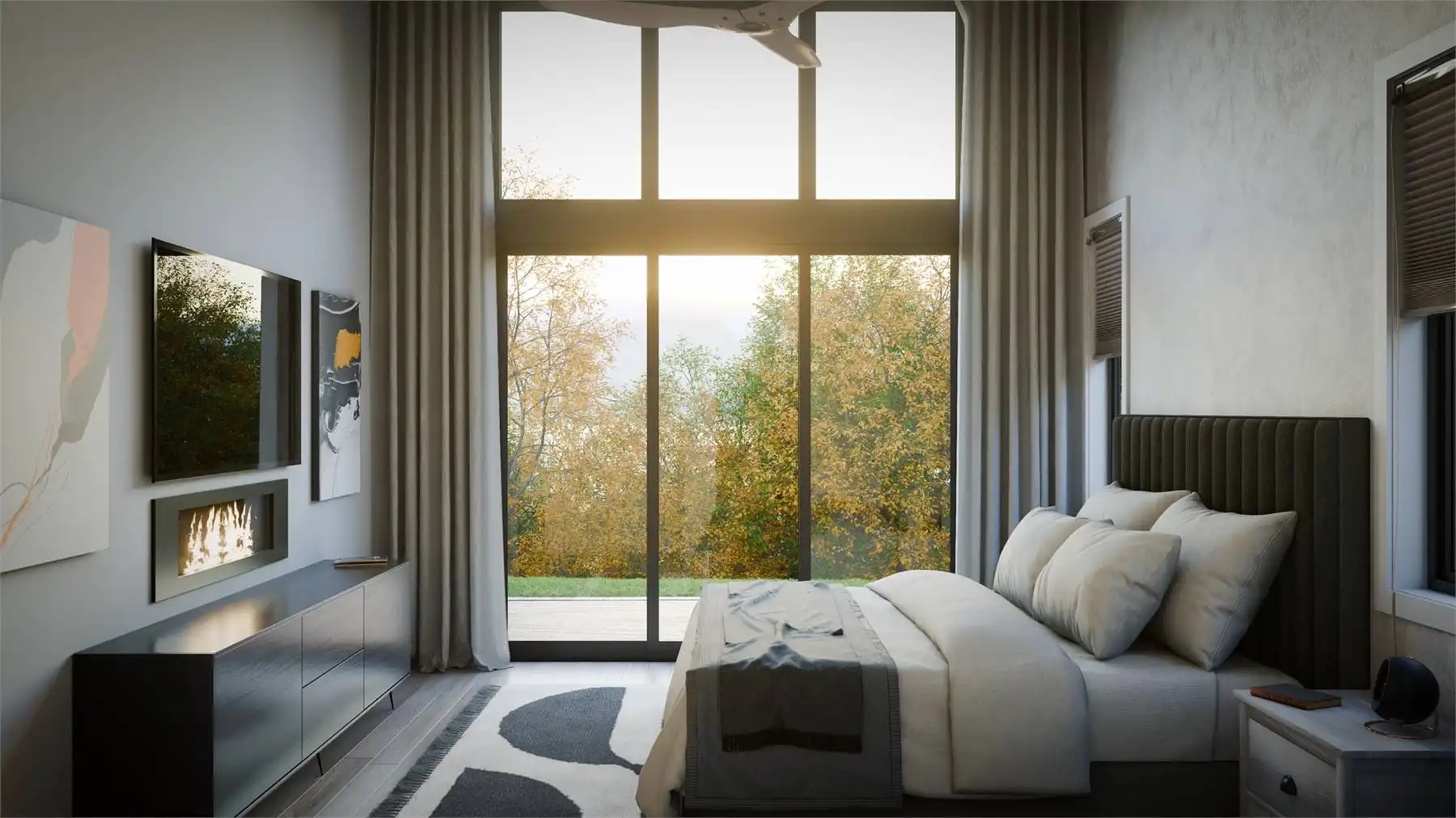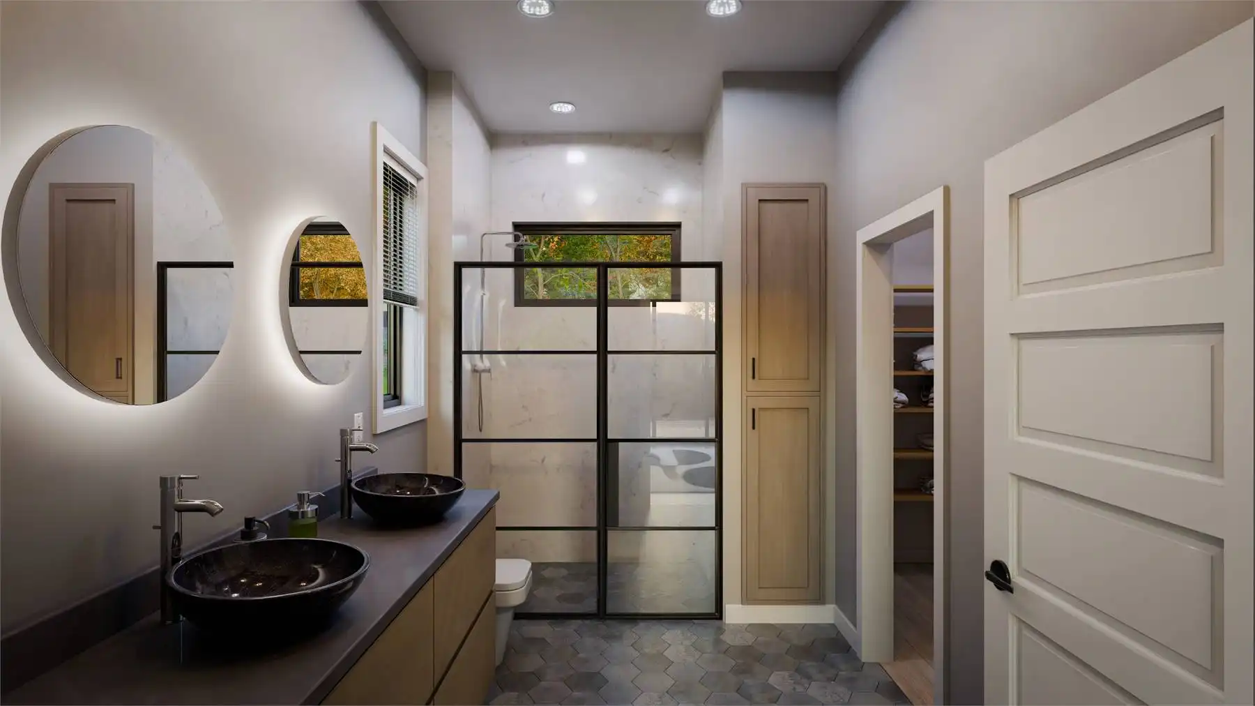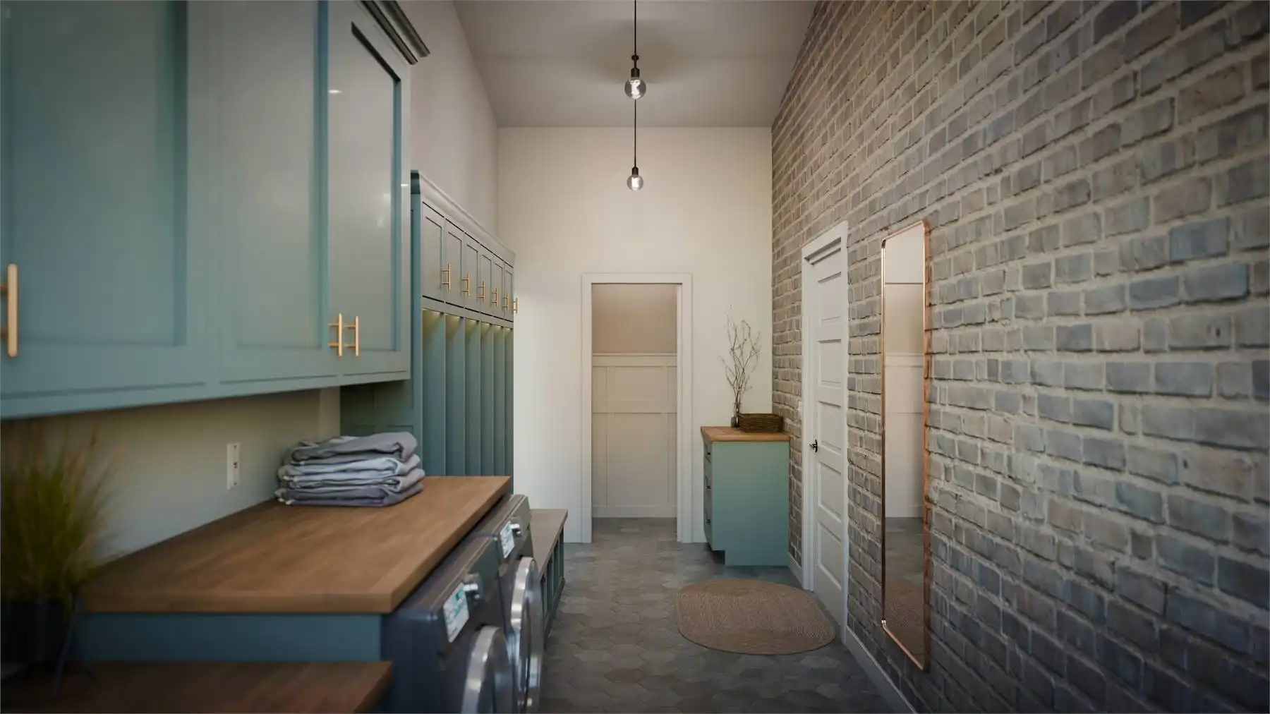 Floor-to-ceiling rear windows maximize views and natural light, creating a bright and open feel. A convenient drop zone with laundry and storage keeps things organized.