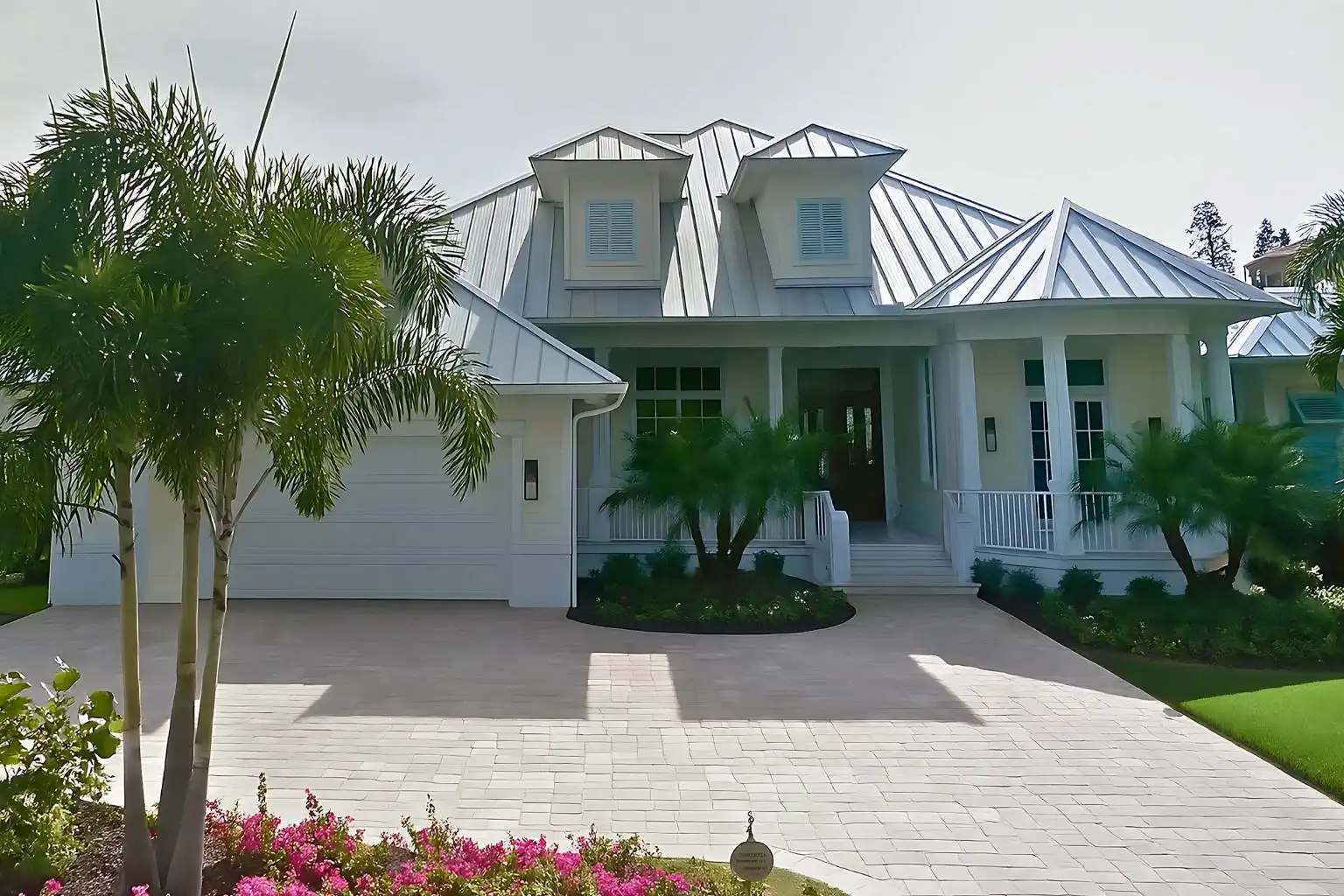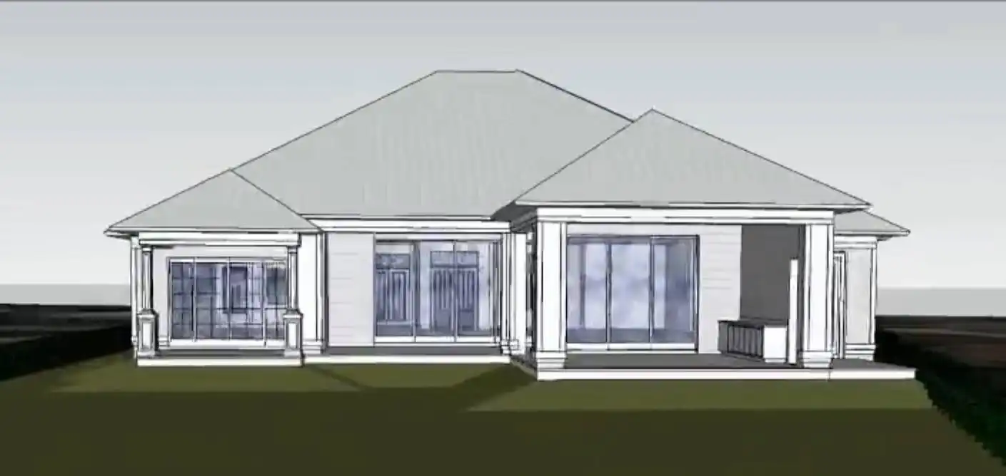 House Plan is a luxurious Florida-style home on one level with 3,140 square feet, three bedrooms, and four-and-a-half bathrooms. The layout includes open-concept living with an island kitchen, large great room, and dining nook, bedroom suites split on opposite sides of the house, and a study. Make sure not to overlook the outdoor potential with a BBQ kitchen and a full exterior bath for pool parties!