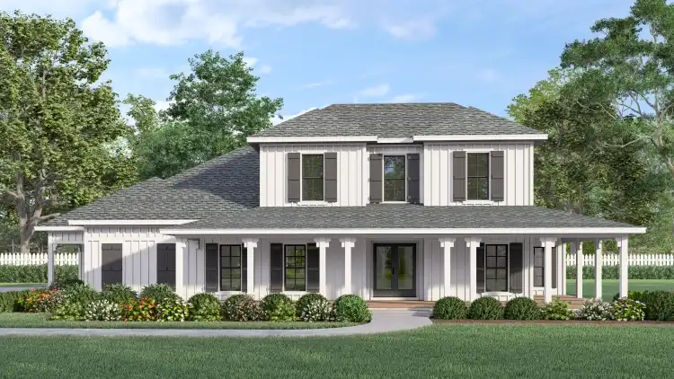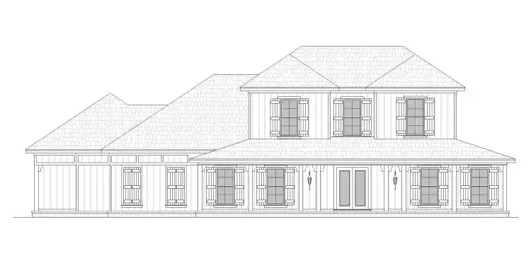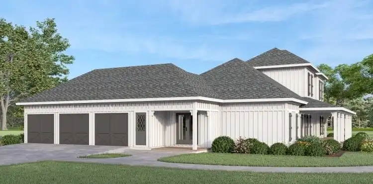 House Plan 10176 is an amazing home at a great size! Made for multi-generational living, it offers 2,410 square feet with four bedrooms and three-and-a-half bathrooms, including two full five-piece suites on opposite sides of the main level. That's perfect for in-laws, returning adult children, and hosting weekend guests in total comfort! The other two bedrooms share a Jack-and-Jill bathroom upstairs. The common areas of this home include formal dining, a huge peninsula kitchen, vaulted living, and ample porch space in front and back. Don't miss the large three-car garage in back with side entry--it even has extra storage closets!