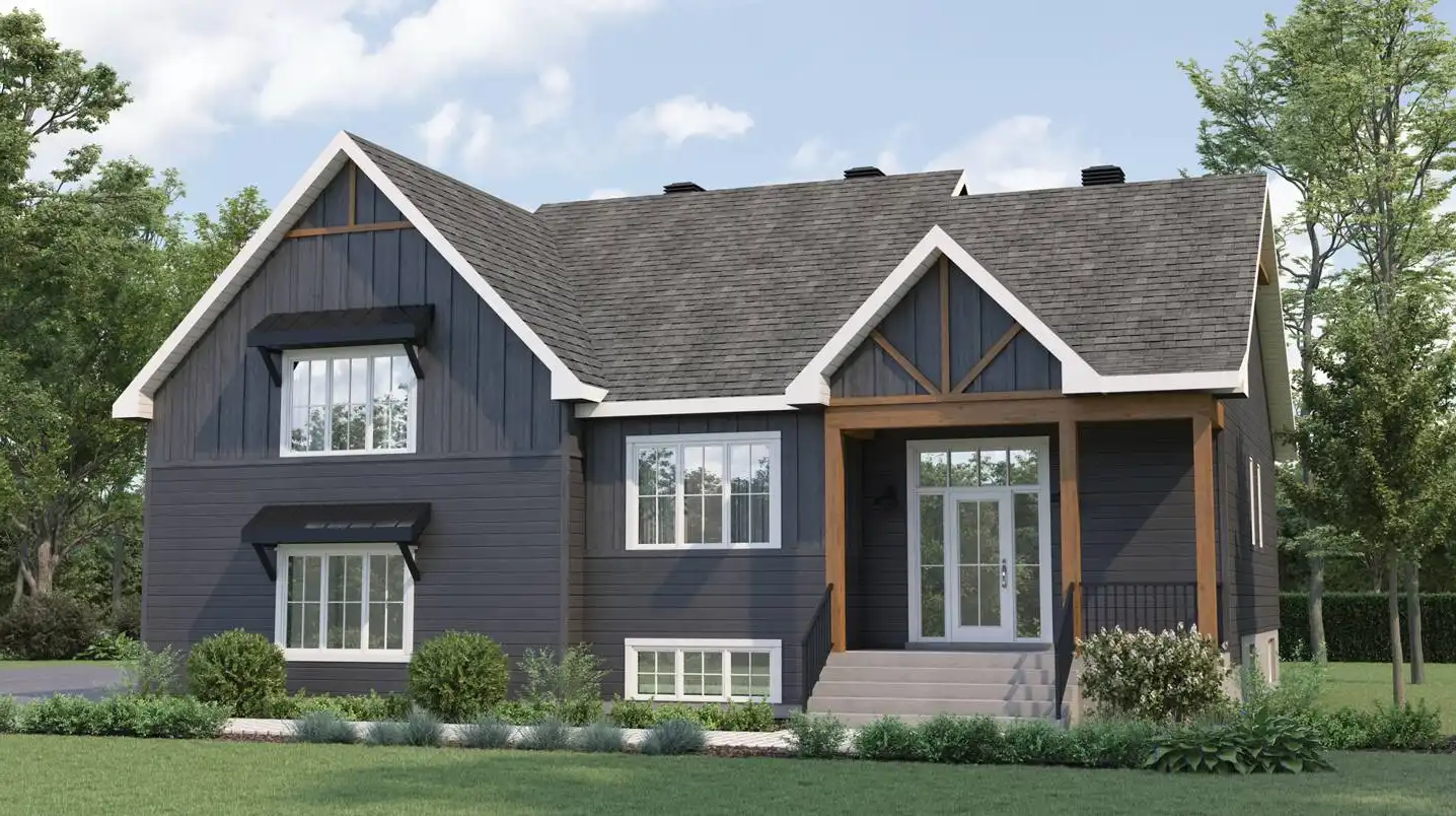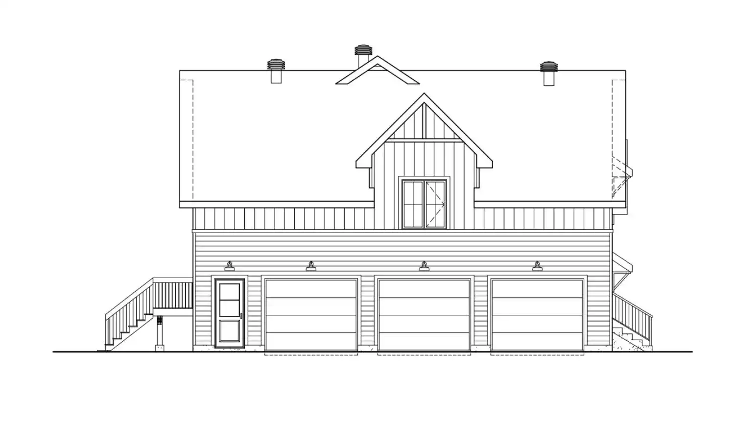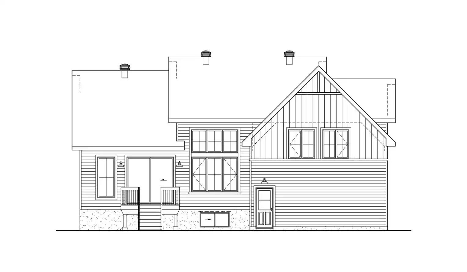 House Plan 10184 will captivate you with its hint of wood against unique farmhouse lines. The 2,045-square-foot layout is best described as split-level, with the main level up from the entry and the bedrooms over the side-entry garage. The main floor has all the common areas, a large laundry room with powder room facilities, and a large vestibule with an enclosed closet. Check out the size of that kitchen island overlooking the living and dining areas! The second floor has all three bedrooms, one of which is the primary bedroom with a large walk-in closet and a private five-piece bathroom. The other two bedrooms share a hall bathroom.