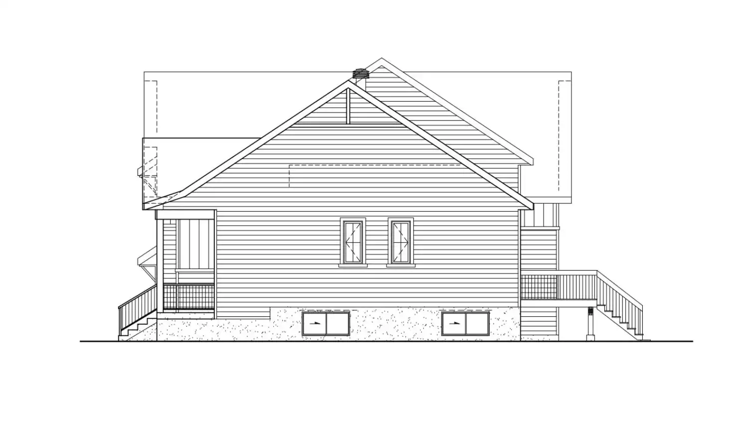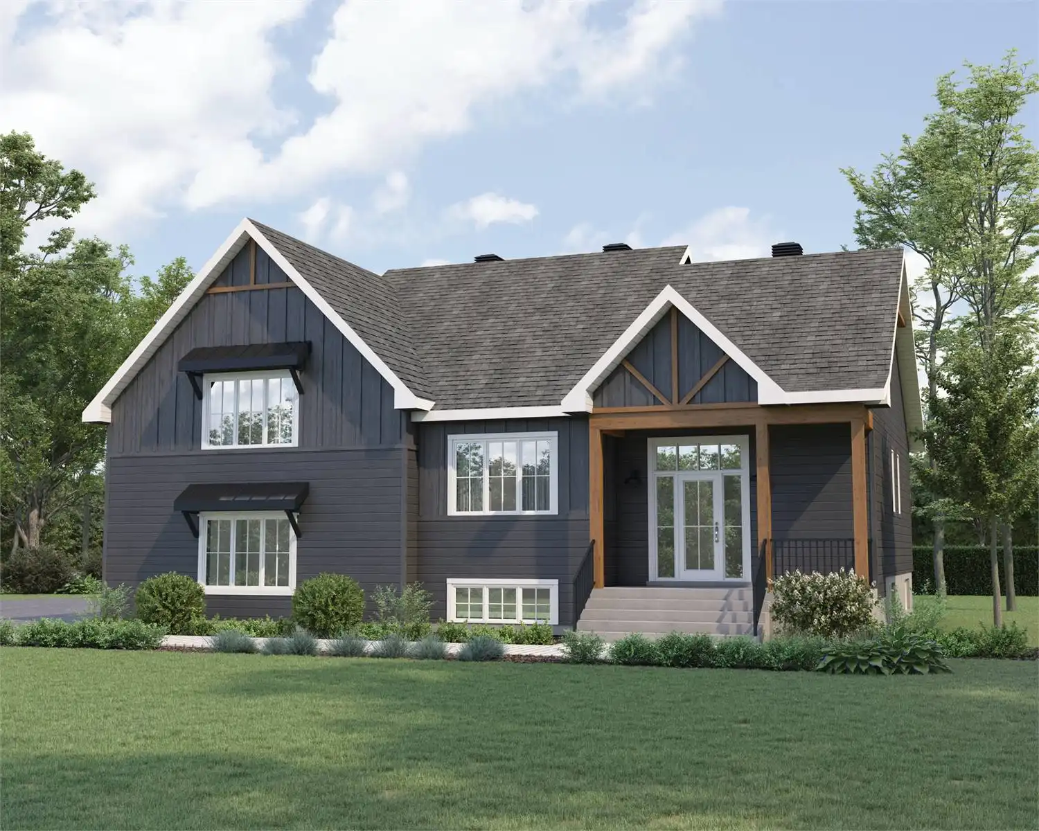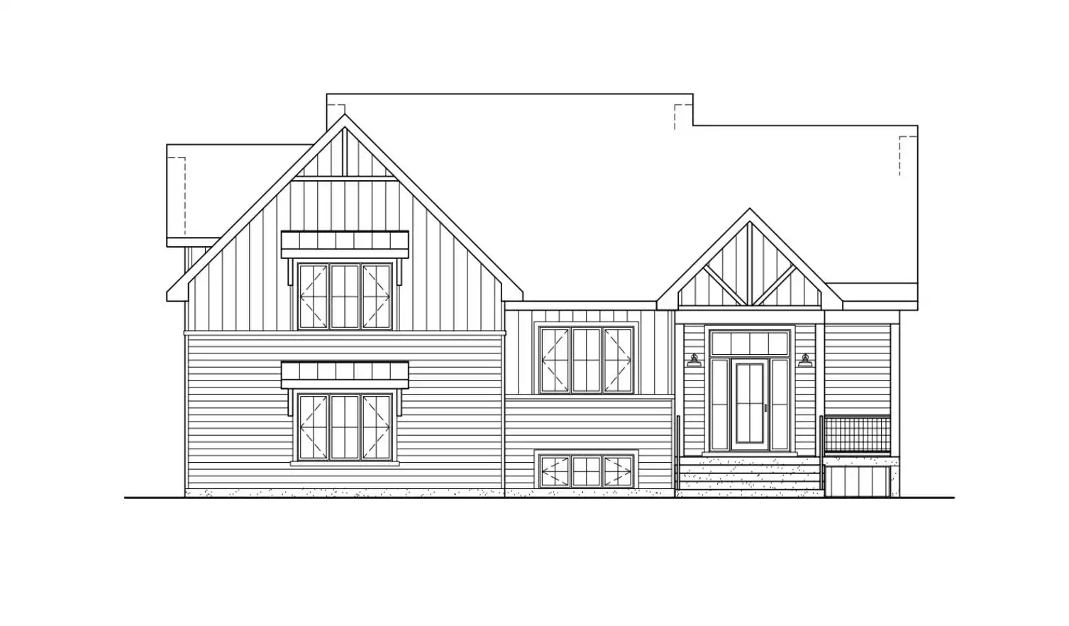 House Plan 10184 will captivate you with its hint of wood against unique farmhouse lines. The 2,045-square-foot layout is best described as split-level, with the main level up from the entry and the bedrooms over the side-entry garage. The main floor has all the common areas, a large laundry room with powder room facilities, and a large vestibule with an enclosed closet. Check out the size of that kitchen island overlooking the living and dining areas! The second floor has all three bedrooms, one of which is the primary bedroom with a large walk-in closet and a private five-piece bathroom. The other two bedrooms share a hall bathroom.