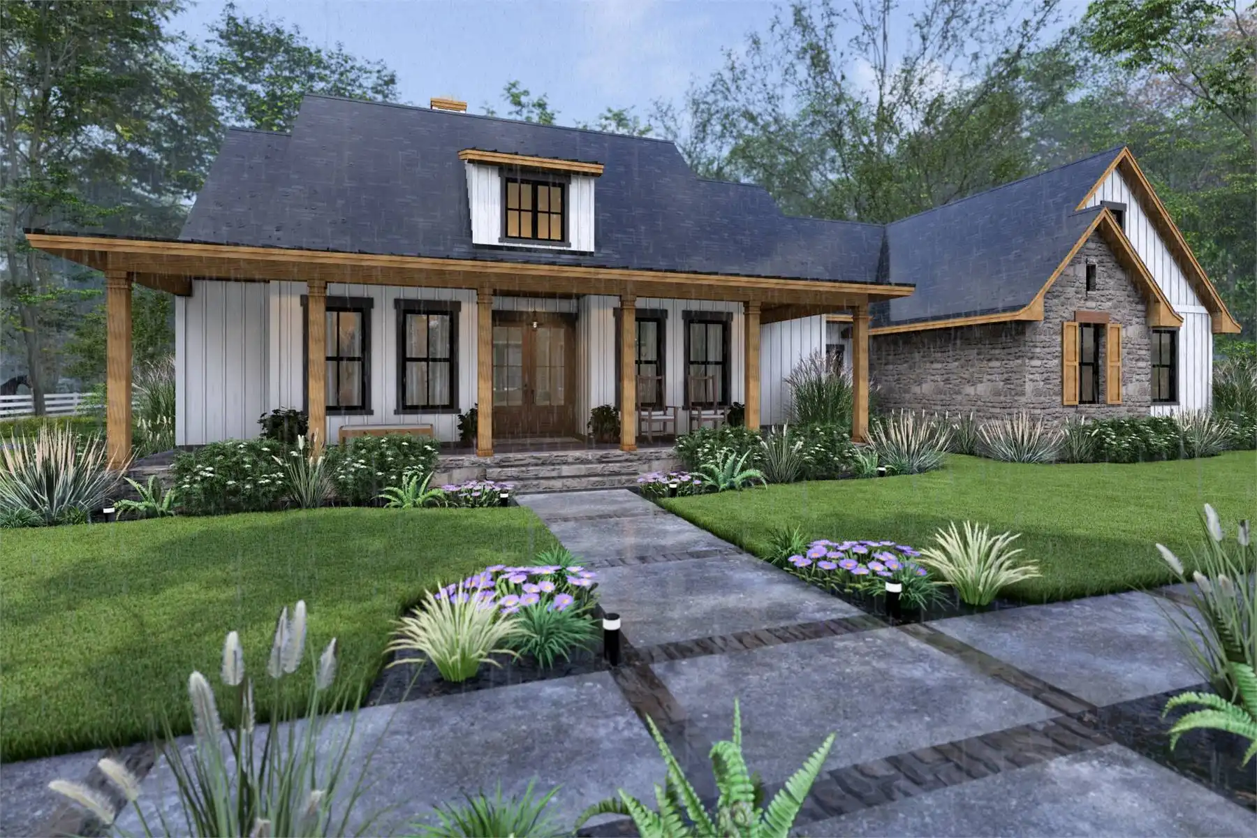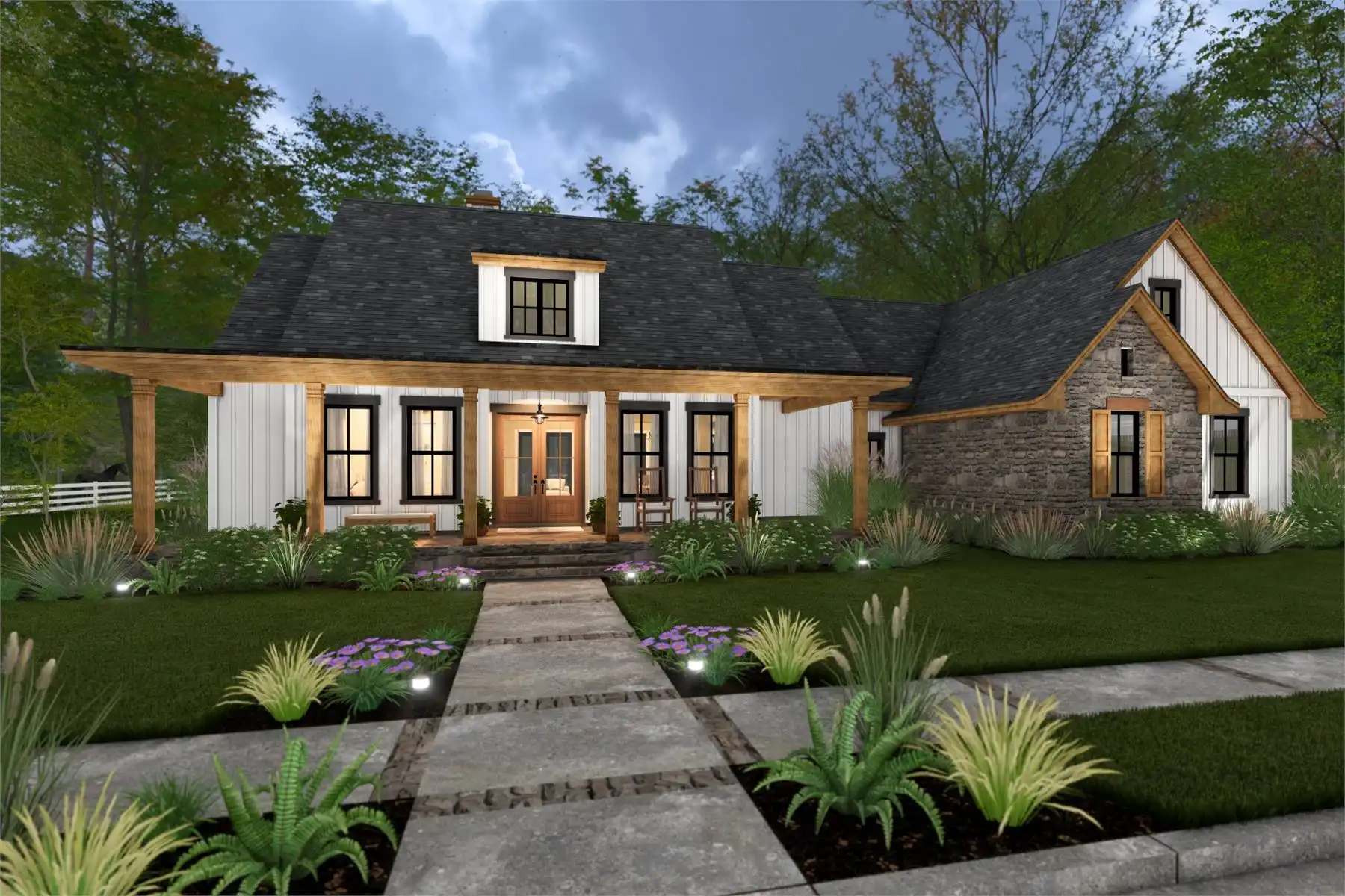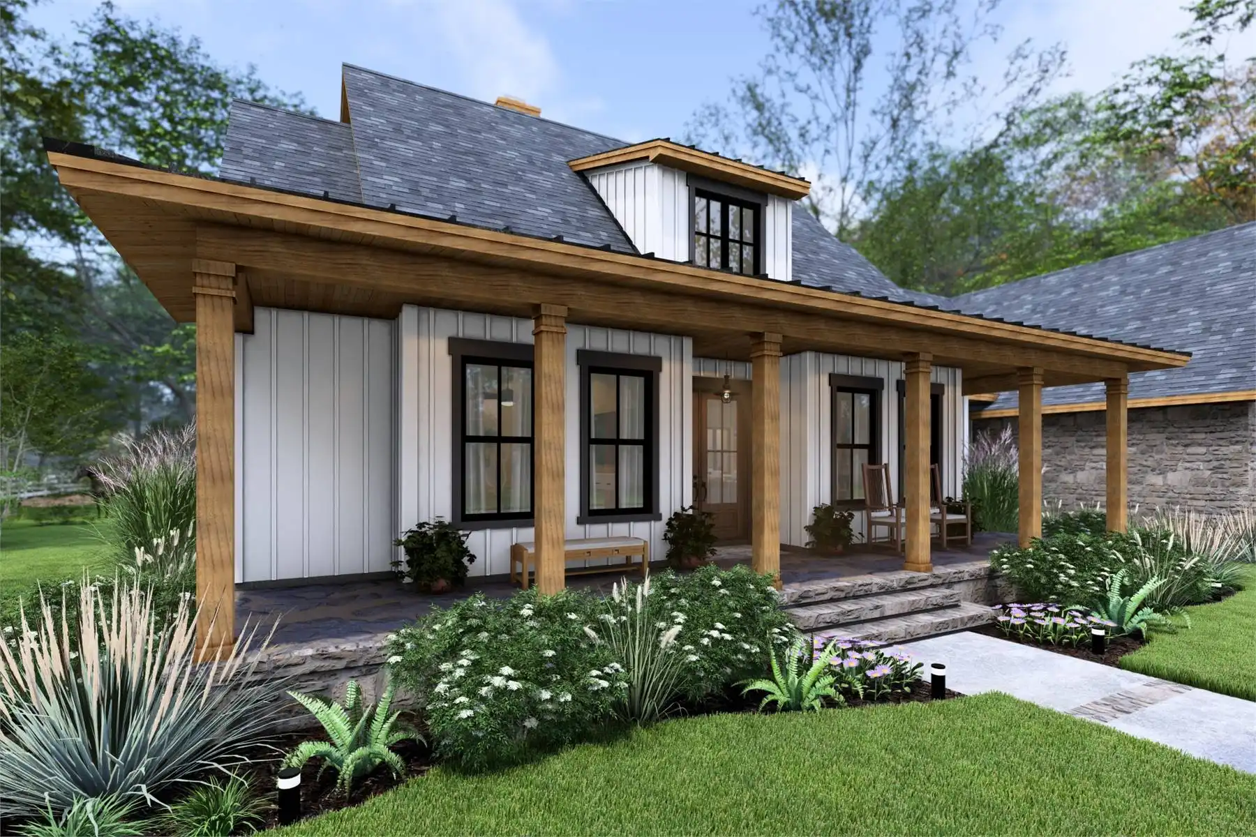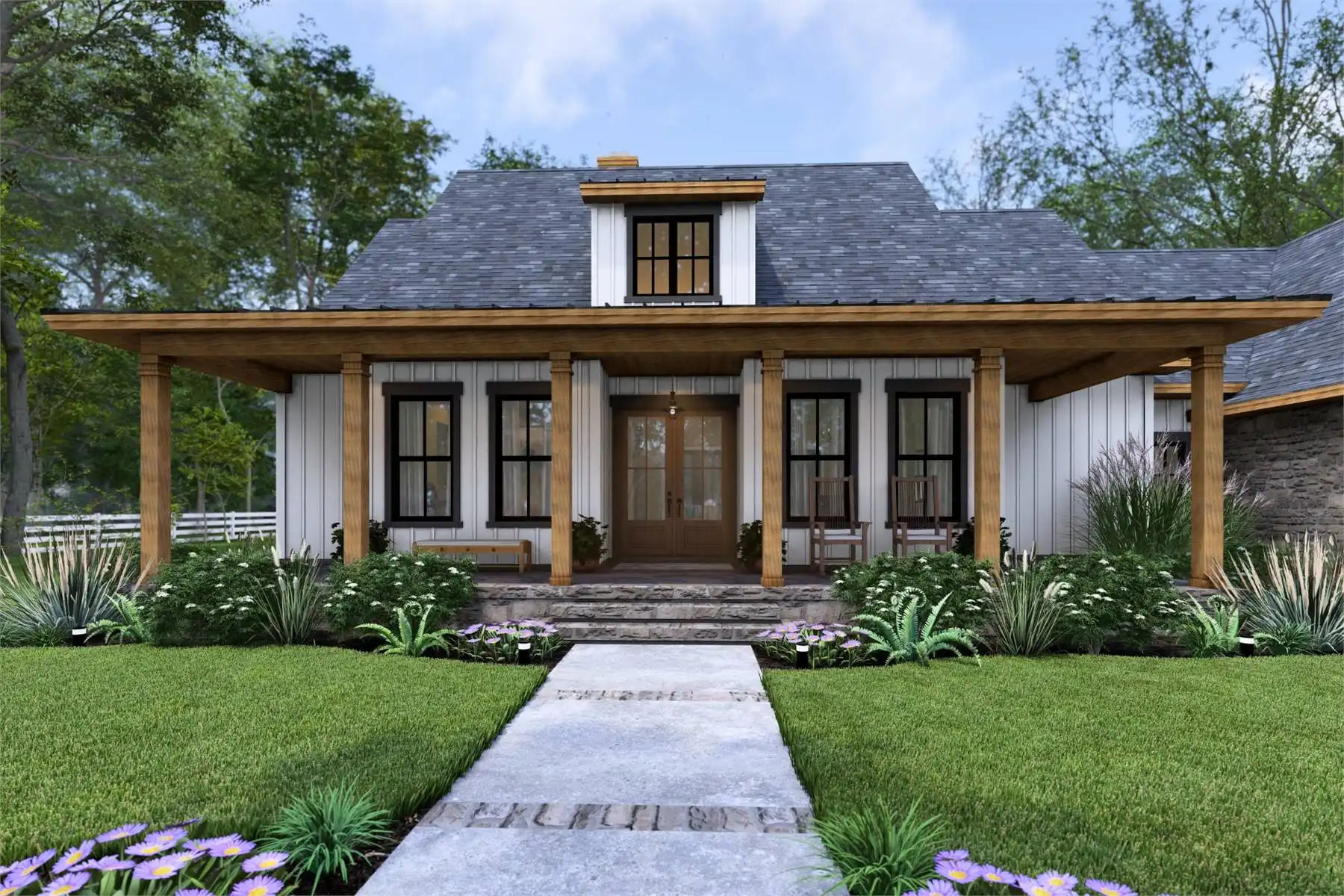 Welcome to House Plan 10187, a beautifully designed 2,093-square-foot home that balances style, comfort, and practicality. This 3 bedroom, 2.5 bathroom layout stands out with its inviting wraparound porch and a trio of bold front windows that boost its curb appeal.