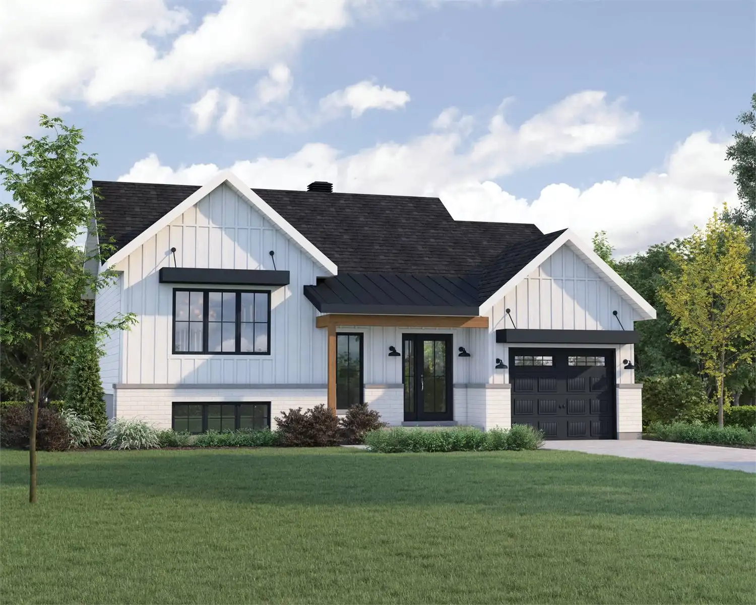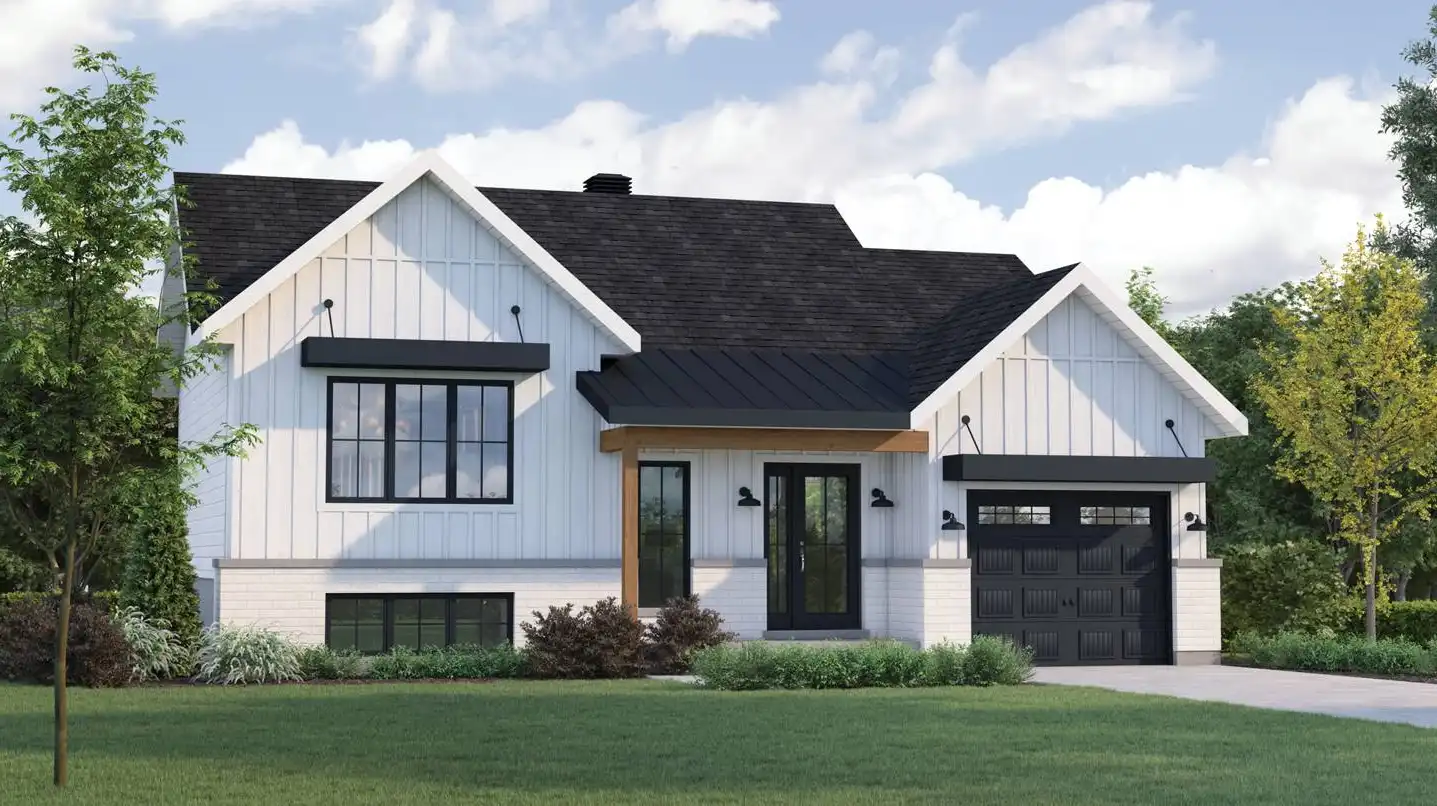 Farmhouses such as House Plan 10190 are always in demand. This bi-level design of 1,734 square feet makes a wonderful choice for a budget and looks chic and modern with its many windows. From the one-car garage, you can access the foyer vestibule directly to enter the main floor. The common spaces are all open concept, with an island kitchen in the corner, living space ahead, and dining to the side. Don't miss the four-person island as well as a walk-in pantry. Finally, the primary bedroom with a walk-through closet to the four-piece bathroom is on this floor. The basement holds the other two bedrooms, a four-piece bath, the family room, and the laundry/mechanical room.