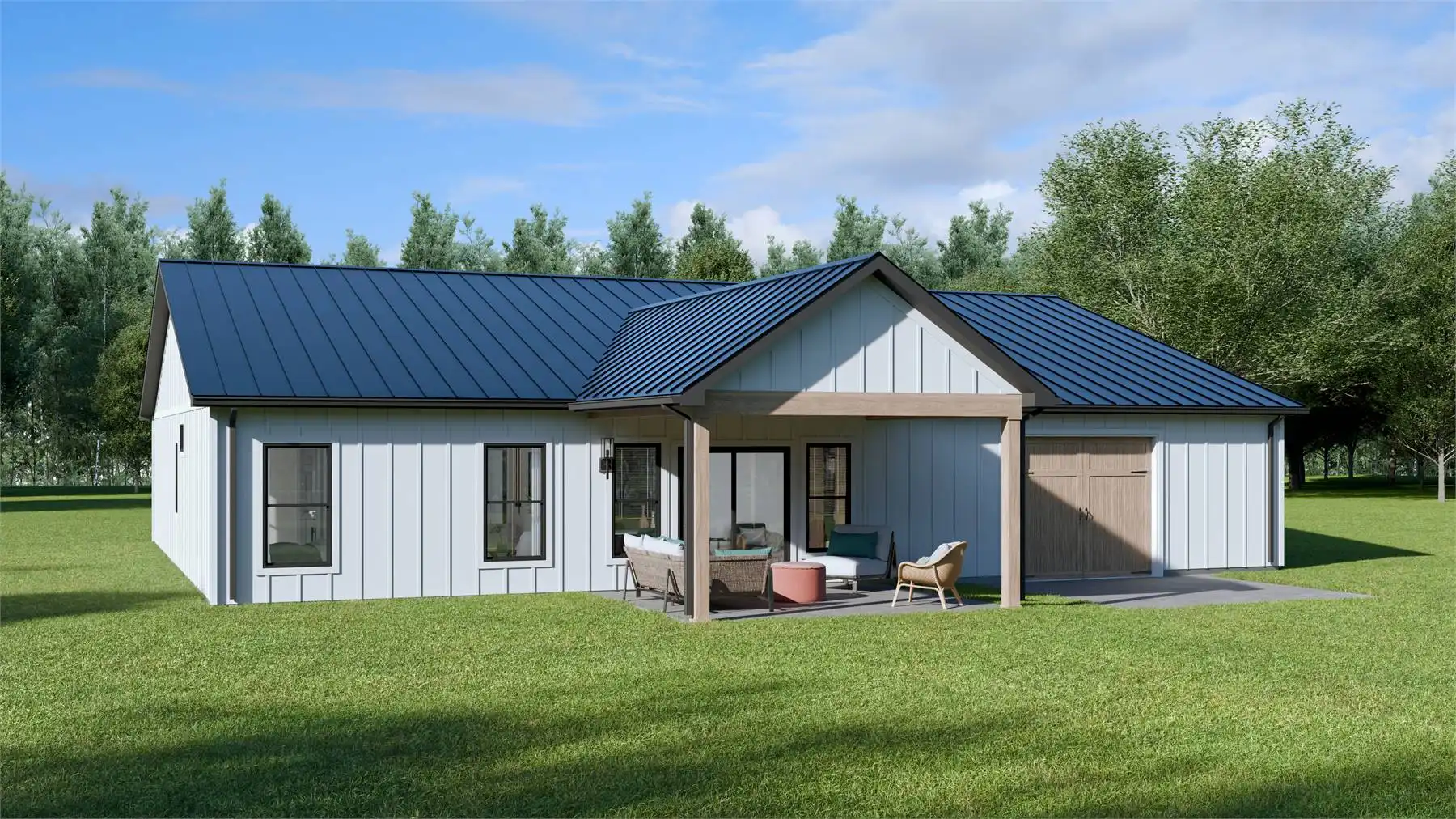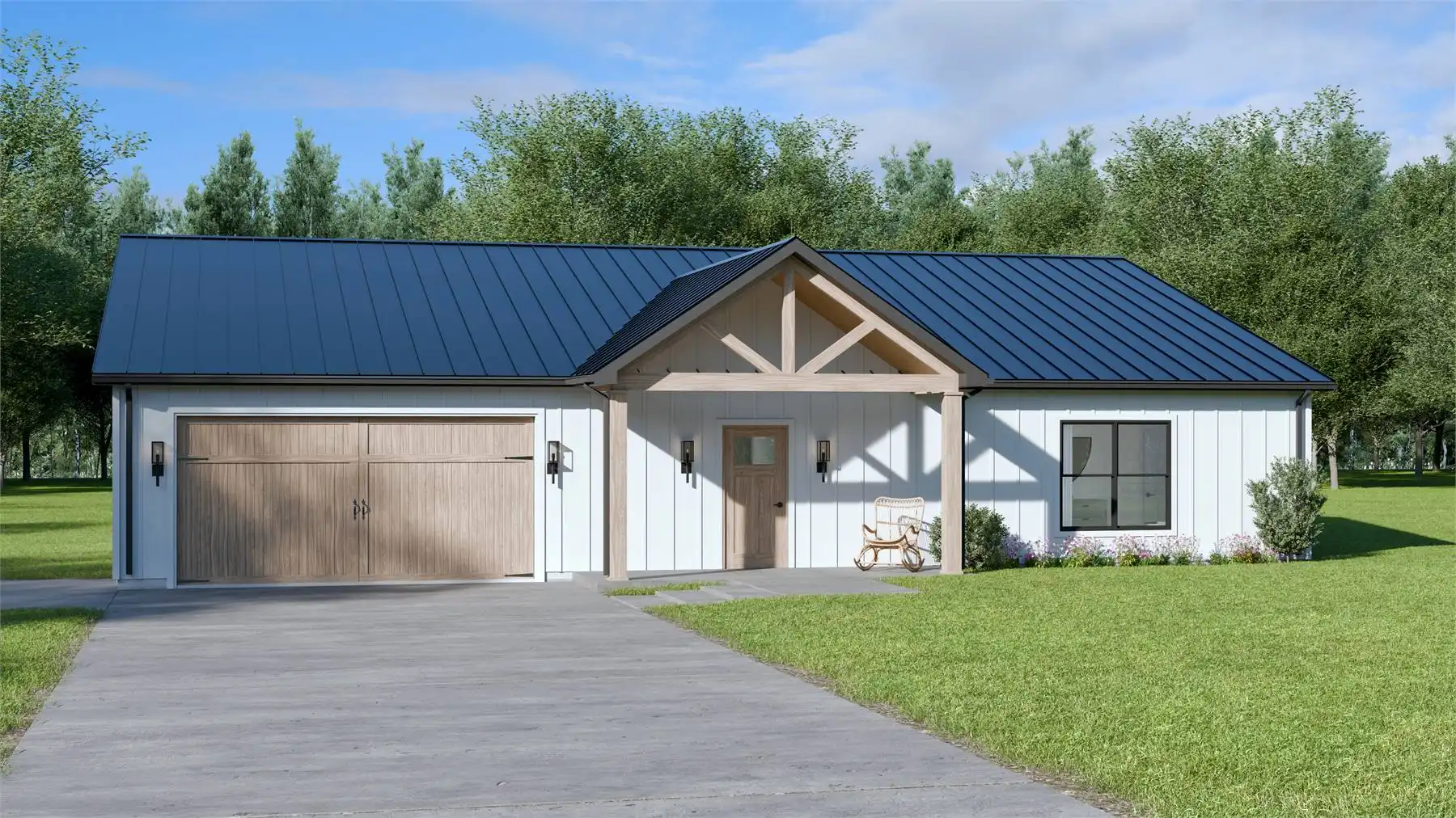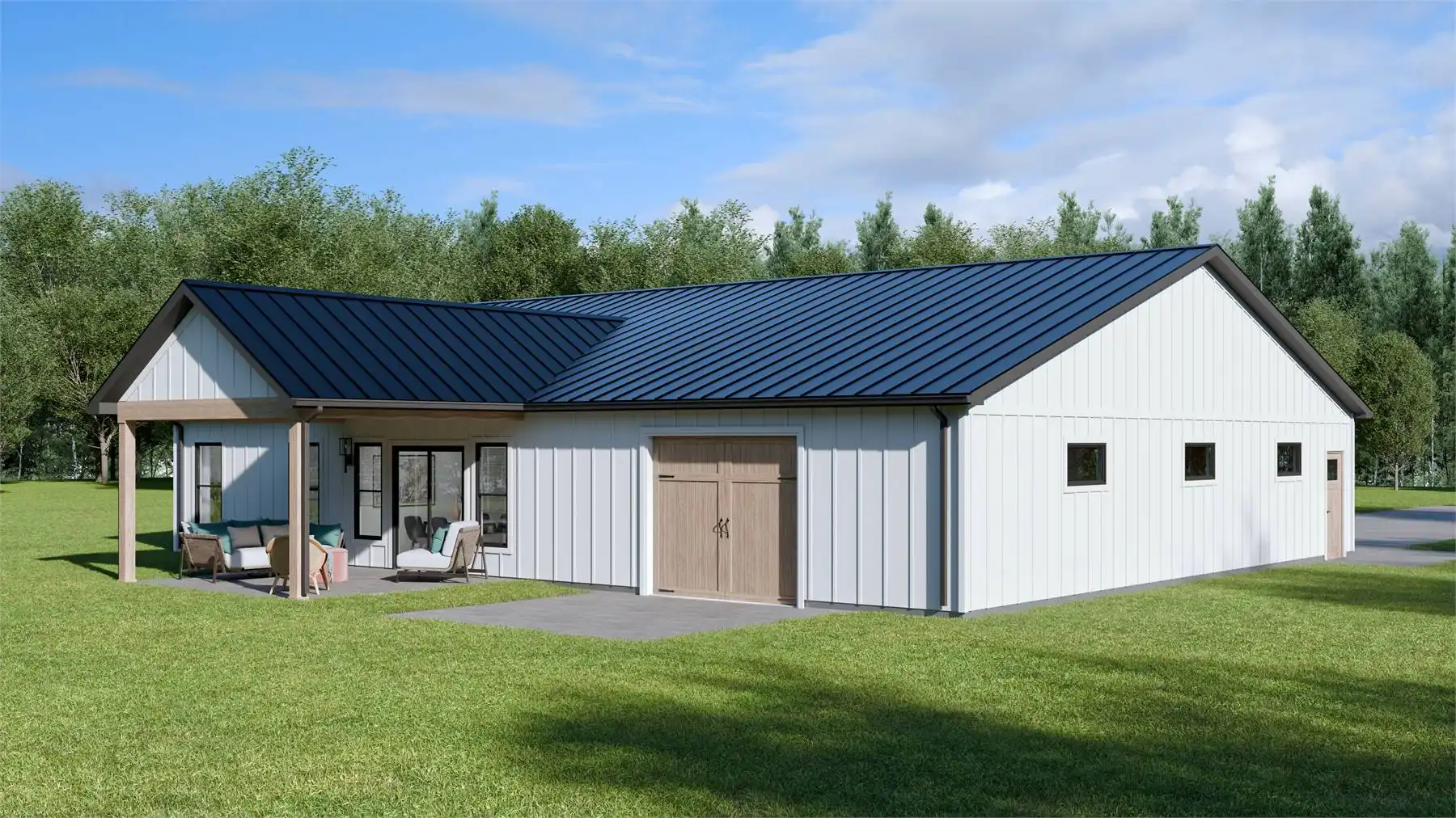 House Plan 10198 is a charming barndominium-style cottage offering 1,538 square feet of living space with 2 bedrooms and 2 baths. Its vaulted open-concept design creates an airy, inviting atmosphere. The 1,242-square-foot garage features a double bay front entry and single bay rear entry, providing space for a workshop or a fourth vehicle. Perfect for full-time living or a weekend retreat, this plan blends comfort and functionality effortlessly.