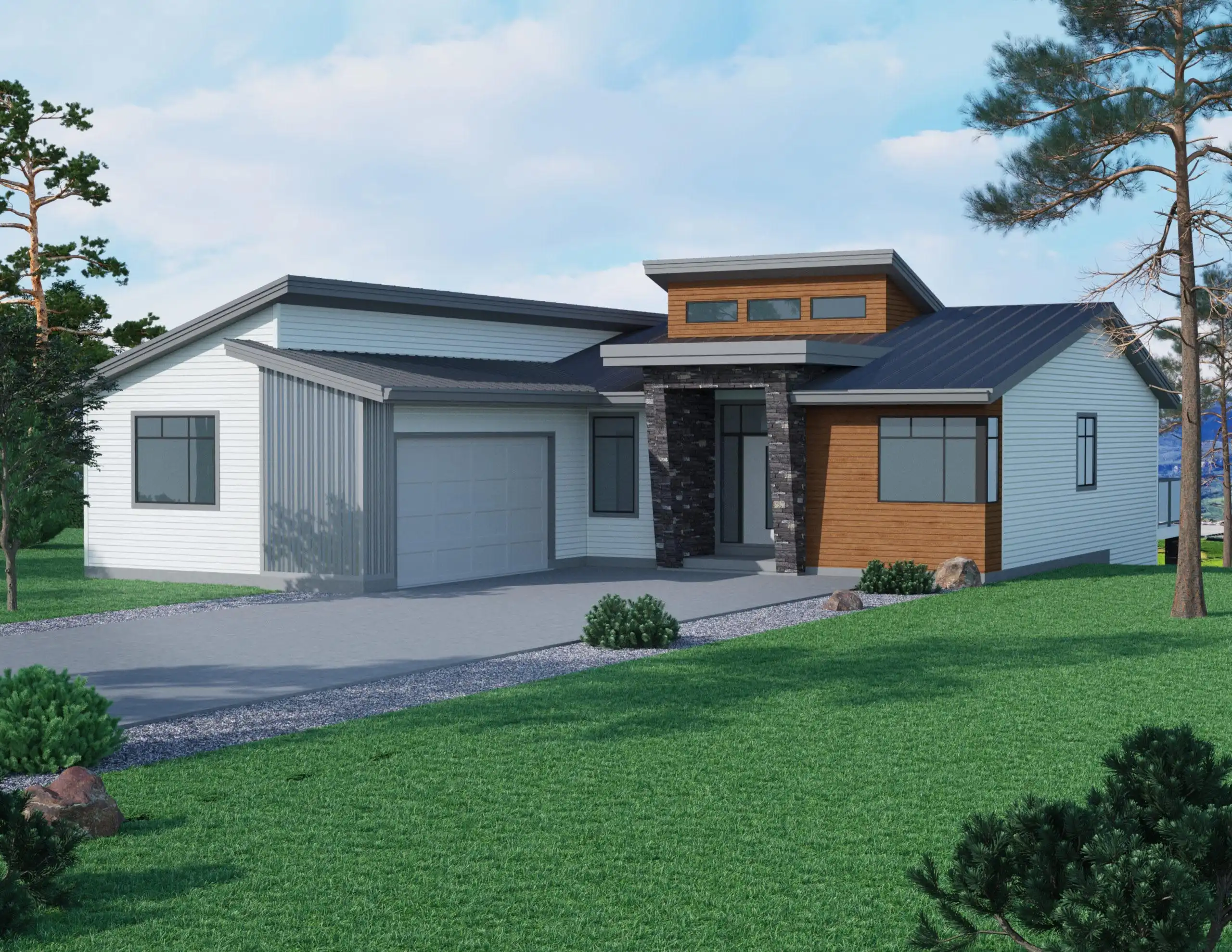 House Plan 10202 is a 1,667 sq. ft. contemporary design that blends comfort, style, and functionality. Its open-concept layout seamlessly connects the great room, kitchen, and dining area, creating a bright and airy space with clerestory windows that bring in natural light. The primary suite offers a spa-like ensuite with a soaker tub and two walk-in closets for ample storage. Two additional bedrooms—including a versatile den/guest room—provide flexibility for any lifestyle. Step outside to enjoy the covered deck and sundeck, perfect for outdoor dining or unwinding. A mudroom with built-in storage, laundry room, and spacious two-car garage add everyday convenience. Plus, the unfinished basement offers plenty of room for customization, whether you envision a home theater, gym, or extra living space.