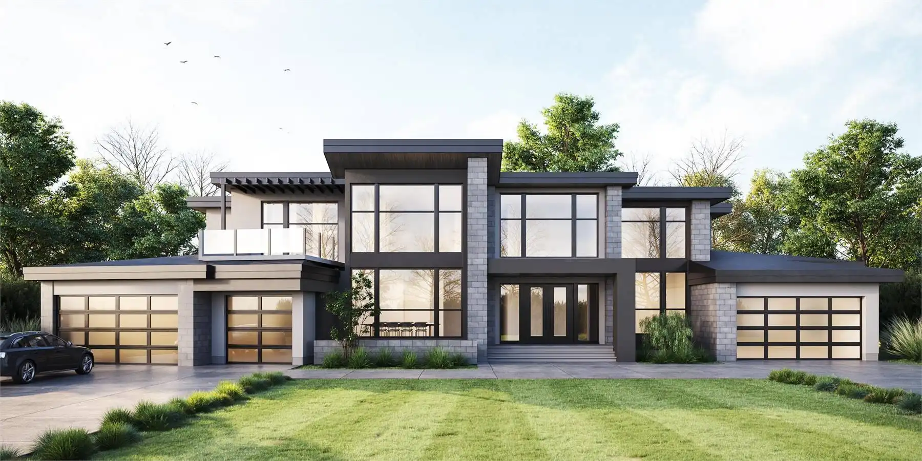 House Plan 10214 is a stunning modern home designed to maximize natural light with its expansive floor to ceiling windows. Spanning 5,500 square feet, the open-concept main level features a spacious great room, a gourmet kitchen with dual islands, a butler’s pantry with a second range and extra storage, a formal dining room, a home office, and a versatile den or guest suite. A slightly angled garage leads to a private gym with a covered patio and powder bath. Upstairs, four bedroom suites provide plenty of space, including a luxurious primary suite with a spa-like bath, a walk-in closet with a dresser island, and direct access to the laundry room. An optional lower level adds 2,218 square feet, offering a lounge with a wet bar, a home theatre, and two additional bedrooms with a shared bath, making House Plan 10214 a perfect blend of modern style and everyday comfort.