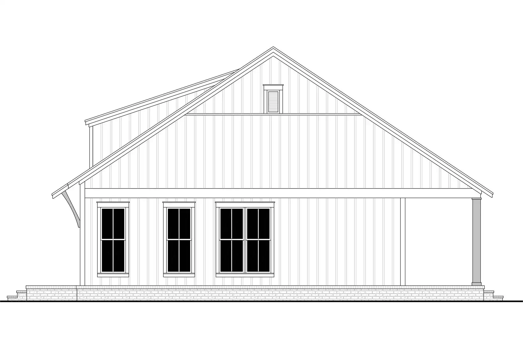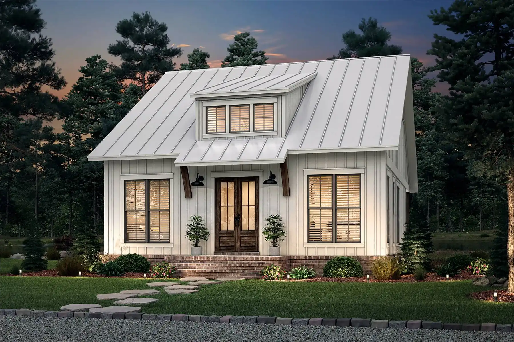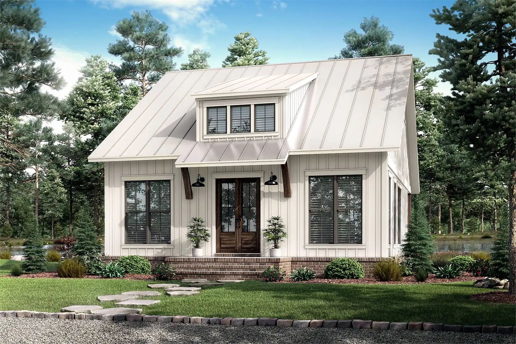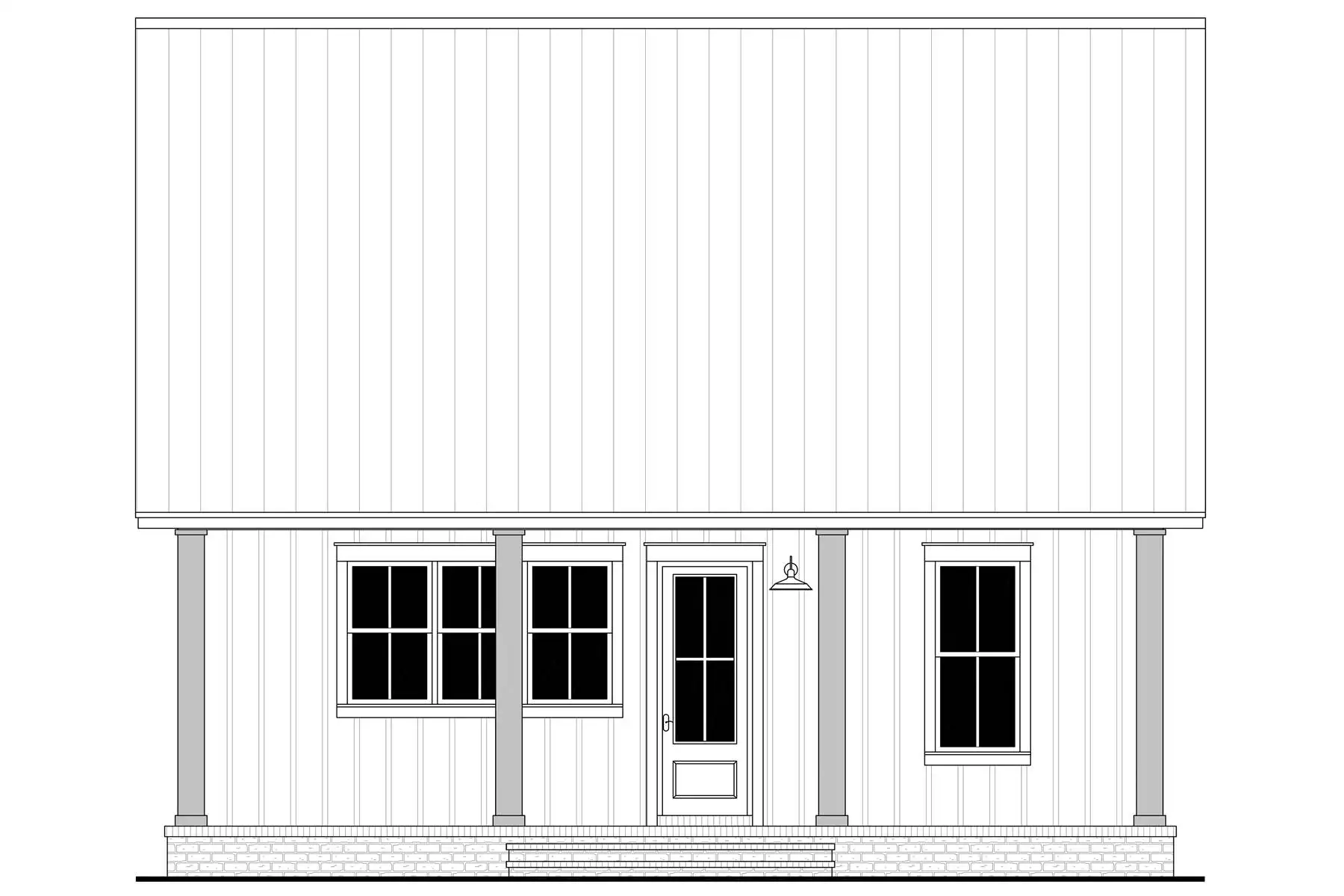 House Plan 10242 is made for vacations with its affordable 1,070-square-foot size with one to two bedrooms! This cottage features totally open-concept living with an island kitchen overlooking the dining and living space. Make sure not to miss the beamed ceiling! The bedrooms include one large bedroom with direct bath access and a smaller bunk room that shares the bathroom from the hallway. Just imagine using this nifty home for family trips or hosting friends at your getaway!