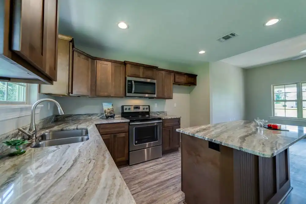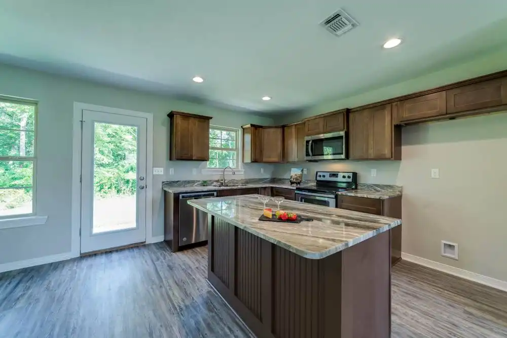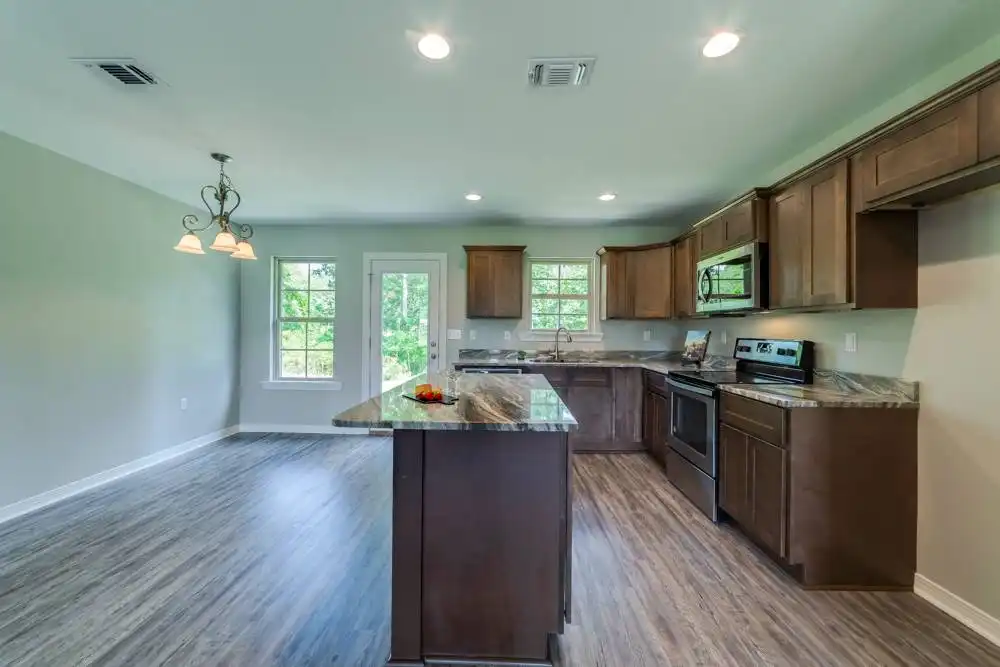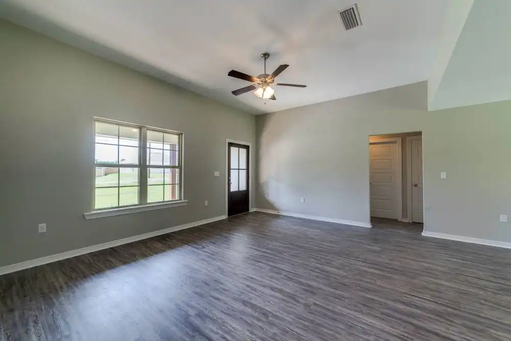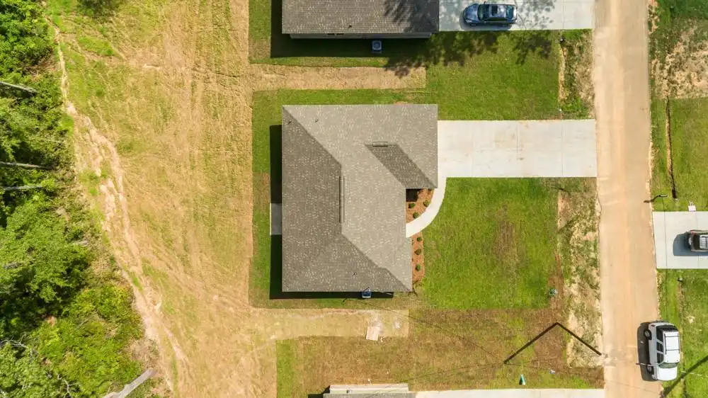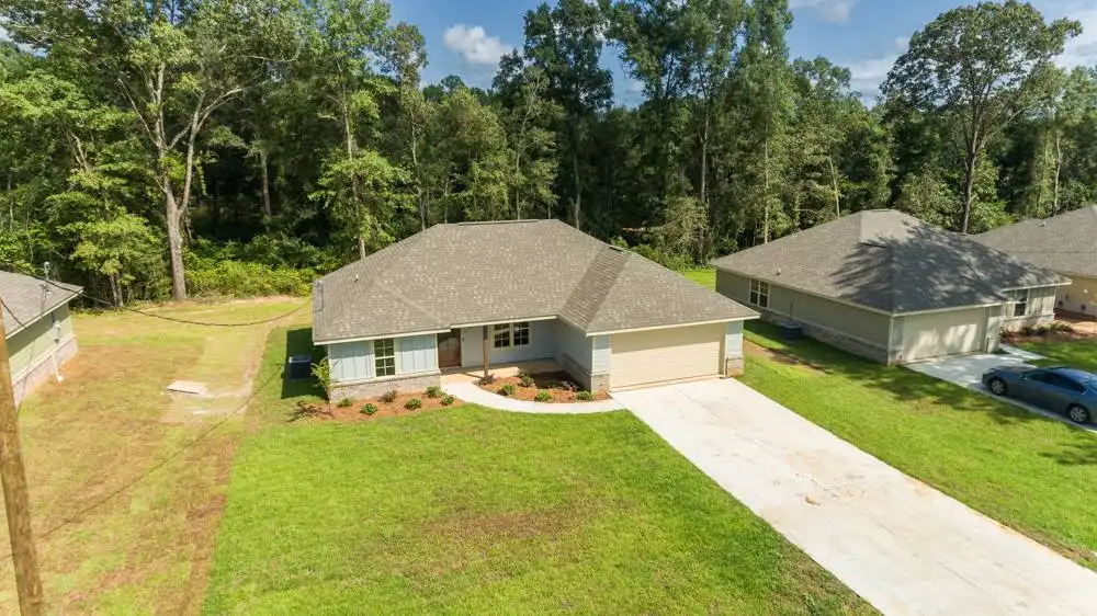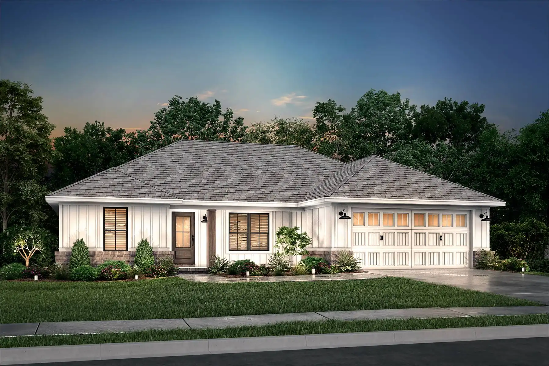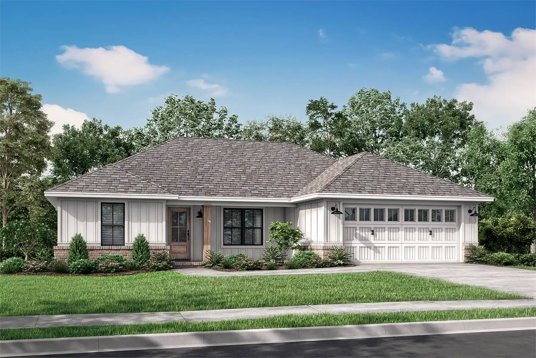 House Plan 10245 is an affordable split-bedroom ranch with 1,232 square feet, three bedrooms, and two bathrooms. The living space is open to the island kitchen and dining area in the middle of the layout while the bedrooms are split across for privacy. The primary suite has a three-piece bath and a walk-in closet while the other bedrooms share a three-piece hall bathroom. The laundry room and a two-car front-entry garage round out the design!