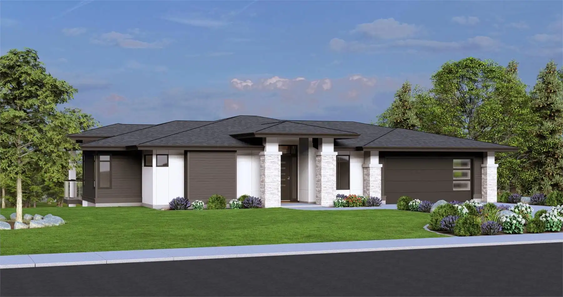 House Plan 10252 is a 1,581-square-foot modern empty nester home designed for comfort and style. This one-story layout features an open floor plan with a great room, L-shaped kitchen with a walk-in pantry, dining area, and a luxurious primary suite with an ensuite, walk-in closet, and access to a covered deck shared with the great room. Additional features include a study, large laundry room, and a two-car garage with space for a workshop. An optional unfinished basement provides room for two future bedrooms, a living area, covered patio, and a full bathroom, making it versatile and practical for guests or extra space.