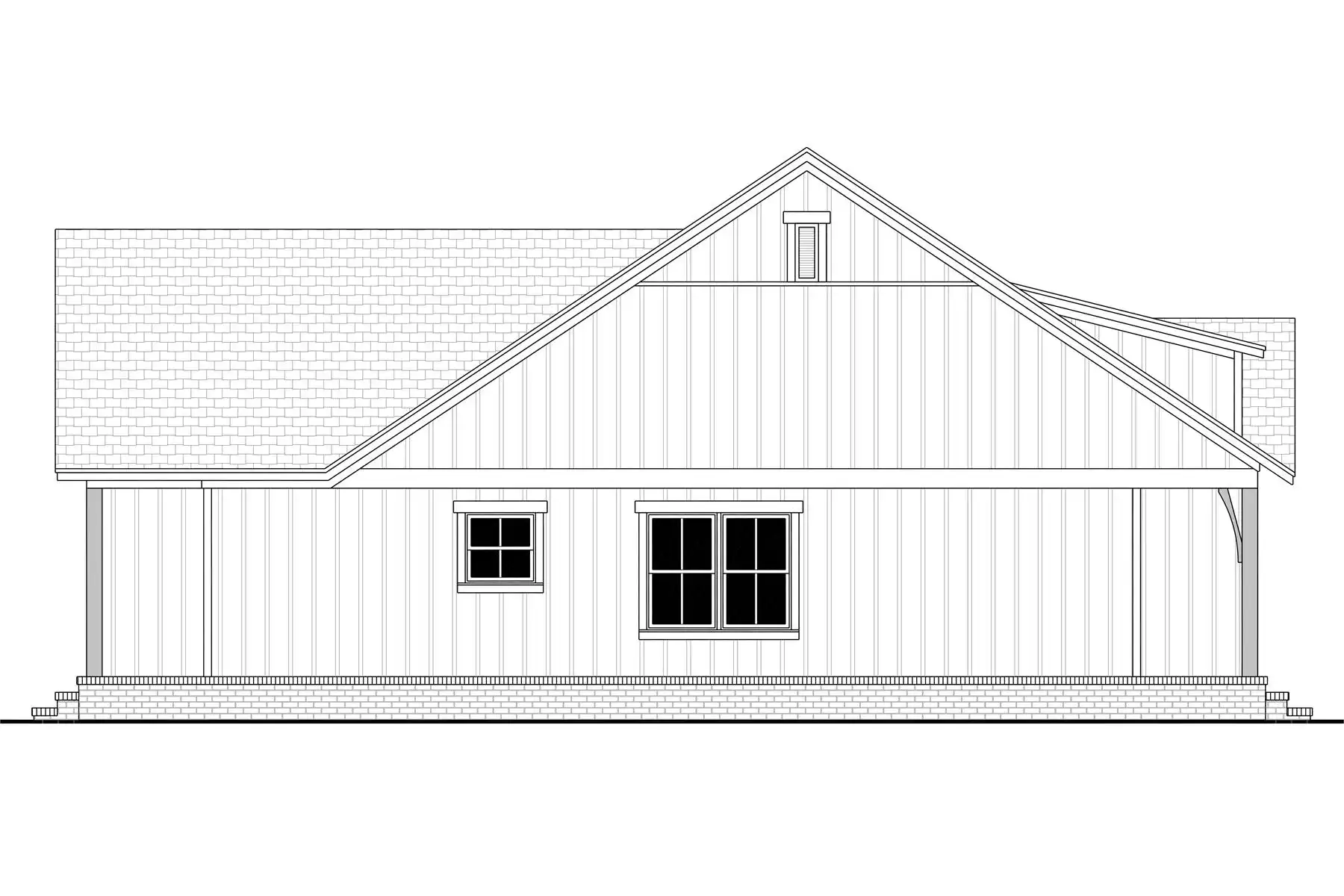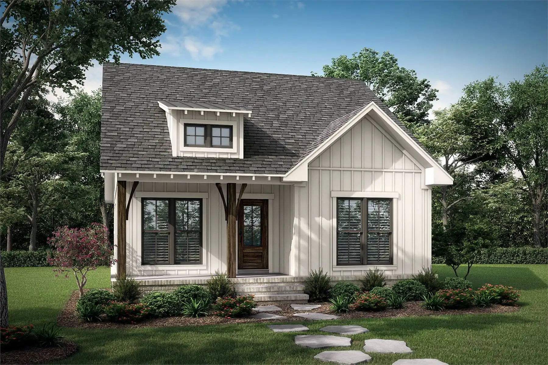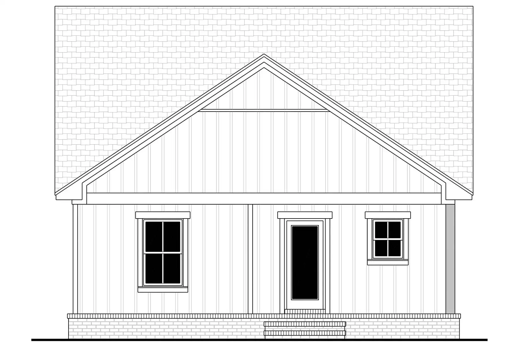 House Plan 10253 is a narrow country cottage with 1,252 square feet, two bedrooms, and two bathrooms on one level. On one side, the open-concept great room lines up the kitchen, dining, and living areas with clear sightlines. On the other, the bedrooms are split in front and back hallways, with the suite in back and a bedroom by a hall bath in front. The laundry room behind the kitchen rounds out this perfectly appointed little home!