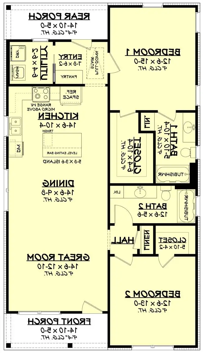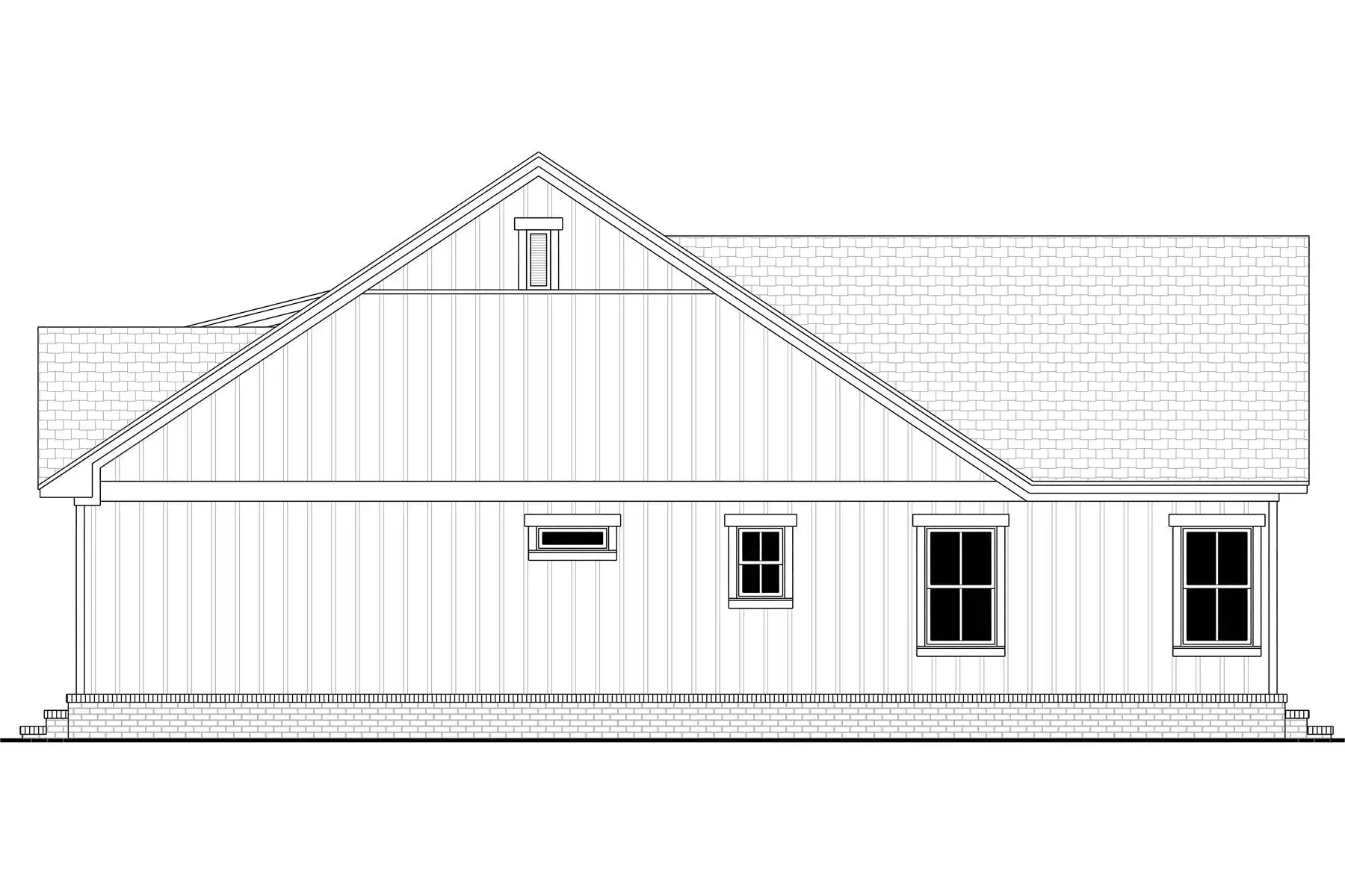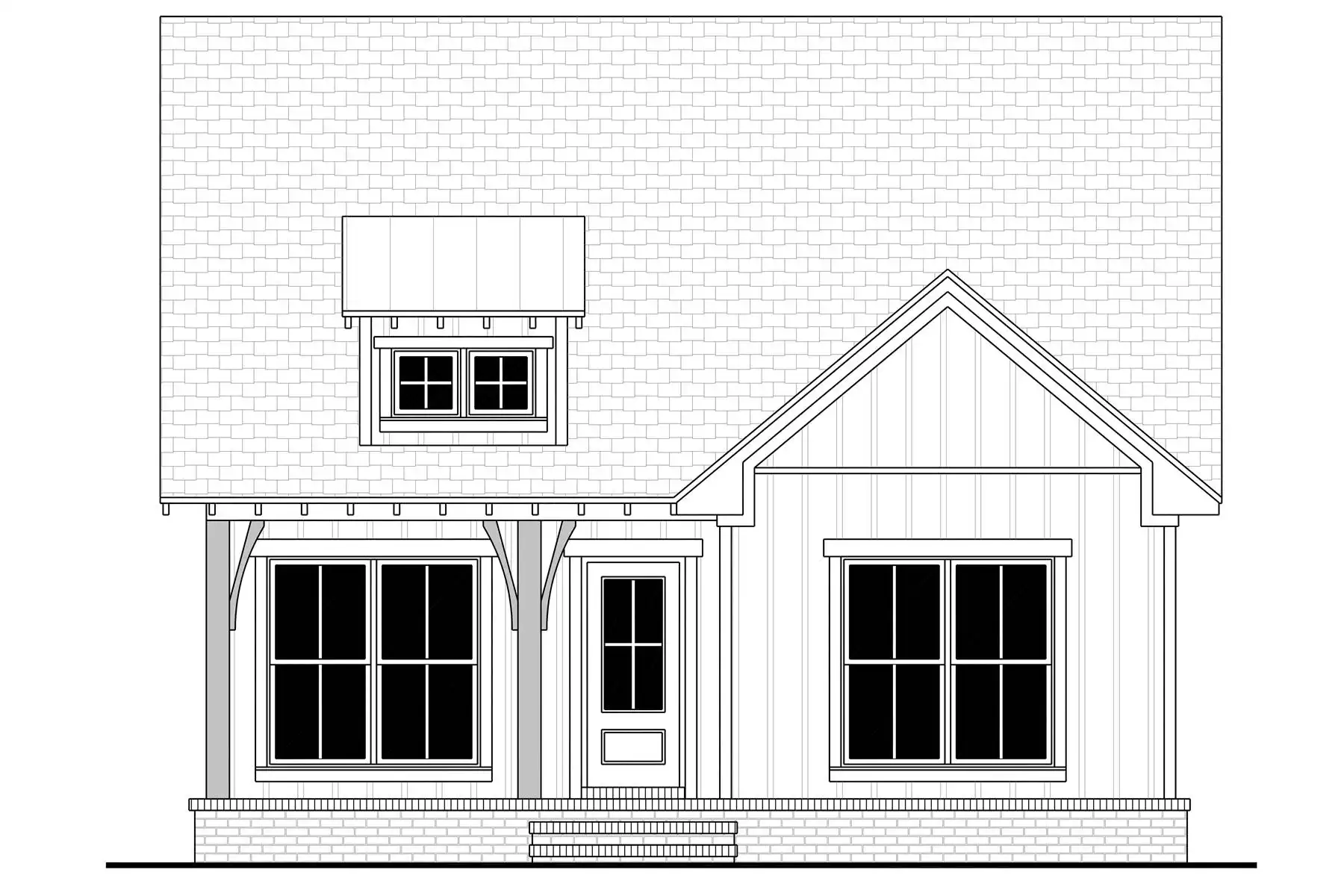 House Plan 10253 is a narrow country cottage with 1,252 square feet, two bedrooms, and two bathrooms on one level. On one side, the open-concept great room lines up the kitchen, dining, and living areas with clear sightlines. On the other, the bedrooms are split in front and back hallways, with the suite in back and a bedroom by a hall bath in front. The laundry room behind the kitchen rounds out this perfectly appointed little home!