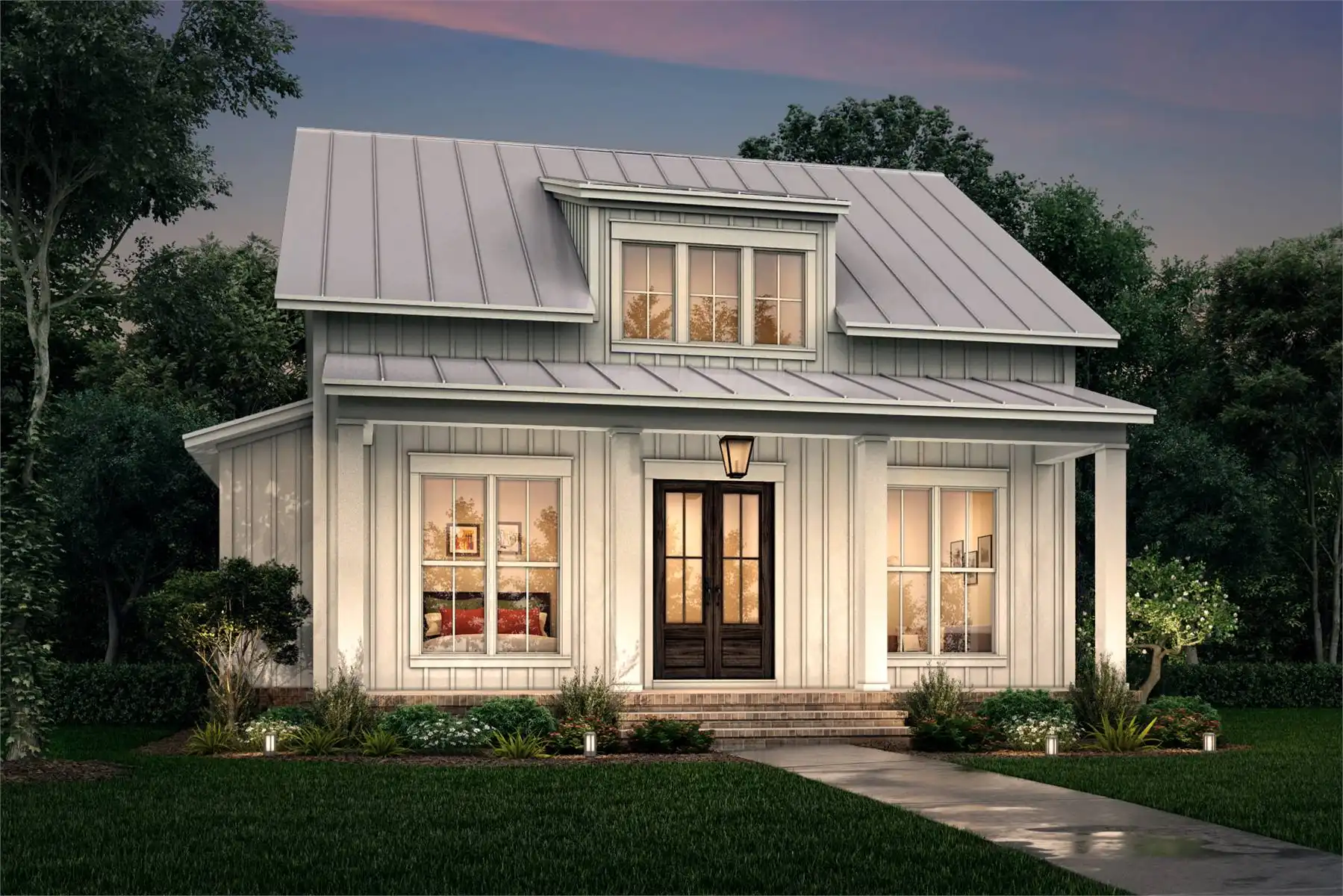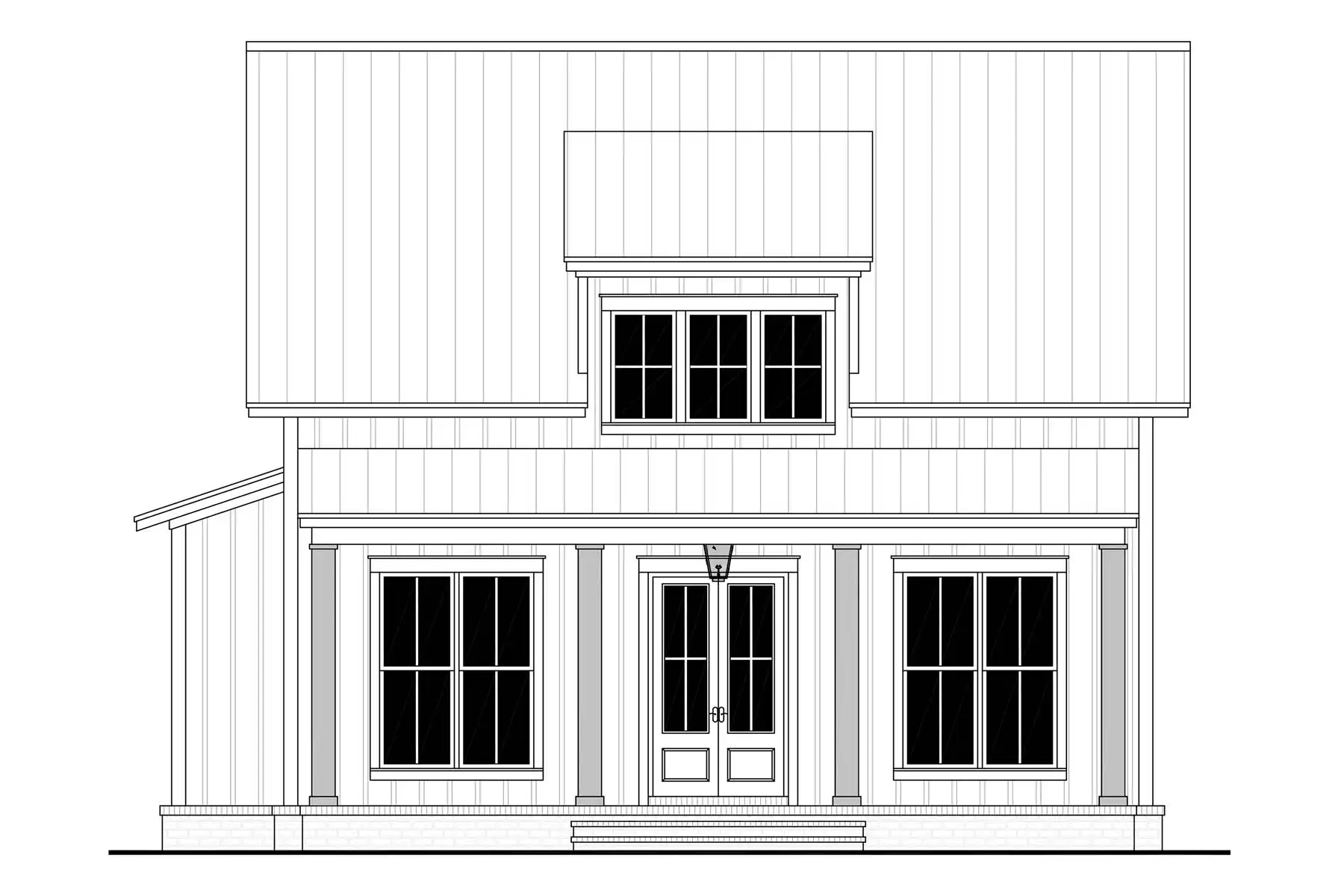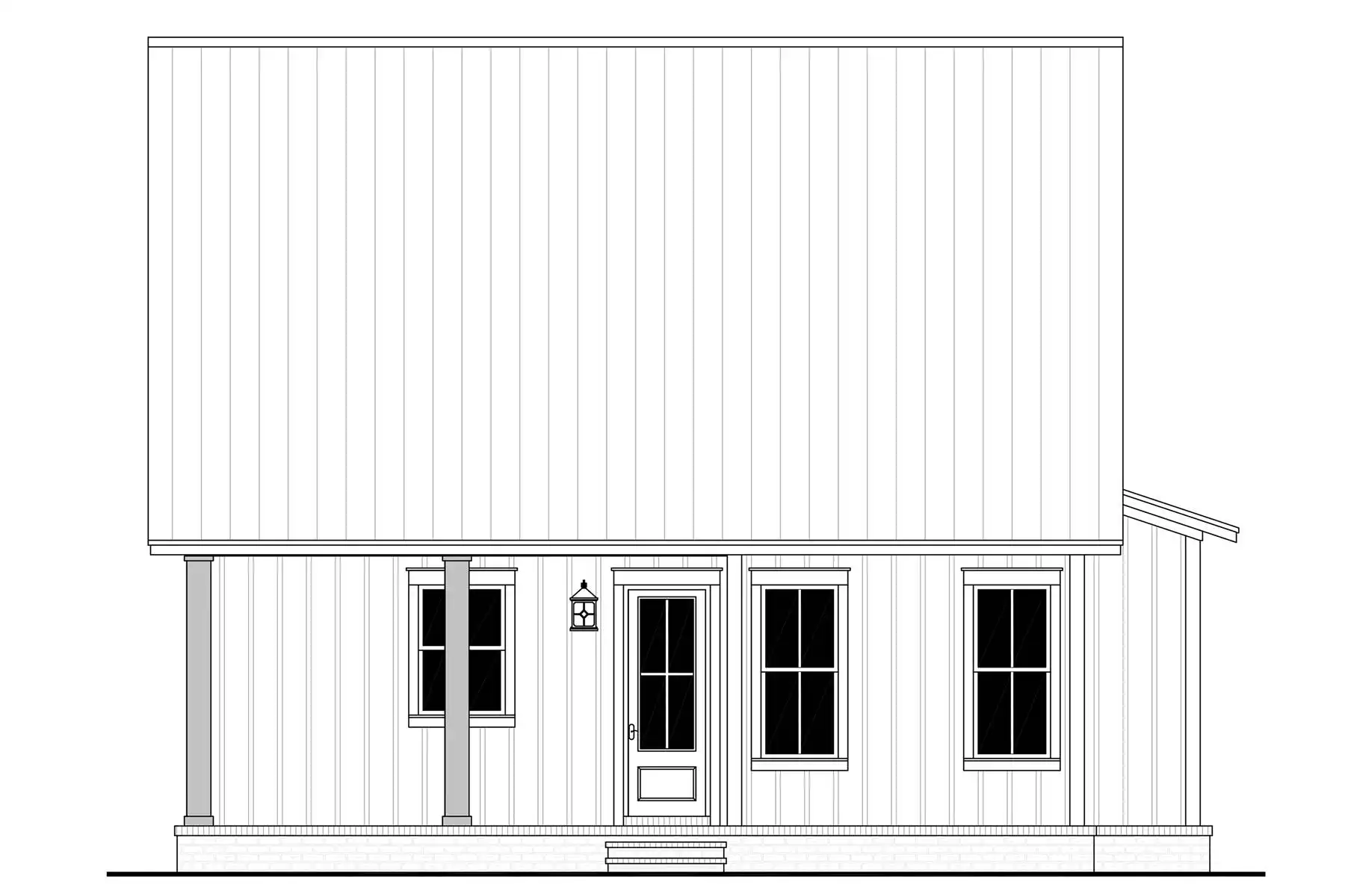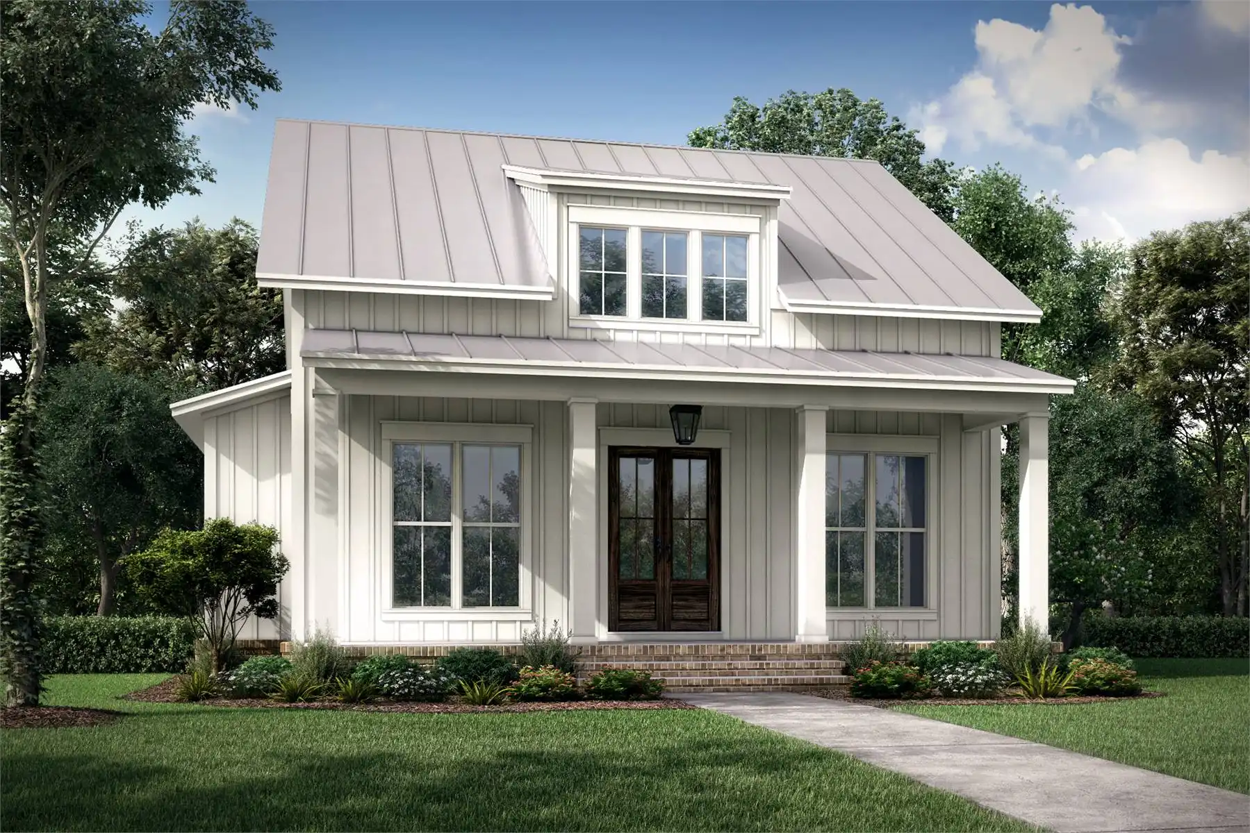 House Plan 10256 is a 1,257 sq. ft. cottage-style home that blends timeless charm with modern efficiency. A welcoming front porch, framed by classic columns and highlighted by a shed dormer, offers a warm first impression. Inside, the open-concept design connects the great room, dining area, and kitchen, creating an effortless flow for everyday living. The kitchen island provides extra prep space, while a walk-in pantry ensures ample storage. At the back, a covered porch extends the living space outdoors, offering a peaceful spot to relax.