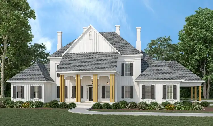 Check out House Plan 10259 if you have luxury needs! This 4,242-square-foot, two-story design offers four bedroom suites as well as a host of additional spaces. The main level includes the luxe primary suite and a guest suite while the final two suites are upstairs for the kids. Don't miss the formal dining room, two-story living, peninsula kitchen, eating nook, study, courtyard, or anything else--you have to see the floor plans to really appreciate what this home has to offer!