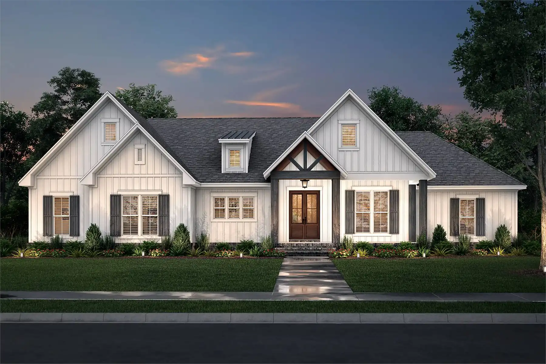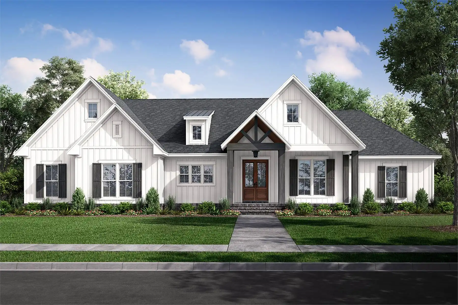 House Plan 10261 is a thoughtfully designed 1,249 sq. ft. home that blends efficiency with modern farmhouse appeal. Featuring 3 bedrooms and 2.5 baths, this layout maximizes space without sacrificing comfort. The open-concept kitchen, dining, and great room create a seamless flow, making it ideal for gatherings and daily living. A vaulted ceiling in the primary suite adds an airy feel, while the ensuite bath with a custom shower provides a private retreat. Smart design touches like a walk-in pantry, built-in lockers, and a dedicated laundry room enhance functionality. Outdoor living is just as inviting with a covered front porch and rear porch, perfect for relaxing in any season. Whether you're starting fresh or downsizing, this home offers a perfect blend of charm and practicality.